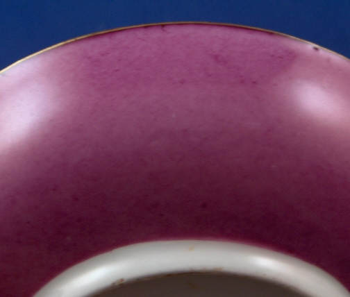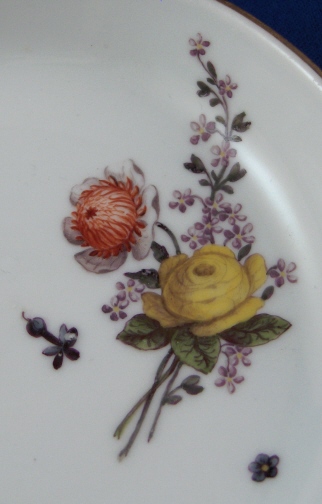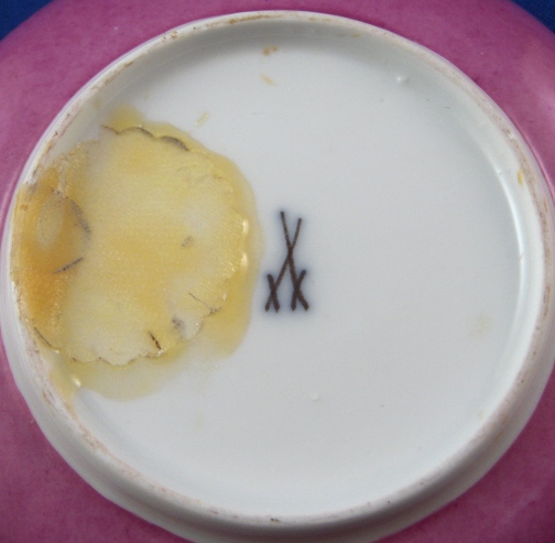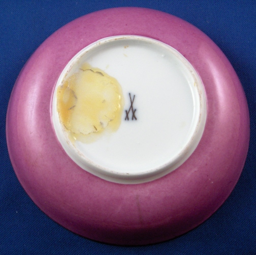 This is an early saucer made by Meissen in about 1750. It is nicely handpainted with one larger floral arrangement on one side with some smaller scattered flowers here and there. Nice gold trim to the edge. The flowers are still show a bit of woodcut influence but are already the Deutsche Blumen style that came afterwards so the piece dates to pretty much 1750 plus or minus 5 years. The rare part of this piece is that underneath it has the purplish ground color which is very nice! The saucer is marked with the straight blue crossed swords underneath. The piece is in perfect condition. The yellow residue underneath is from one of those old hanging stickers which is gone but the glue remains. The saucer is 1 inch tall and 4.625 inches in diameter. Please email me for more information or other pictures.