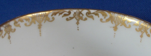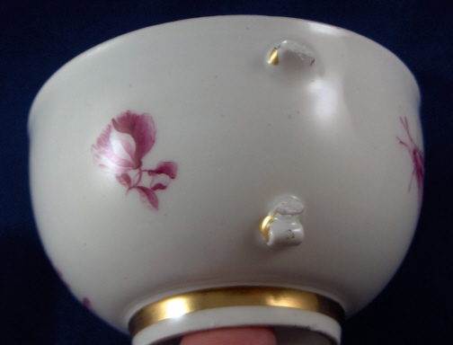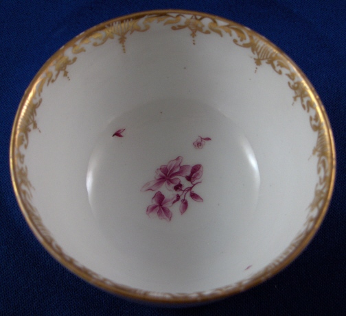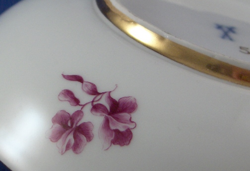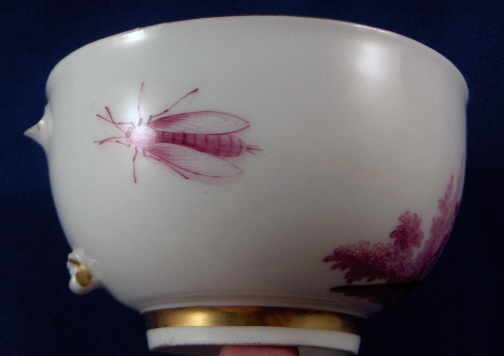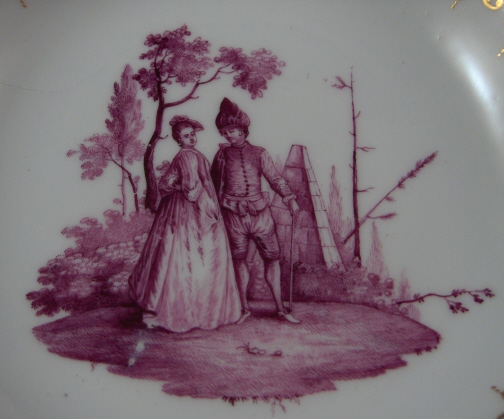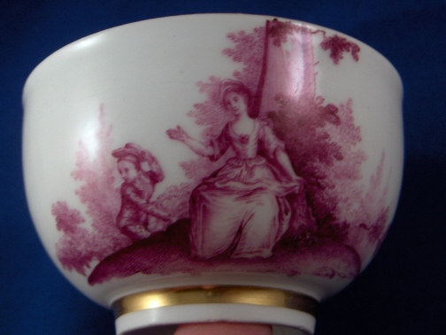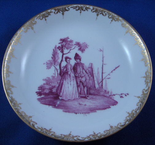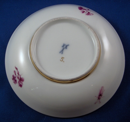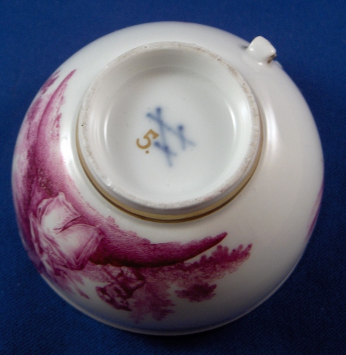 This is a second early cup and saucer made by Meissen in about 1740. Both the cup and saucer have a handpainted scene of lovers on them. The saucer has a couple taking a stroll through the park in the center while the cup has a lady with a kid approaching her on the front . There are also a bug and a smaller flower on the cup and the rims of the two have a superb fancy gold trim. Then there is a flower in the bottom inside of the cup. The bugs have the shadow painted with them that was only used for a few years during this time period. Johann Gottfried Klinger was the painter generally associated with this type of shadow painting I believe. The saucer also has two flowers and a bug painted on the underside as well as a gold trim. The flowers and bugs are painted in the woodcut style. This dates the set around 1740. Amazingly the set is in good condition with no wear to the gilding to speak off but there is a spot of wear on the scrne in the saucer well to the bottom left. And the handle of the cup is missing. When displayed it's not that noticable since the scene is in the front and that hides the handle area. The saucer is about 1 inch tall and 5.25 inches in diameter. The cup is 1.875 inch tall and 3.125 inches in diameter. Both pieces are marked with the underglaze blue crossed swords mark from this period as well as a gilders number 5. Please email me for more information or other pictures.