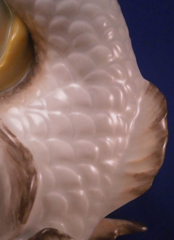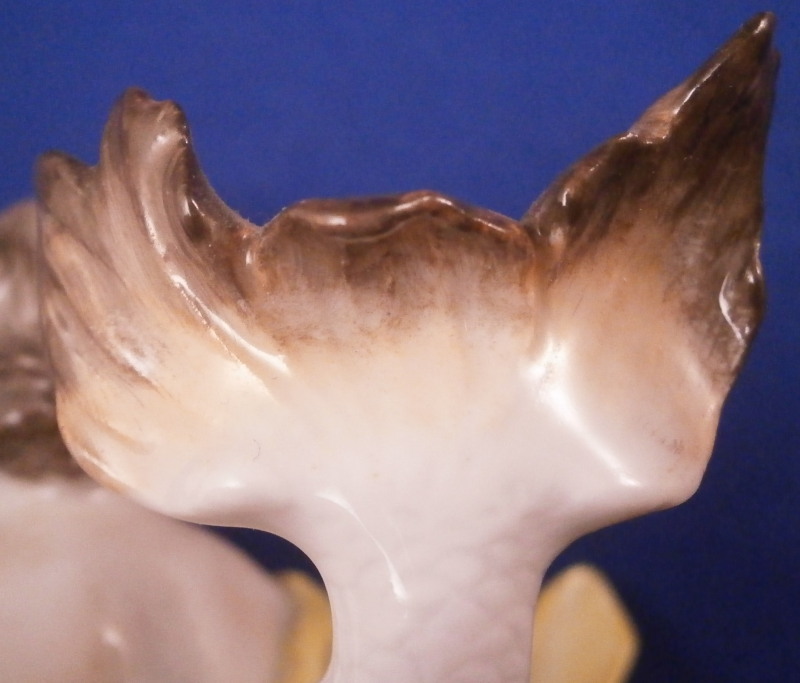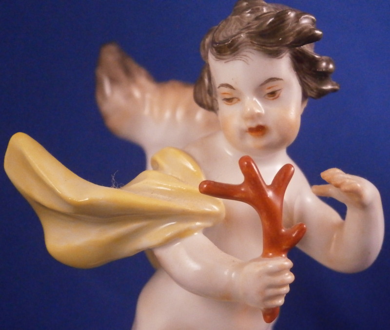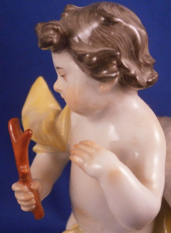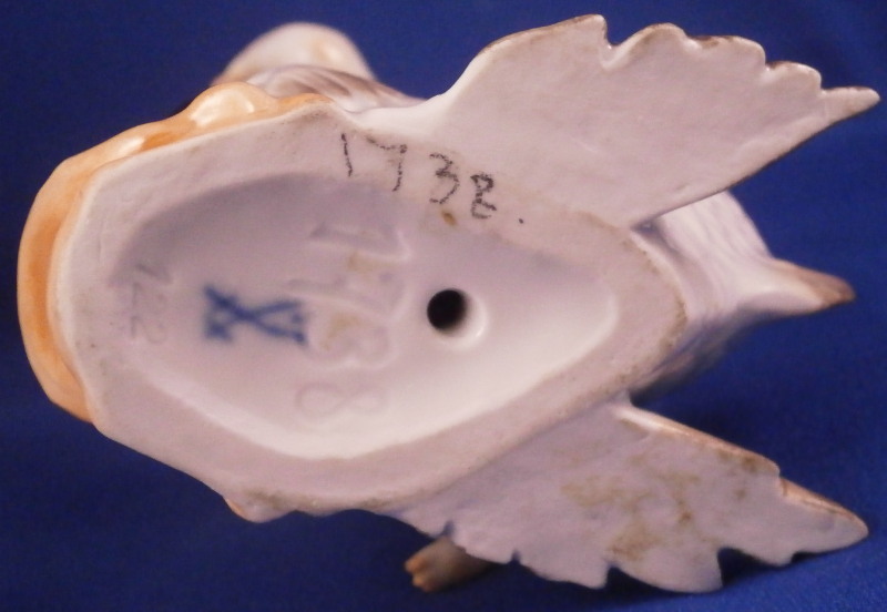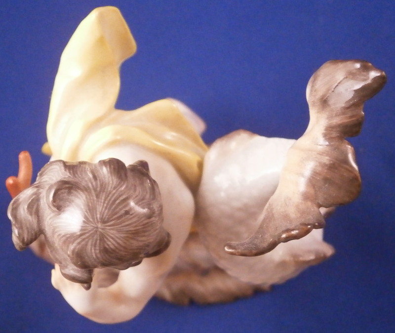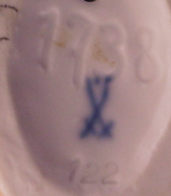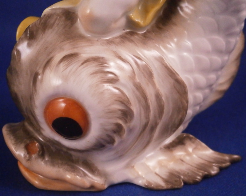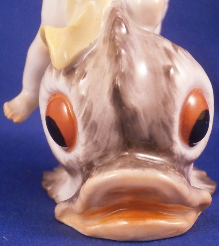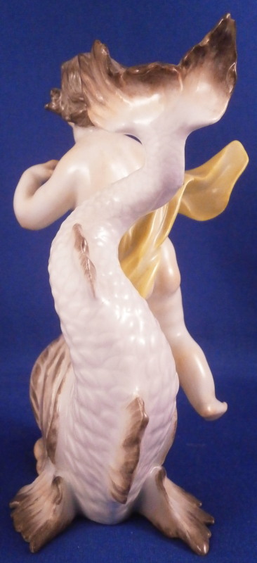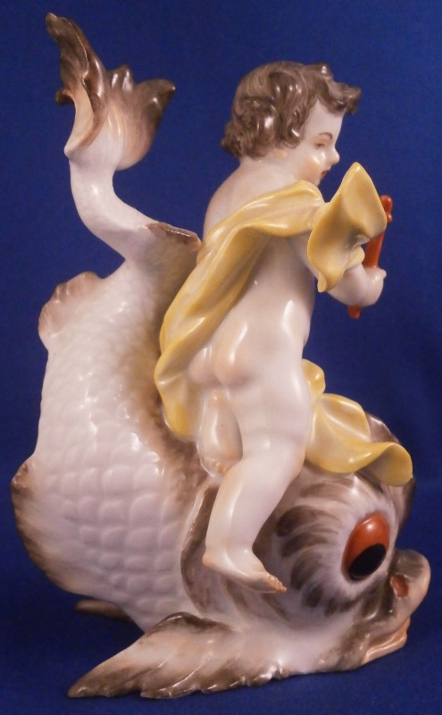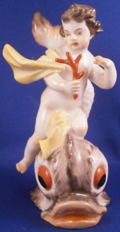This is a really fun figurine of a putto riding a dolphin made by Meissen during the Pfeiffer period of the 20th century so it is almost a true antique now :) Definitely based on an 18th century model by the look of that great dolphin! The putto is mostly nude but strategically covered with a yellow cloth. It is holding a piece of red corral in its hand as if playing catch with the dolphin kind of like a dog with a stick. An amazingly modeld piece and a very hard to find model! Amazingly it is in perfect condtion! The figure is 4.5 inches tall, 2.25 inches wide and 3 inches long. The figure is marked with the under glaze blue crossed swords mark underneath the base as well as the usual impressed numbers, etc. of the period as shown. Please email me for more information or other pictures.