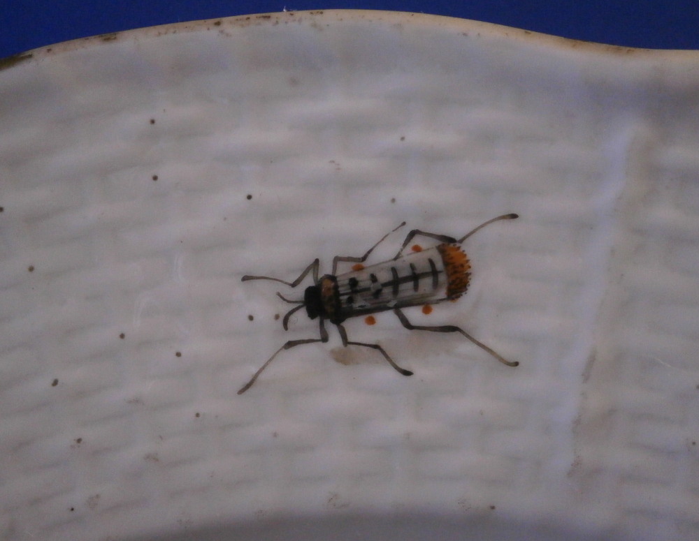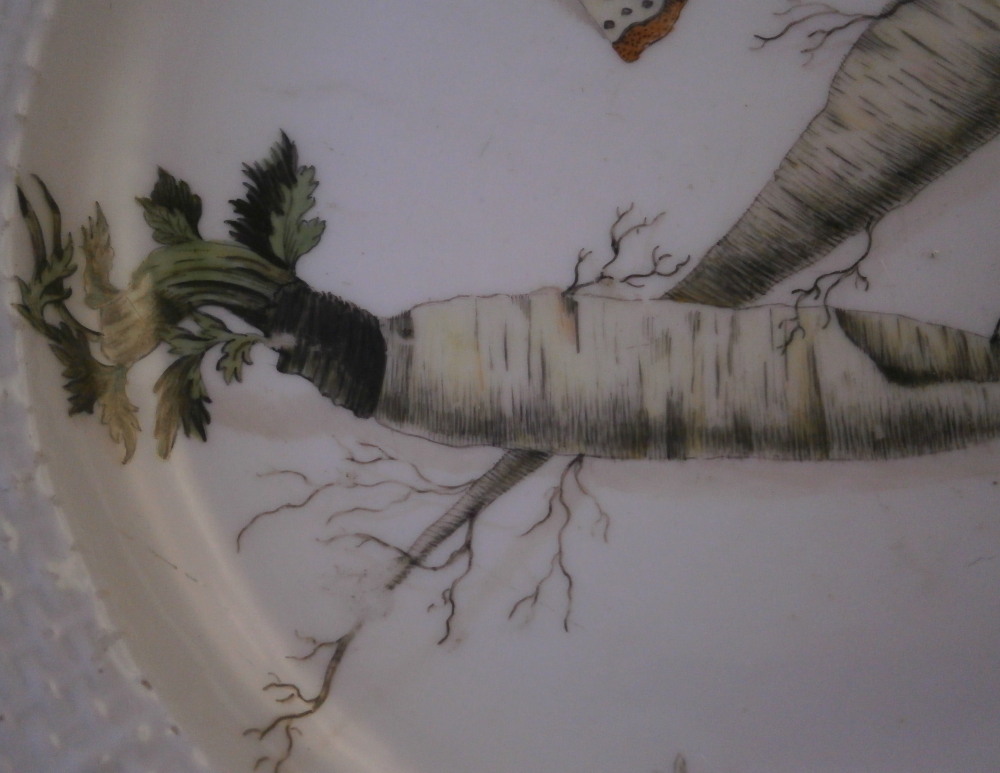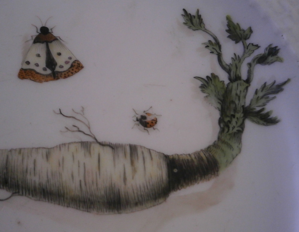 This is an early and superb plate made by Meissen in about 1740. The edge has a nice shape to it with a gold trim, the rim has a basketweave relief design to the paste and three bugs including their shadows. But the best part is the design in the center - two large white raddishes as well as a nice moth or butterfly and three more small bugs. All have their shadows painted with them which is rare. I never had a vegetable design piece with the shadows and this piece looks stunning! Very special and hard to find anything like this. This style of painting is often attributed to Klinger as a painter which is probably more of a myth since as far as I know only one signed piece is known by him and it was not shaded. Either way the bugs and the apple are of a very nice quality and the shade makes them seem lifelike on the white background. The plate is in superb condition with wear to the gold trim on the edge. The small bugs in the well have wear since they were painted on high points (flaws to the paste) and there is a bit of stacking wear to the raddishes though it is pretty minor. Some manufacturing imperfections common to these early ware but it displays great and looks amazing! The plate is 1.5 inches tall and 8.75 inches in diameter. The piece is marked with the under glaze blue crossed swords mark underneath as well as an impressed number which surprised me a bit as I though it might be a touch earlier but this dates it to right around 1740. Please email me for more information or other pictures.