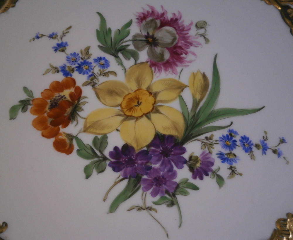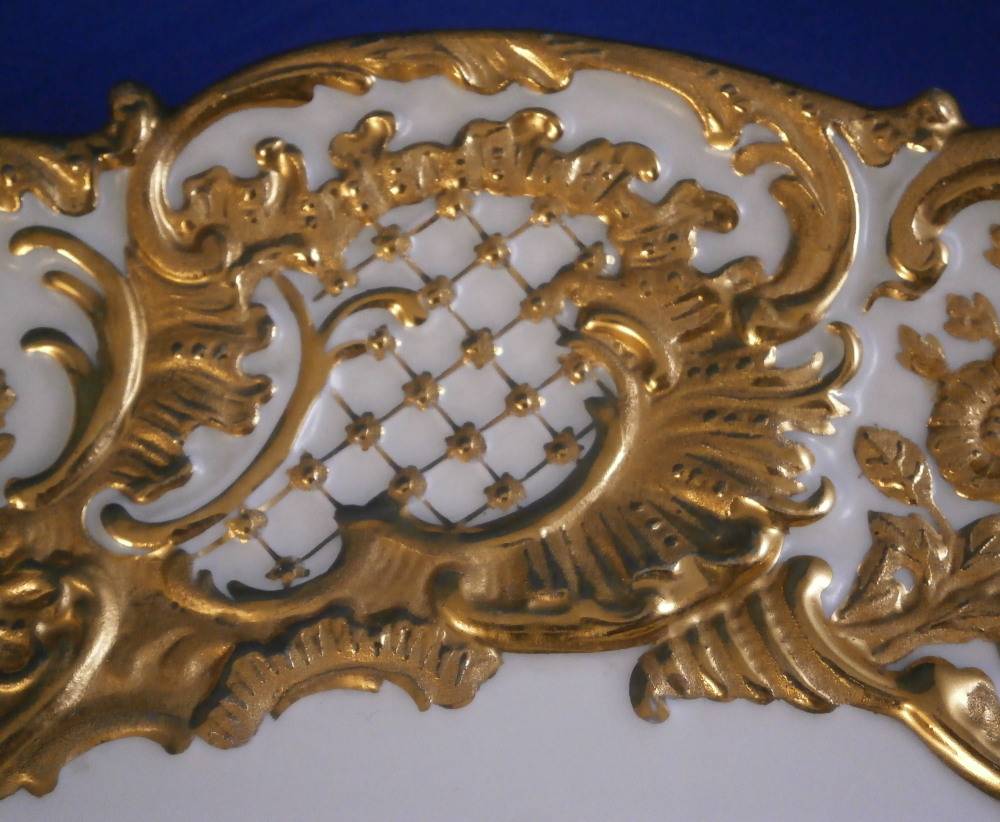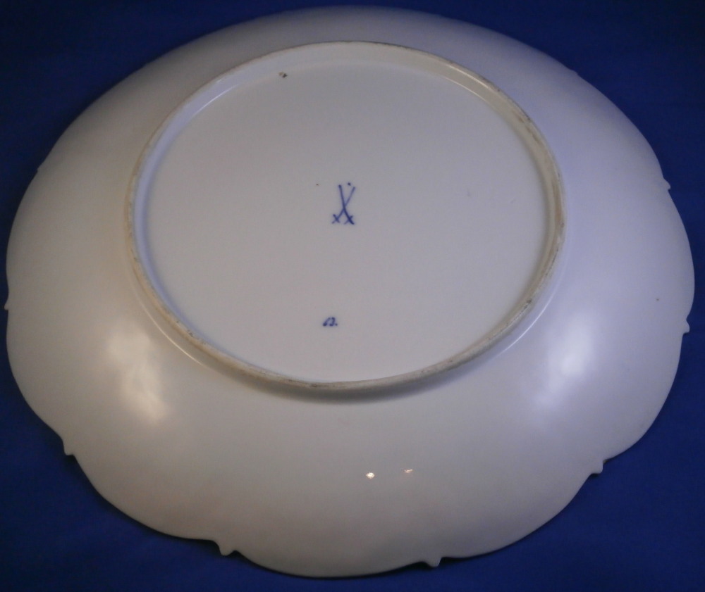 This is a really nice large display plate / charger made by Meissen during the Pfeiffer period of the earlier 20th century. This size in this design is not something you see often at all. The piece is decorated relief design around the rim of alternating panels of flowers and a trellise design all highlighted with some amazing gilding. Nice edge shape as well. The gold design in combination with the polychrome floral arrangement in the center makes this piece look amazing and elegant. The piece is in perfect condition and first choice. The dish is marked underneath with the under glaze blue swords mark with the dot between the tops as well as the usual impressed and painter's marks as shown. The plate is 1.375 inches tall and 11.5 inches in diameter. So a really nice large example! Please email me for more information or other pictures.