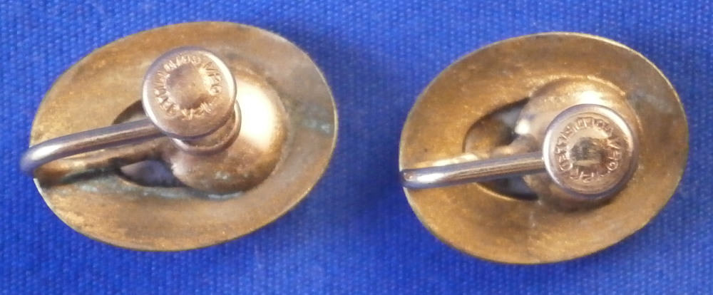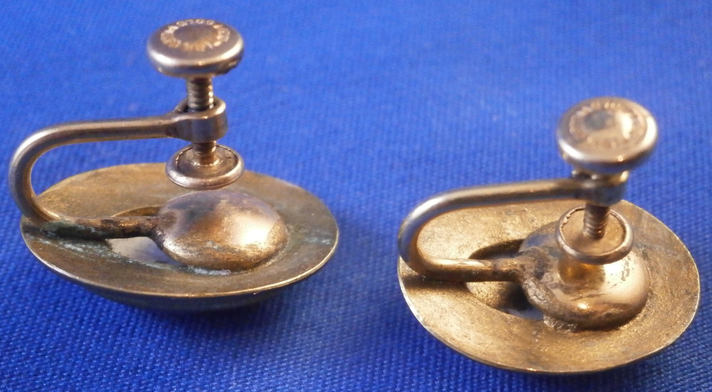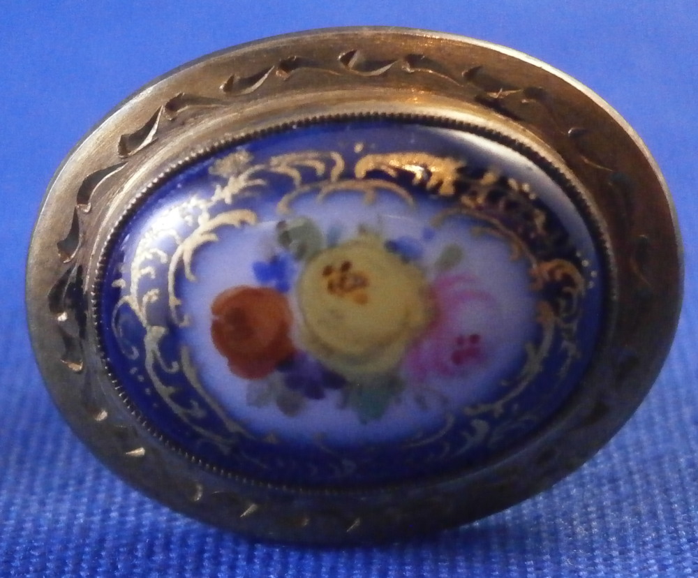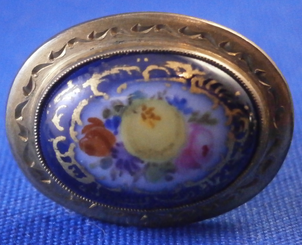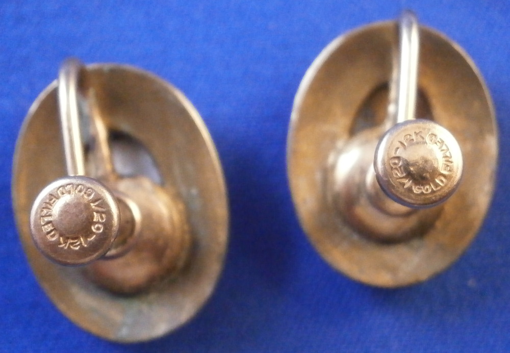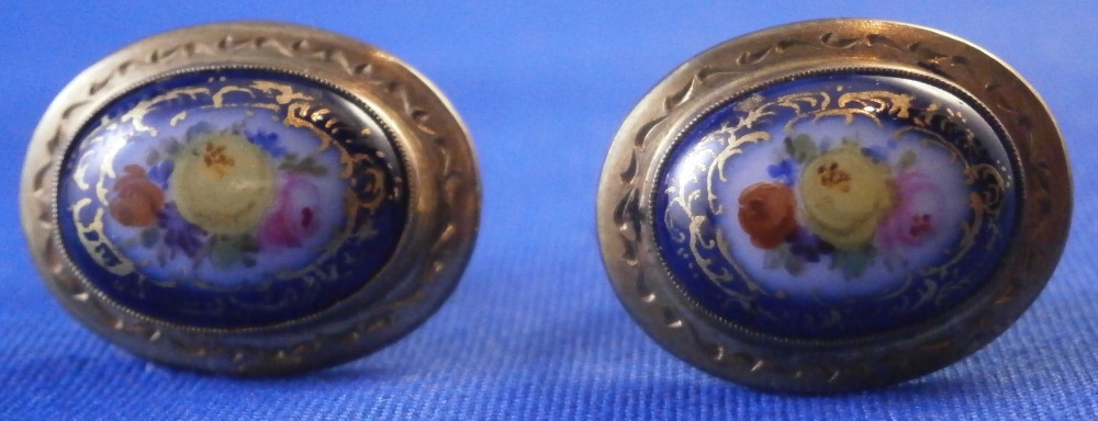 This is a very rare set of earrings made by Meissen in the 19th century. The center of each one has an oval porcelain medallion that is hand painted with that superb cobalt blue ground color with some fancy gilding and a really nice polychrome floral arrangement on white ground in the center. The porcelain piece is mounted in 12K gold filled mounts with a nice design to the sides. These are the old school screw on earrings which is really neat. You can wear them even if your ears are not pierced! The porcelain piece is not visibly marked underneath since it is hidden by the mounts. You can see a touch of the tips of the swords in one of them. No question as to who made them looking at the porcelain! The mounts are marked at the top of the screw as shown - 12K Gold Filled and 20V or W. Each ear ring is just over 0.5 inches wide, just under 0.75 inches tall and the entire contraption is 0.625 inches deep. The part that shows is just over 0.125 inches thick. The pair is in great condition with a little wear to the gold trim as shown. Slight oxidation to the metal. They display very well and look super elegant. I have rarely ever seen a set like it and never a cobalt blue version so it is a special for sure. Please email me for more information or other pictures.