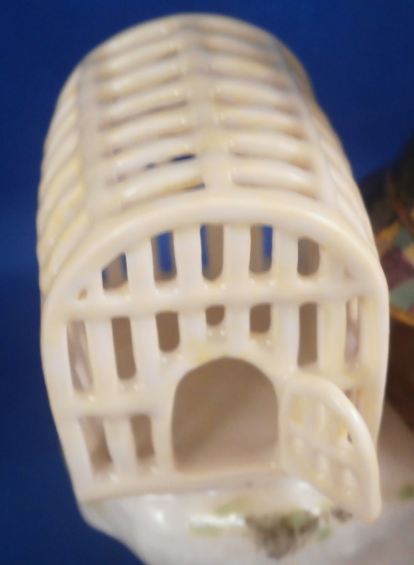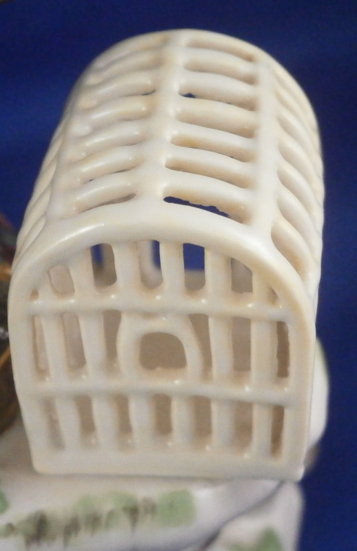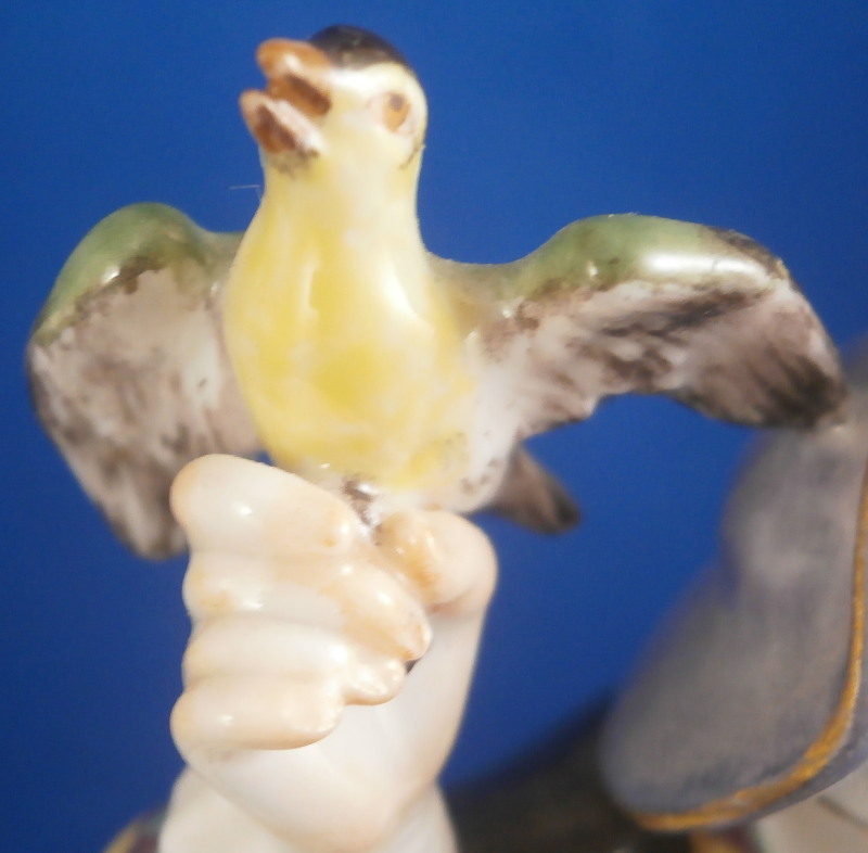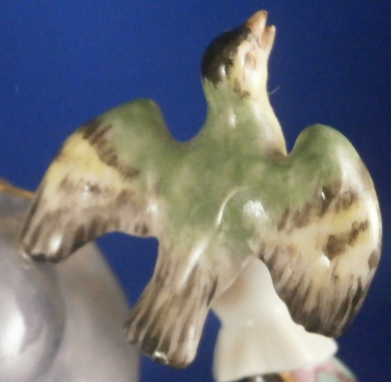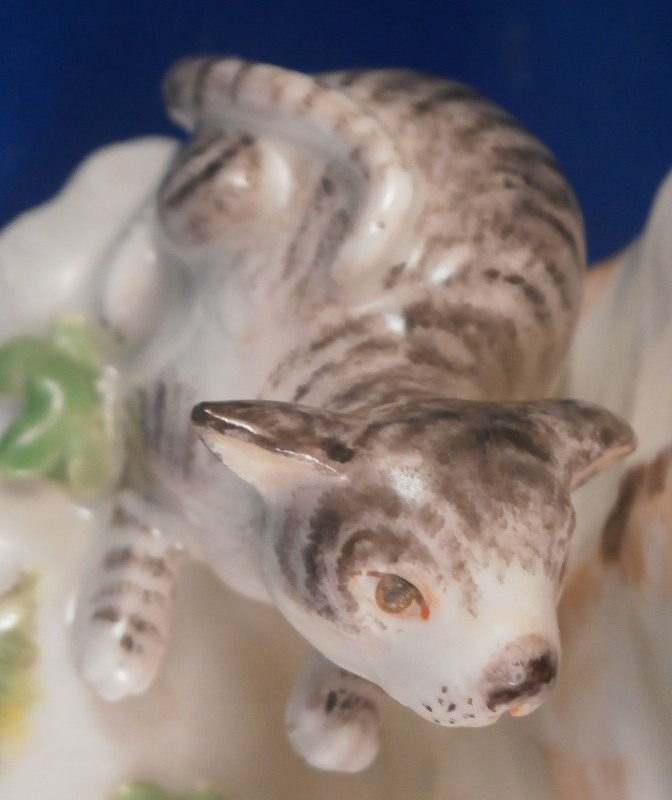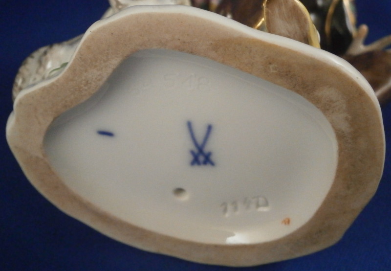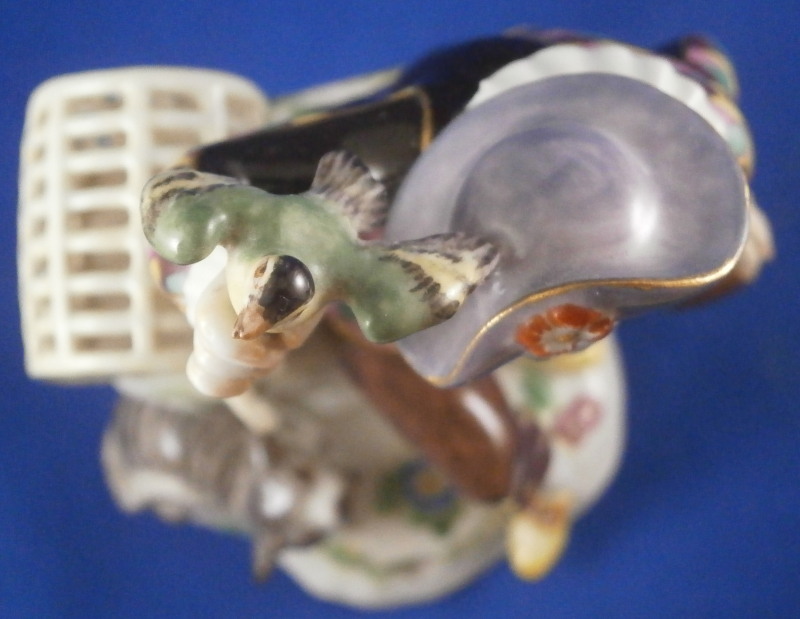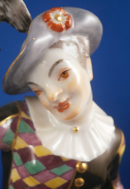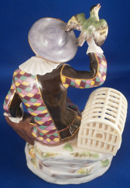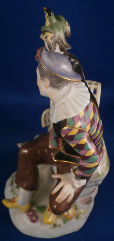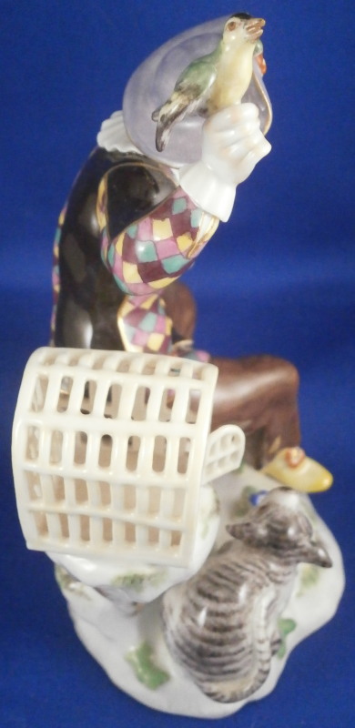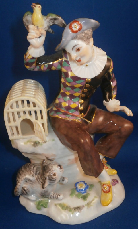 This is a very hard to find superb harlequin figure made by Meissen in the 20th century. Besides the one with the hare and dog this is probably the rarest of the harlequin models made by them and one of the nicest and more complicated ones as well. I do believe he was first designed by Eberlein but I could be wrong and it could have been Kaendler or even a collaboration which they did as well. The harlequin is holding a bird in his right hand while sitting on a rock base with a superb birdcage next to him and a cute little cat in front. There are a couple of flowers on the base in front of him. The harlequin is wearing corwn pants, yellow shoes, a nice hat and that superb top with the typical colorful design to it. All in all an amazing piece that just speaks to you! The figurine is in perfect condition which always helps. The piece is 5.5 inches tall, 3.75 inches wide and 2.75 inches deep. It is marked with the underglaze blue crossed swords mark underneath the base as well as the usual impressed numbers of the period and a painter's number 17 in red. Please email me for more information or other pictures.