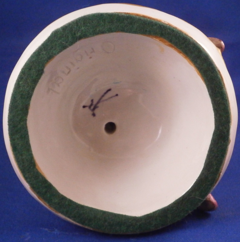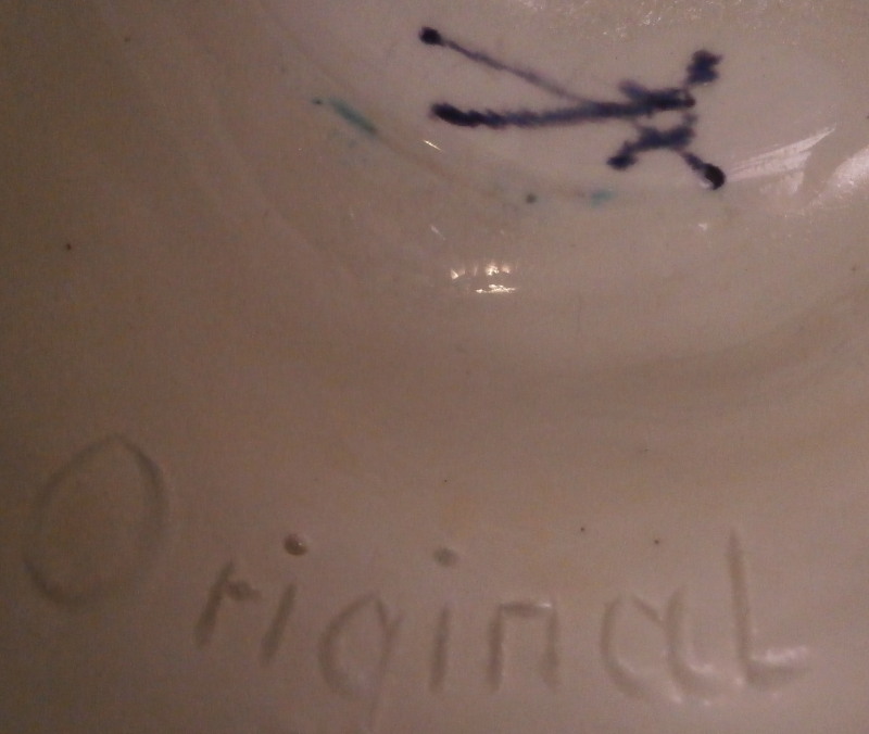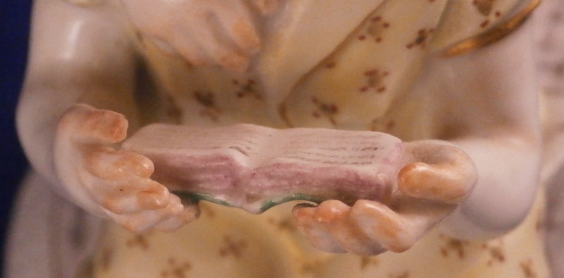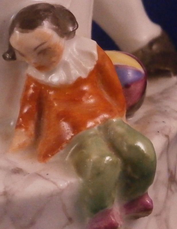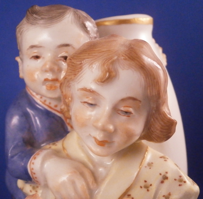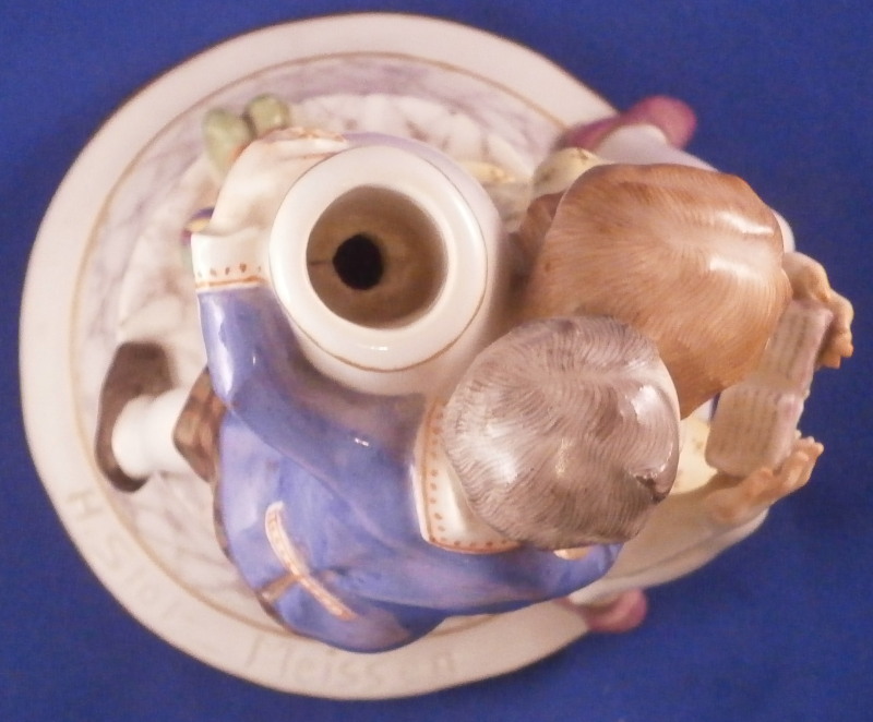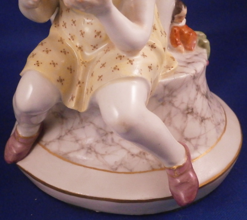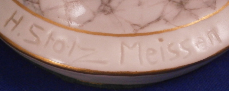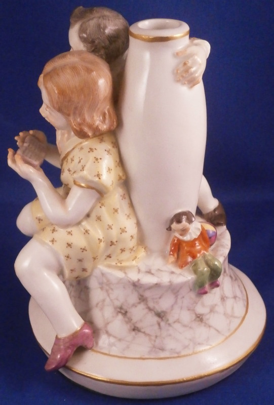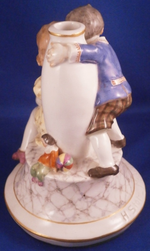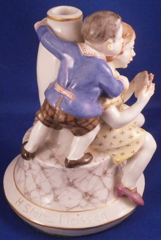 This is a really nice figurine of a young girl and boy made by Meissen in the mid 20th century. The girl is wearing a yellow dress with a pattern to it and sitting down on the marbled base reading a book. The boy is wearing a blue jacket and brown shorts with a fun pattern to them and standing behind the girl trying to take a peak at the book. He is holding onto a column in the middle of the marbled base that has a simple shape to it with a gold ring around the top. Behind the colum there is a doll leaning against it with a small colorful ball next to it. It is a really nice figure and was likely meant to be a lamp base as the column has a hole in the center. Could also be used as a candle stick base if you add a nice bronze candleholder. or use a small diameter candle as is since the holde has a diameter of just over 0.5 inches. The piece is superbly modeled and painted as only a Meissen painter could do :) It is a very interesting piece as this model was never brought into production but is a model an independent artist made to showcase his talent and hope it is selected for production which is apparently never was. I had one other piece like this once before that was marked the same way without a model number but with the word Original impressed on the underside and this piece here came with another one that is marked the same way and also on the site right now. It was certainly made by Meissen as the paste is correct and the painting is as well. The quality is top notch and it truly is a one of a kind which is quite rare in the world of porcelain! The piece has an under glaze blue crossed swords mark to it as well besides the original word. The side of the base is incised H. Stolz Meissen as shown. The other piece I ahve up right now has the year 1948 incised so these were made right after the war and it might explain why this superb piece never made it into production! Quite interesting really! No one can copy the Meissen quality so there is no question that this piece is indeed that! The figurine is in perfect condition. It is 5.375 inches tall and the base has a diameter of about 4 inches. Please email me for more information or other pictures.