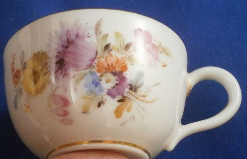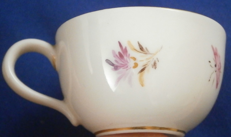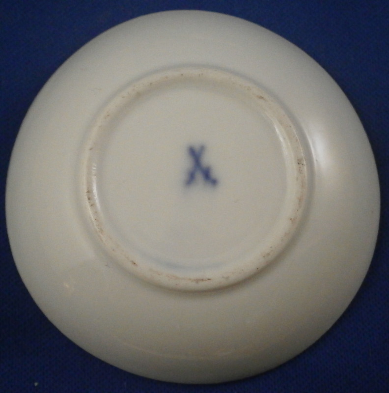 This is a rare miniature / doll cup and saucer made by Meissen in the late 19th century. Both pieces are hand painted with a nice polychrome floral arrangement as well as a little single flower and a bug with a gold trim to the edge and to the handle. Quite nice especially on such a small scale! If you collect doll size items this is a must have! The set is in perfect condition which never hurts either :) It is marked with the underglaze blue crossed swords mark underneath as shown. The cup is 1 inch tall and 1.75 inches in diameter. The saucer is just over 0.5 inches tall and has a diameter of 2.75 inches. Please email me for more information or other pictures.