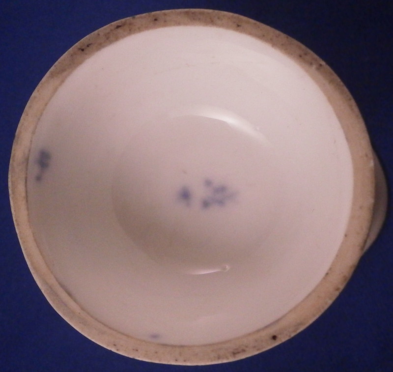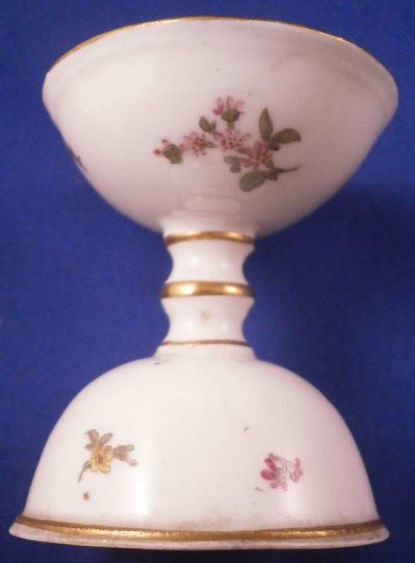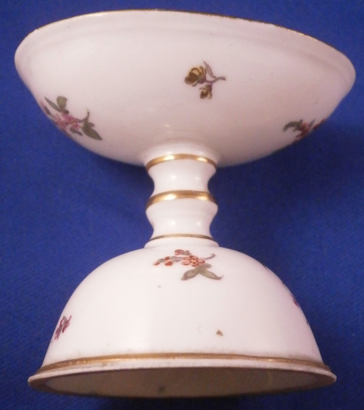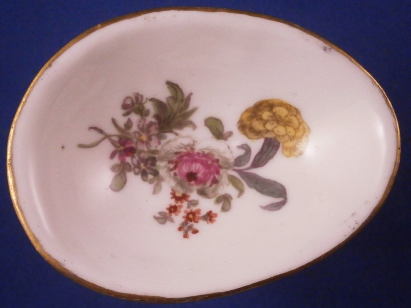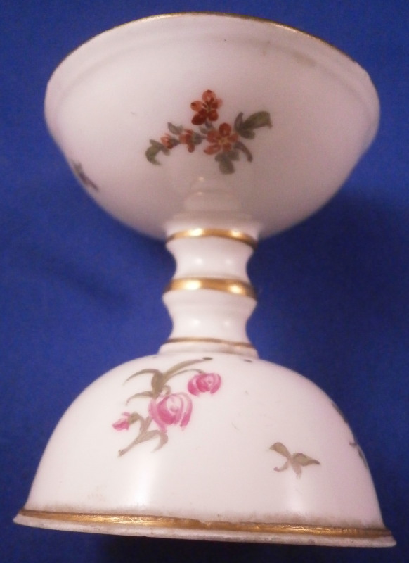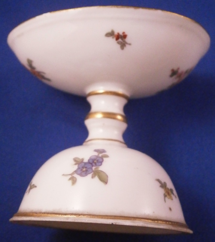 This is a very rare egg cup made by Meissen during the late 18th or early 19th century of the Marcolini period. I finally found another one described as a double egg cup or double ended eggcup at an auction in Germany which ended a long time ago. A double-ended one meant an egg could be eaten upright, as in France and the other Romance countries, or lying horizontally, popular in Germany and the Netherlands in the 18th century. Only a handful of double ended pieces were created for the Royal Court at Dresden. So definitely a real treat :) It is hand painted with strewn flowers all around the outside, some nice gold trim as well as a large polychrome floral arrangement to the top inside as shown. A very rare shape to find! The egg cup is in superb condition - same as the day it was made! About as nice as anyone can hope for! The piece is 2.125 inches tall, 2.375 inches long and 1.875 inches in diameter at the round end. It is marked underneath with the blue crossed swords mark with a star underneath as well as a blue 4. and another blue dot. Please email me for more information or other pictures.