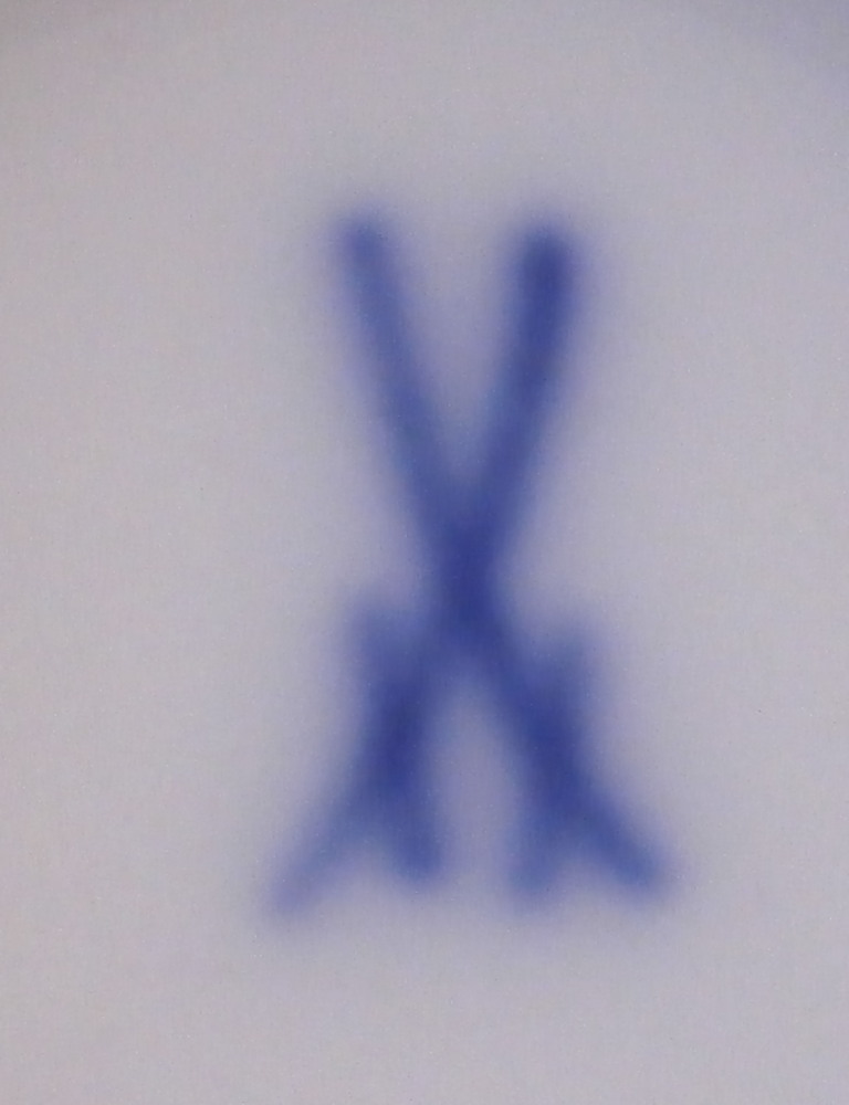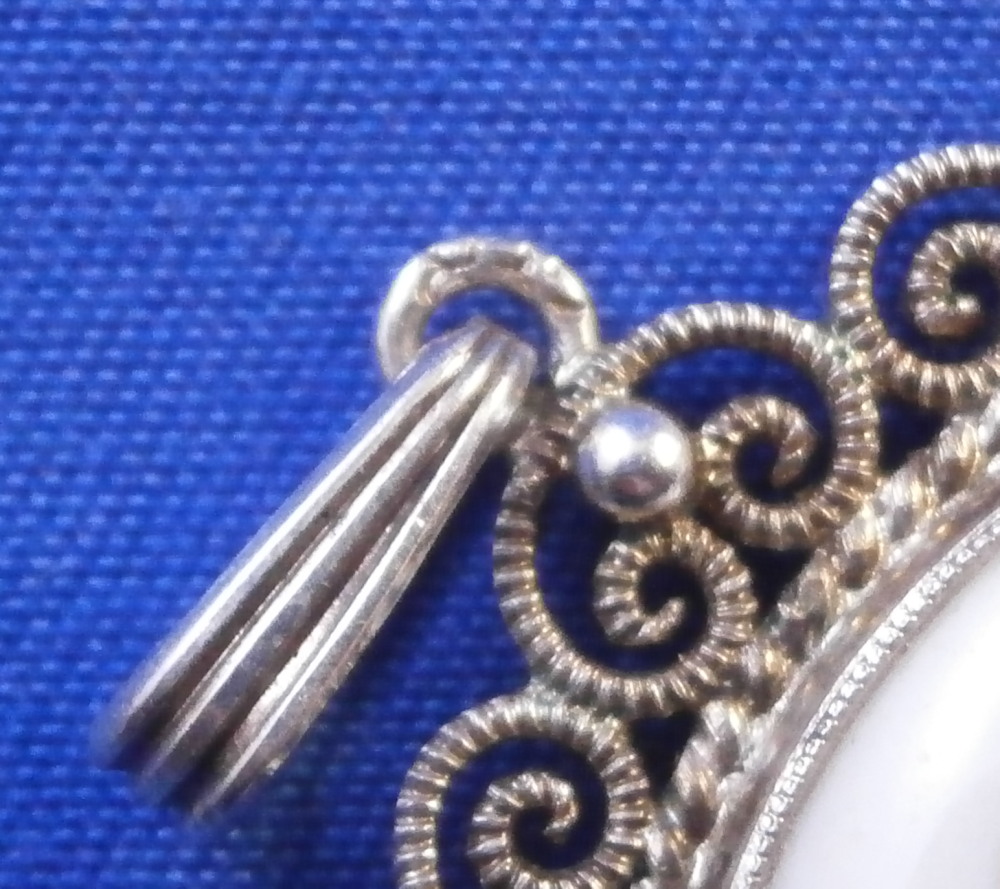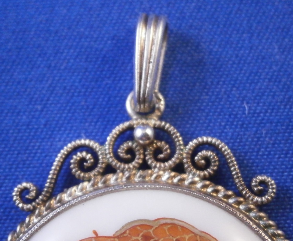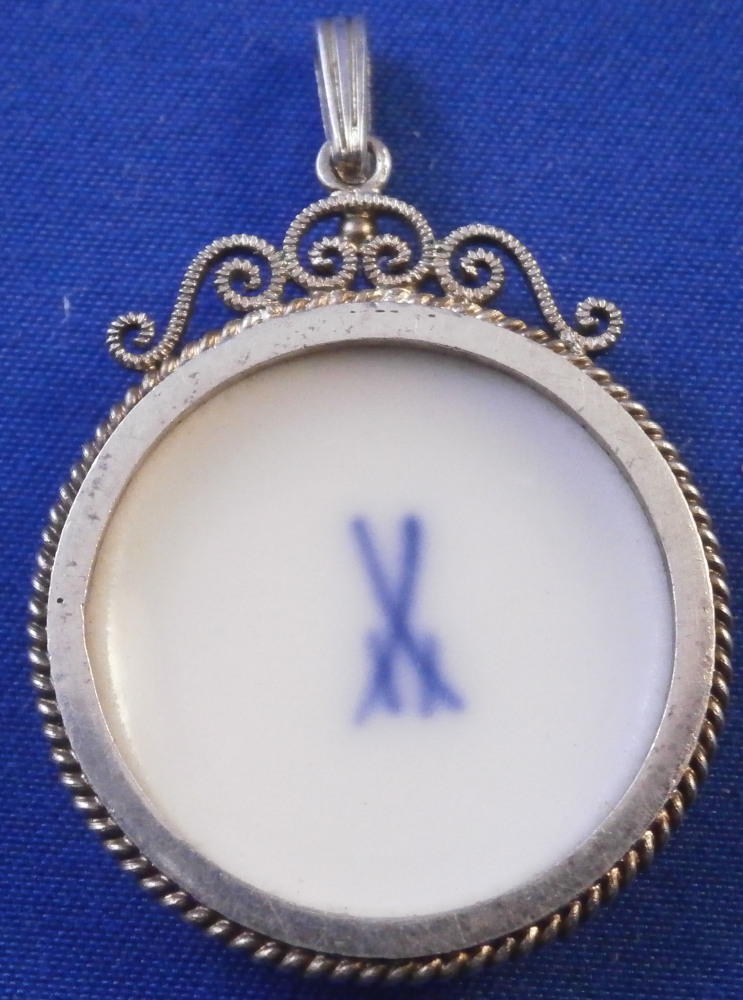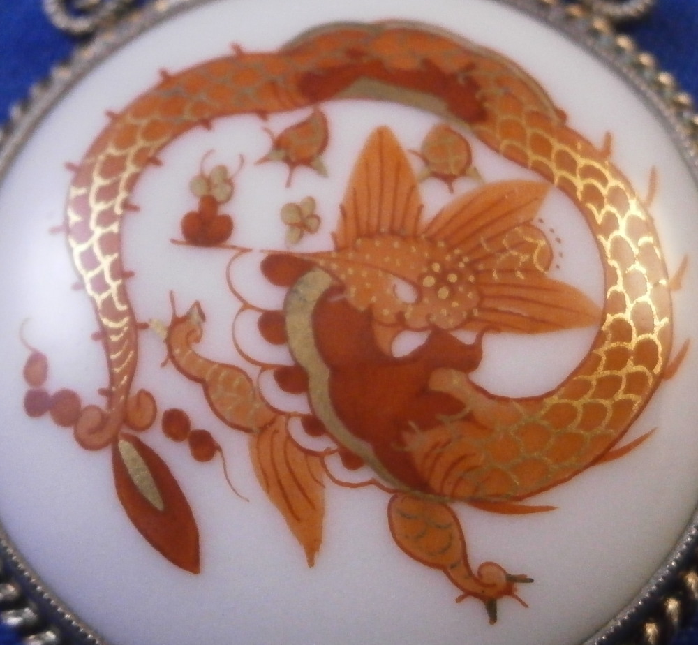 This is a nice round shaped necklace pendant made by Meissen in the 20th century. It is plain white with a nicely hand painted red dragon on it with some gold highlights to it. It has simple yet elegant silver mounts. Not the most dramatic pendant I have owned by them but one that is very elegant plus the red dragon in Chiense mythology represents good fortune so that might come in handy especially these days! The porcelain piece is marked underneath with the under glaze blue swords mark as shown - 1st quality. The silver is not marked legibly but I think it is stamped along the ring that is holding the piece the necklace would slide through. I tried to show it but I cannot make anything out. Normally these pieces are marked 900 so I am sure this is the smae quality silver. The piece is a touch over 0.125 inches thick and it is 1.125 inches in diameter and a bit extra on top with the silver design and the piece the necklace would go through sticking up a touch. It's a really nice size and very pretty! The piece is in perfect condition!. Please email me for more information or other pictures.