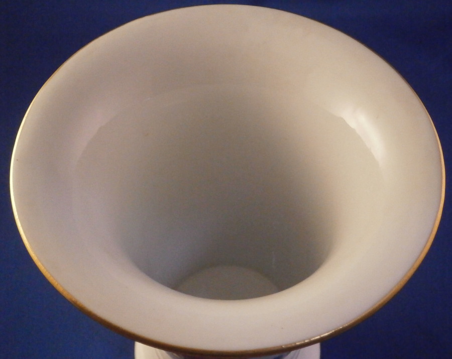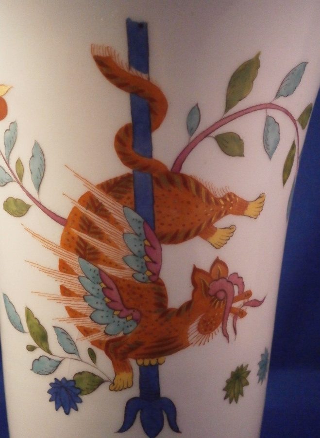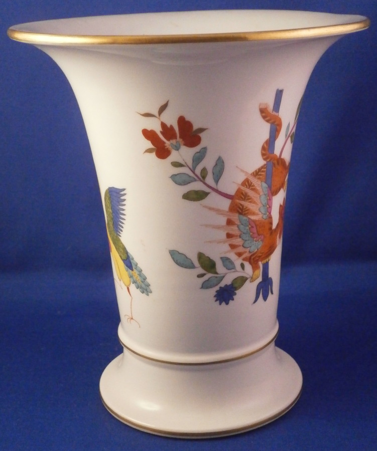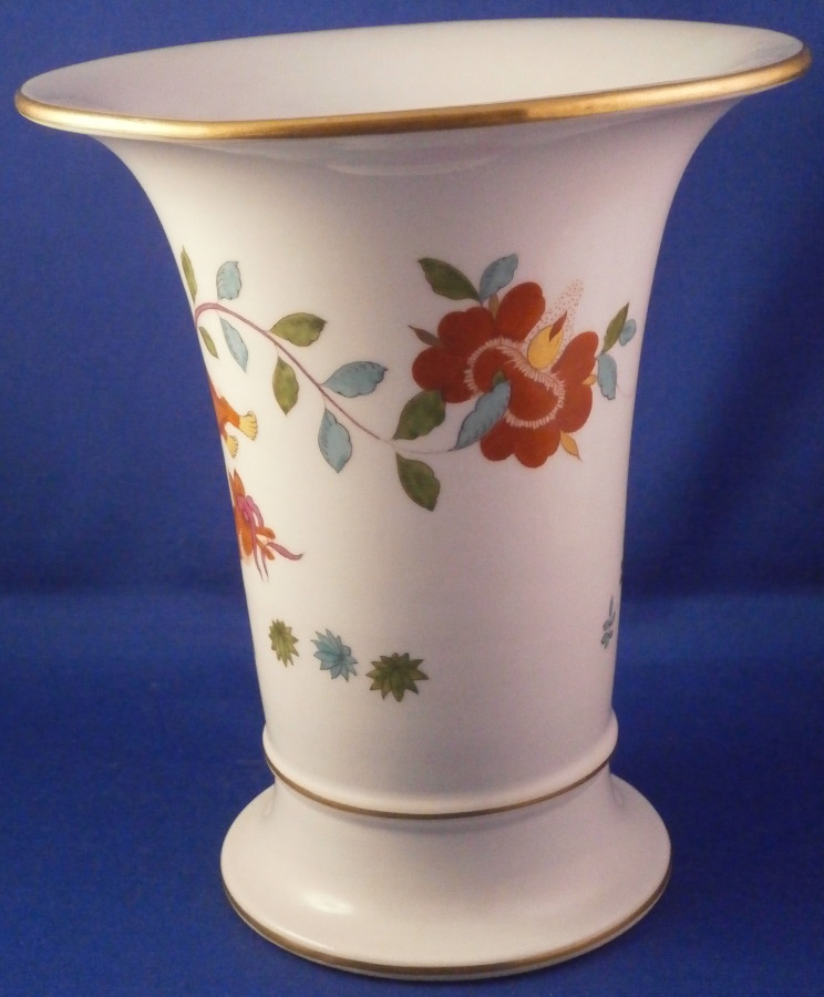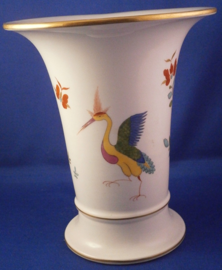 This is a superb porcelain trumpet shaped vase made by Meissen during the Pfeiffer period between 1924 and 1934. It is hand painted with the hard to find red Tiger / Lion ( Roter Löwe ) design with the tiger on one side and a nice yellow crane bird to the other side. The Kakiemon designs and colors are some of the most beautiful ones on porcelain I think! There are some Kakiemon style flowers as well and the top and bottom rims have a bit of gold trim to it. The piece is in perfect condition! It is just over 6.25 inches tall and 5.5 inches in diameter at the top. The vase is marked underneath with the under glaze blue crossed swords mark with the dot between the tops (first choice) as well as the usual impressed numbers as shown and a painter's mark 53. in black. I have the matching second piece if anyone is interested in a rare and really nice looking pair of these. Please email me for more information or other pictures.