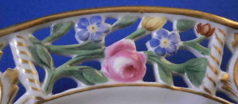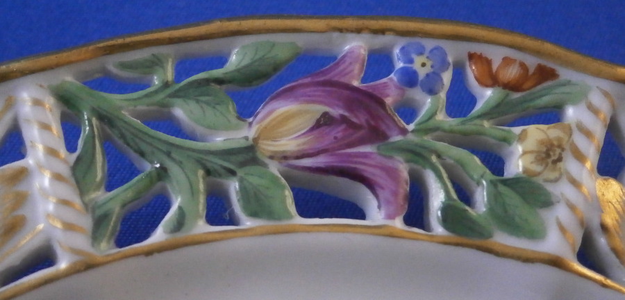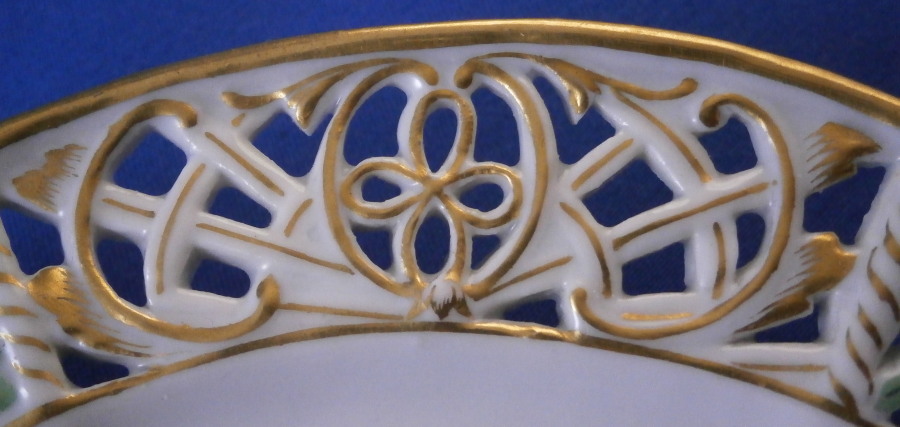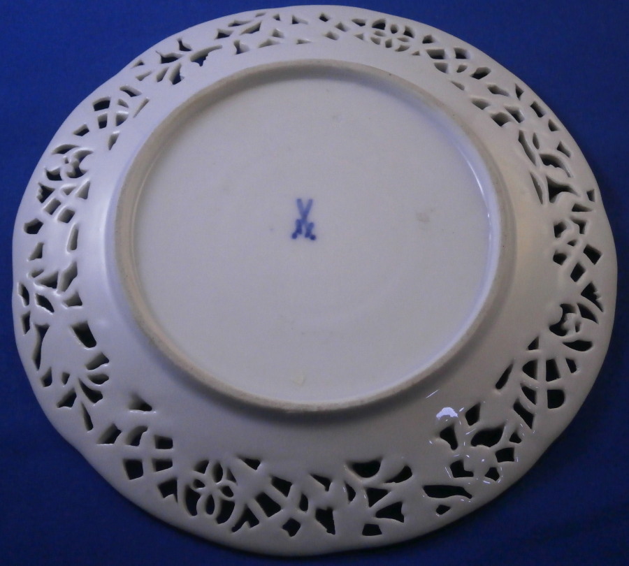 This is a fun saucer made by Meissen in the early to mid 19th century. Looks to be from the Schmierzeit looking at the way the mark is drawn. I had never seen a reticulated saucer like this by them until I bought one a few years back and now this one here. Still ahve no idea what the cup looks like. They do make plates in this style that you come across more often. The saucer is hand painted with lots of scattered flowers and bugs but the best part of this piece is the fancy reticulated rim with lots of flowers and gold highlights. The center of the saucer has a small raised rim to hold the cup in place almost like a trembleuse . The piece is in perfect condition with some minor wear to the gilding mostly to the central ring. The saucer is marked with the underglaze blue crossed swords mark (first choice) underneath as well as an impressed number as shown. It is 0.625 inches tall and 6.125 inches in diameter. Please email me for more information or other pictures.