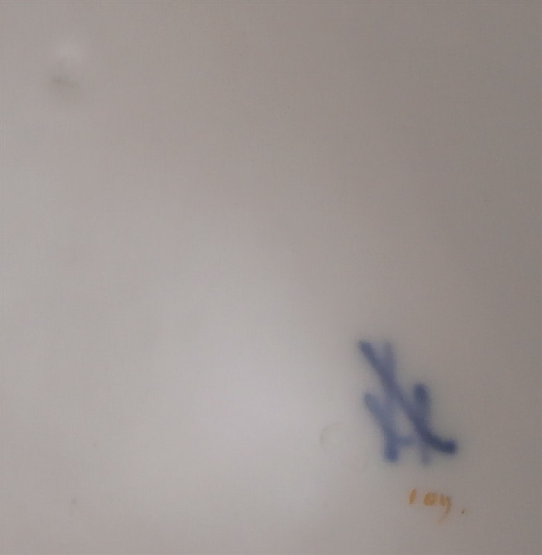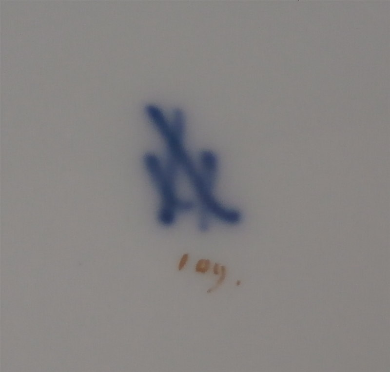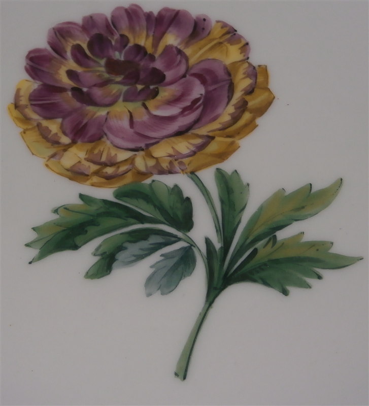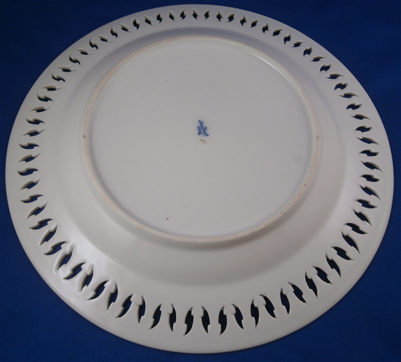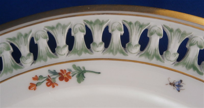 This is a great floral porcelain plate made by Meissen in the mid 19th century. Somehow simple yet complicated and very elegant! It is handpainted with just a single flower in the center but it is large and very well done with lots of detail. Three small flowers along the edge of the bowl part as well as a tiny bug and then the superbly reticulated rim highlighted with a green design and three gold rings. A perfect floral plate! The plate is in perfect condition with just a bit of stacking wear to the white area one has to look for at just the right angle against a bright light to even see at all. Not obvious at all. The plate is 1 inch tall and 9.125 inches in diameter. Marked underneath with the underglaze blue crossed swords underneath as well as an impressed number that is ahrd to see and a gold 109. which is probably a gilder's mark. Please email me for more information or other pictures.