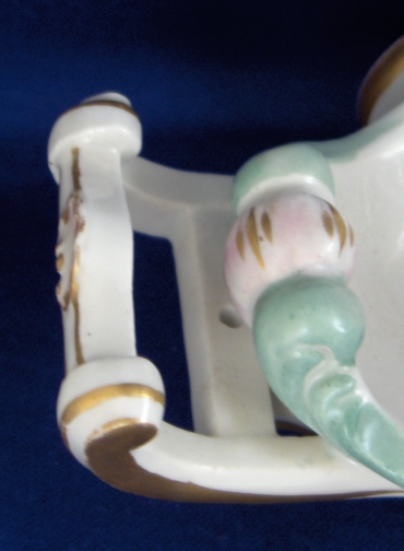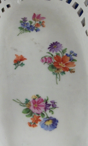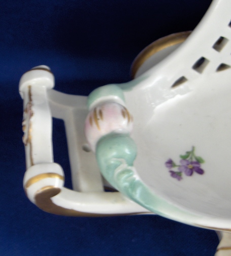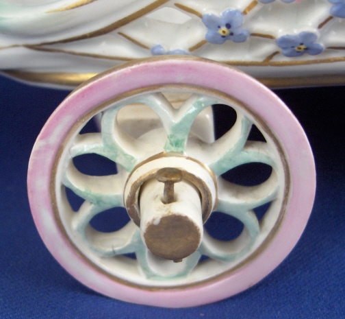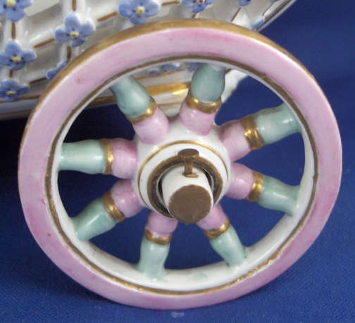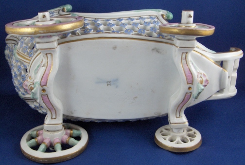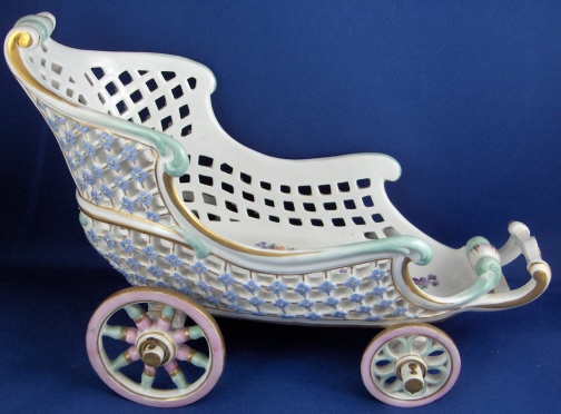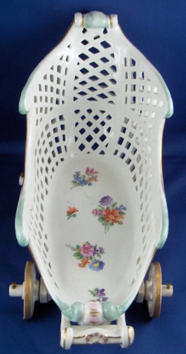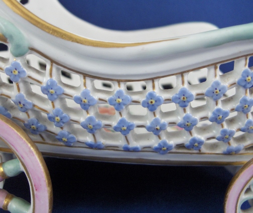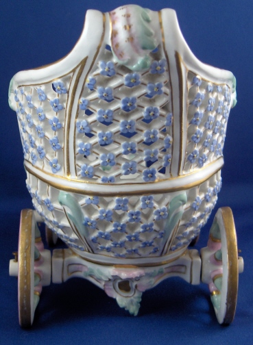 This is a fun and unusual piece made by Meissen in the mid 19th century. It is a carriage with reticulated sides and real working wheels. The inside bottom is handpainted with floral arrangements and single flowers in the mid 19th century style, the outside reticulated sides have forget me nots all over as well as gold trim and the pieces is trimmed in a turquoise, pink and gold design. I have not seen the carriage all by itself as usually there is a pair of figurines attached but it might have been a special order piece. A fun piece for sure since it rolls around on the wheels so you can use it on your dinner table to cart your wine bottle or such around :) The piece is in perfect condition with minor gold wear on the wheels. It is marked with the underglaze blue crossed swords mark underneath as well as a 22. as a painter's mark as well as the usual incised numbers of the period. The carriage is 6.25 inches tall, 9 inches long and 4.5 inches wide. Please email me for more information or other pictures.