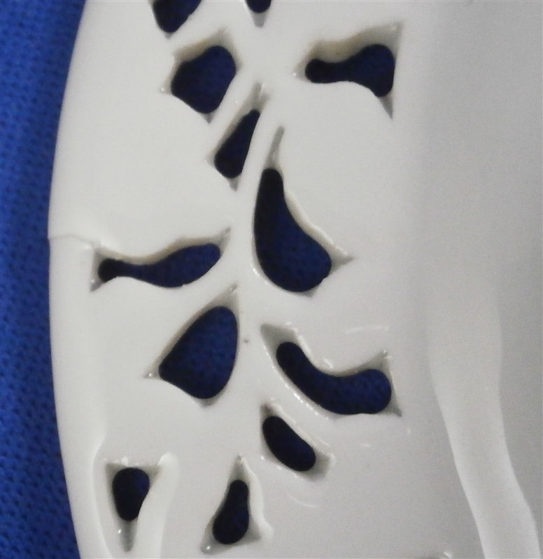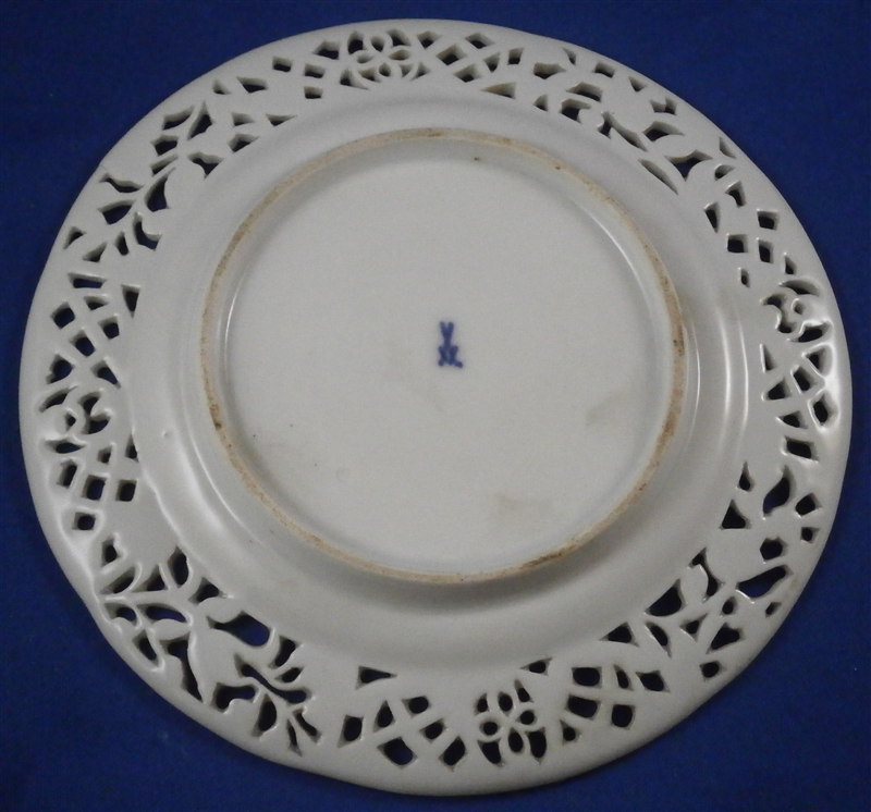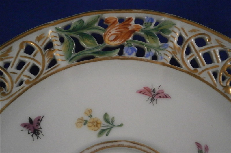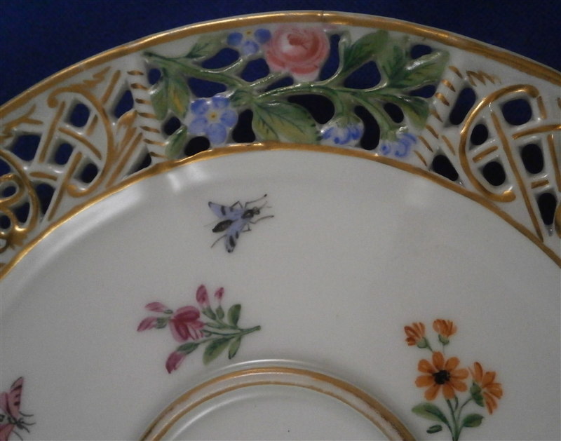 This is a fun saucer made by Meissen in the mid to late 19th century. I have never seen a reticualted saucer like this by them but they do make plates like it and this is likely a saucer for an ecuelle so it makes sense that they exist :) The saucer is hand painted with lots of scattered flowers and bugs but the best part of this piece is the fancy reticulated rim with lots of flowers and gold highlights. The center of the saucer has a small raised rim to hold the cup in place. The piece is in perfect condition with some minor wear to the gilding mostly to the central ring and a firing flaw on the very edge. The saucer is marked with the underglaze blue crossed swords mark (first choice) underneath as well as an impressed number as shown. It is 0.625 inches tall and 6.25 inches in diameter. Please email me for more information or other pictures.