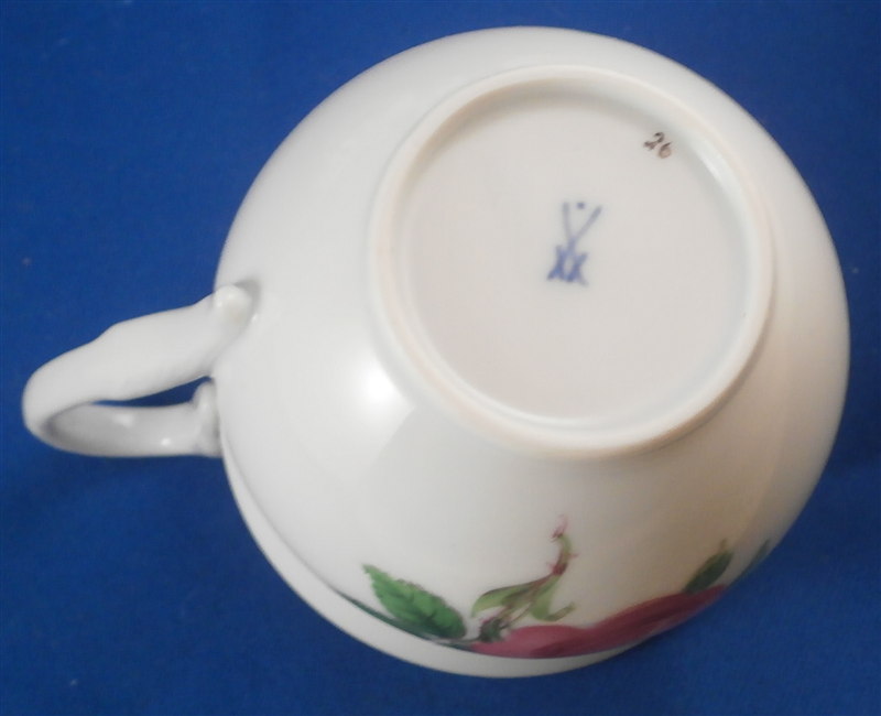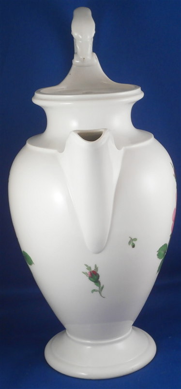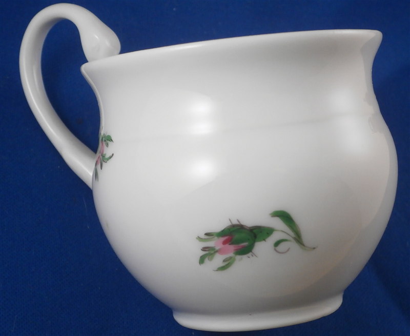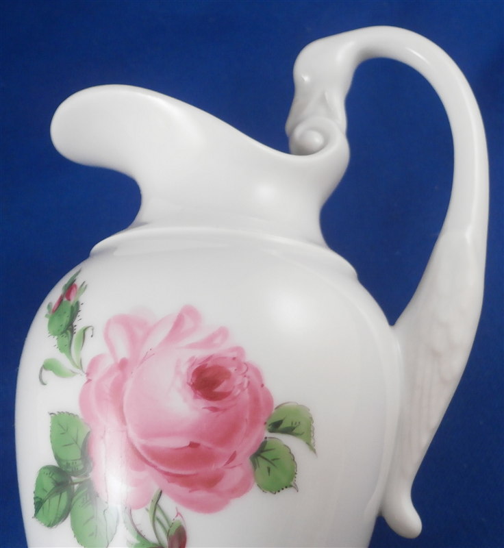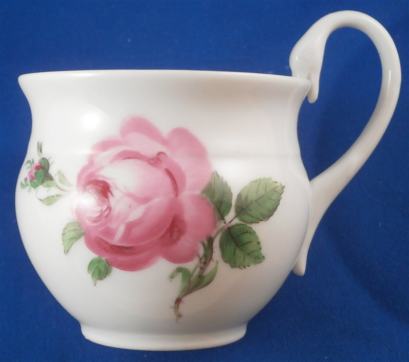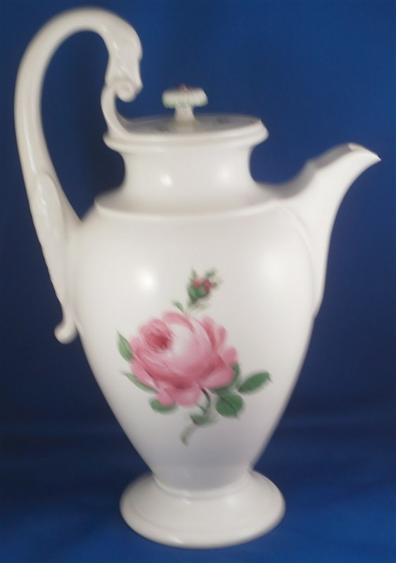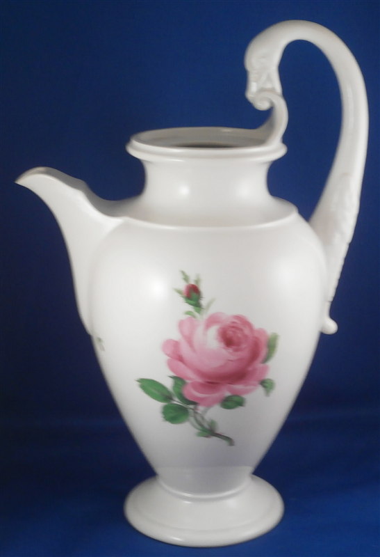 This is a great coffee or hot chocolate set for 5 made by Meissen during the Pfeiffer period of the late 1920s. Each piece is hand painted with their pink rose design including flowers in full bloom, buds and leaves. The handles of the pot and creamer as well as the cups are in the shape of swans which is stunning. Nice floral finial to the lids. The set consists of a large pot and its lid, a creamer, a sugar dish with its lid, 5 small plates as well as 5 cups and 5 saucers. Consider it being a set for 4 with a spare :) Or one could fairly easily find another set to make it one for six people. The pieces are all in good condition with one cup having a small chip out of the side of the beak of the handle top. The sizes are as follows: The pot is 12 inches tall with a diameter of about 5.5 inches. The creamer is 6.125 inches tall with a diameter of 2.75 inches. The cups are 3.125 inches tall and 2.75 inches in diameter. The saucers are 5.75 inches in diameter and about 1.25 inches tall. The sugar dish is 4 inches tall and 3.5 inches in daimeter and the small plates are 7 inches in diameter. All pieces are marked with the udner glaze blue crossed swords mark as shown. Most pieces have two cuts across the marks likely due to a few tiny black firing flaws from the making which do no distract nor are they obvious. The 5 cups and 3 saucer are first choice the other two saucers also have two cuts across the mark. All in all a stunning set and one that would look stunning when you use it for your guests. Please email me for more information or other pictures.