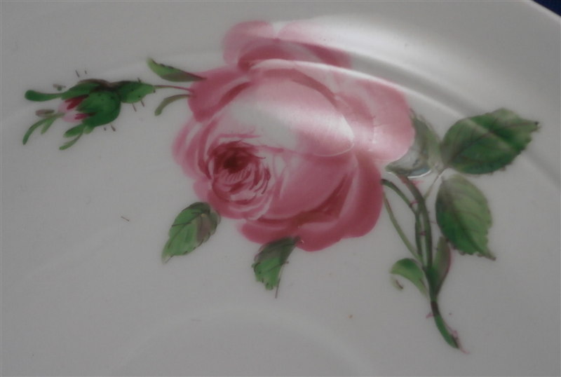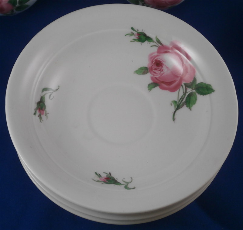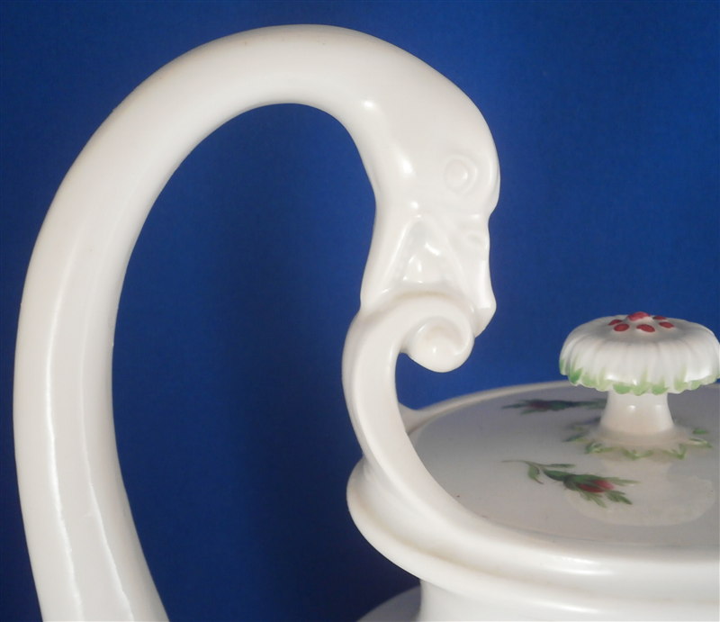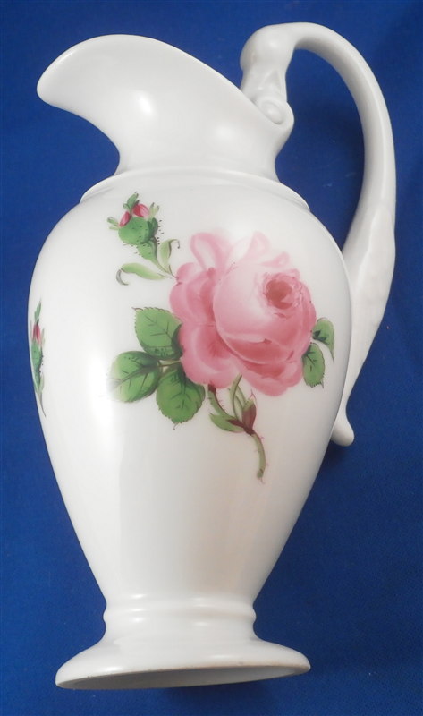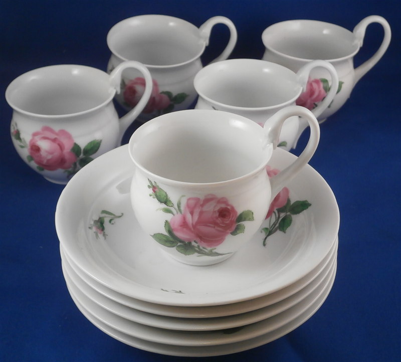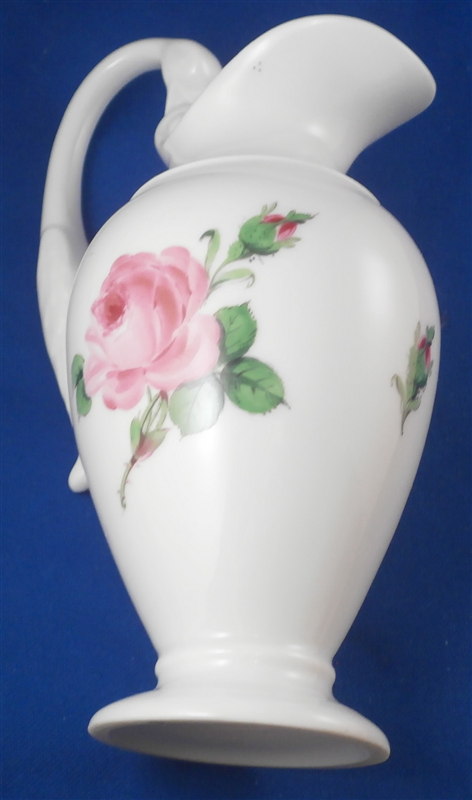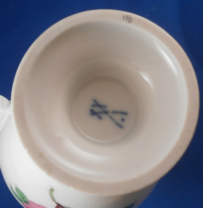 This is a great coffee or hot chocolate set for 5 made by Meissen during the Pfeiffer period of the late 1920s. Each piece is hand painted with their pink rose design including flowers in full bloom, buds and leaves. The handles of the pot and creamer as well as the cups are in the shape of swans which is stunning. Nice floral finial to the lids. The set consists of a large pot and its lid, a creamer, a sugar dish with its lid, 5 small plates as well as 5 cups and 5 saucers. Consider it being a set for 4 with a spare :) Or one could fairly easily find another set to make it one for six people. The pieces are all in good condition with one cup having a small chip out of the side of the beak of the handle top. The sizes are as follows: The pot is 12 inches tall with a diameter of about 5.5 inches. The creamer is 6.125 inches tall with a diameter of 2.75 inches. The cups are 3.125 inches tall and 2.75 inches in diameter. The saucers are 5.75 inches in diameter and about 1.25 inches tall. The sugar dish is 4 inches tall and 3.5 inches in daimeter and the small plates are 7 inches in diameter. All pieces are marked with the udner glaze blue crossed swords mark as shown. Most pieces have two cuts across the marks likely due to a few tiny black firing flaws from the making which do no distract nor are they obvious. The 5 cups and 3 saucer are first choice the other two saucers also have two cuts across the mark. All in all a stunning set and one that would look stunning when you use it for your guests. Please email me for more information or other pictures.