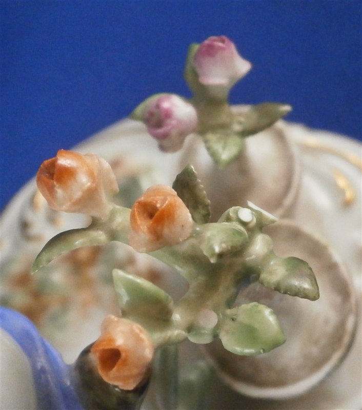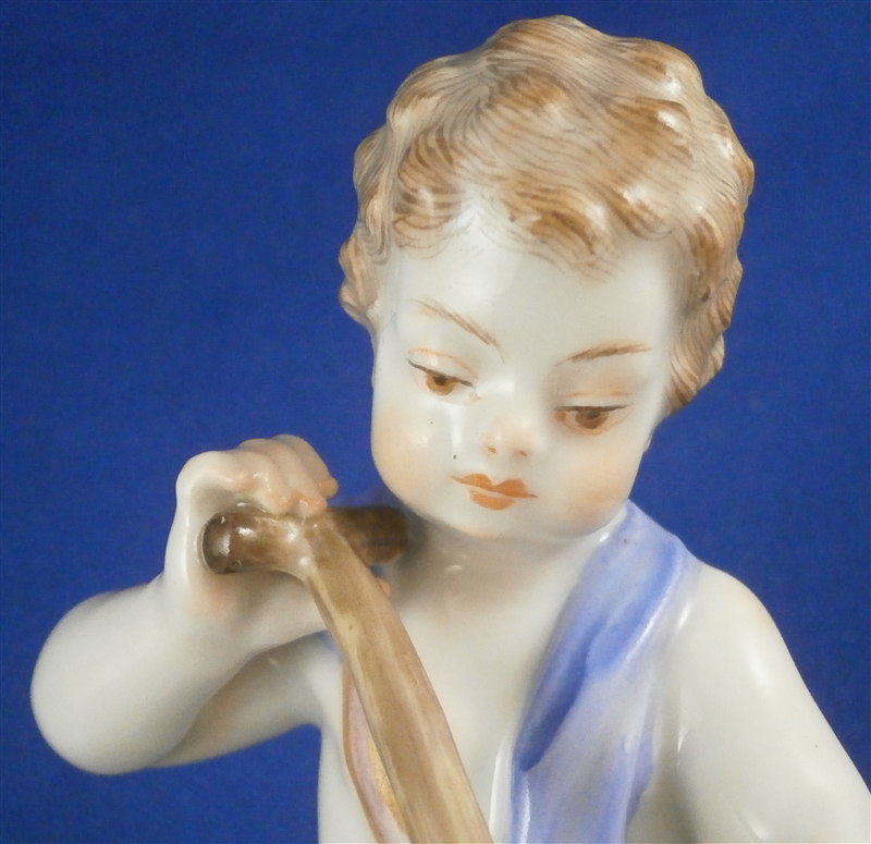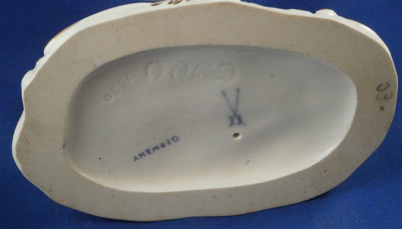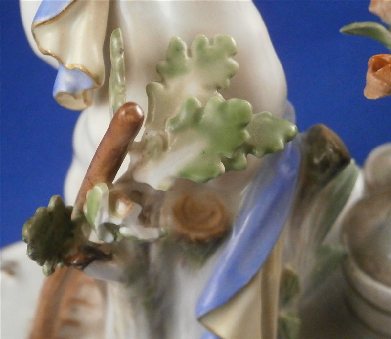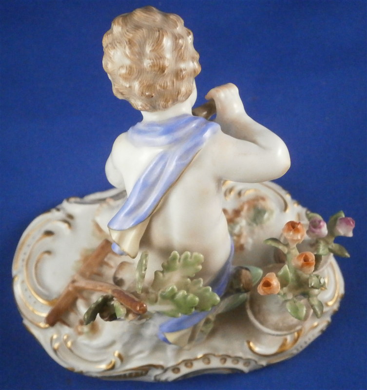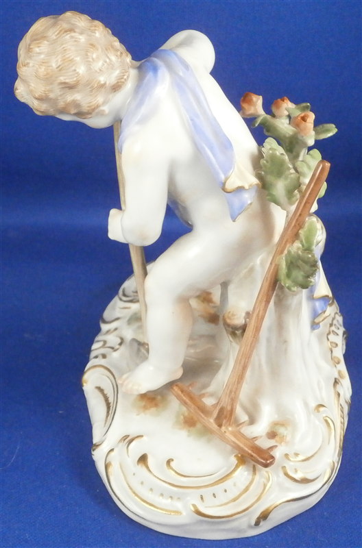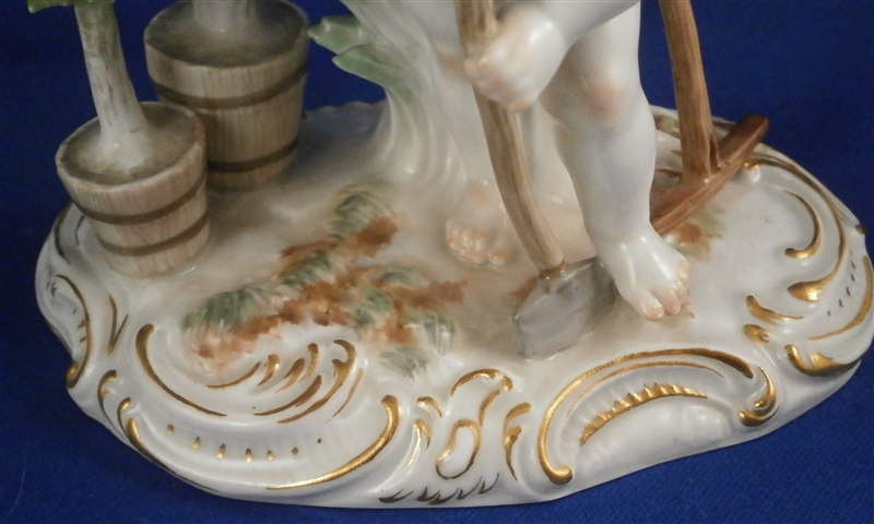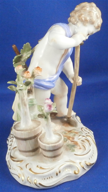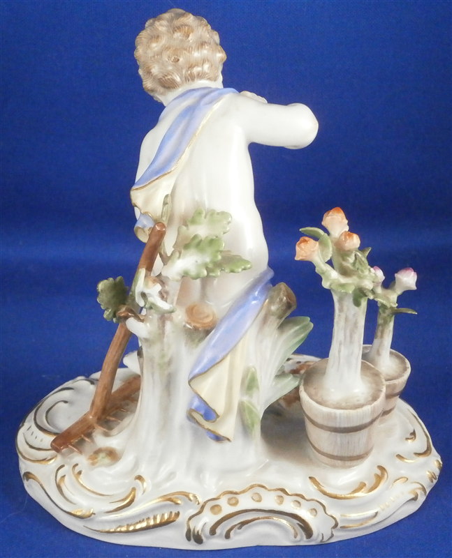 This is a figurine of a gardener made by Meissen in the earlier part of the 20th century. He is wearing a blue and yellow cloth while digging in the ground with a shovel, with a rake by his side while leaning against a tree trunk. Two roses planted in wooden buckets to his other side with a nice base with scrolls highlighted with gilding. A very well modeled and painted piece with lots of nice detail. The figurine displays very well and is in better shape than most one sees of this model with one rose actually being perfect, the orange rose is missing two buds and one leaf is chipped and there are some chipped leaves to the back of the putto. From the front the piece displays perfectly! The figurine is 4.375 inches tall, 4.5 inches wide and 2.875 inches deep. It is marked with the crossed swords mark underneath the base as well as the usual impressed / incised numbers and letters of the period and GERMANY in blue. Please email me for more information or other pictures.