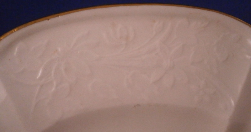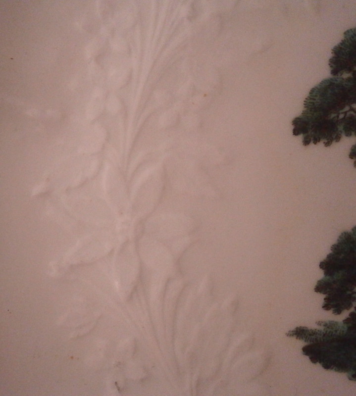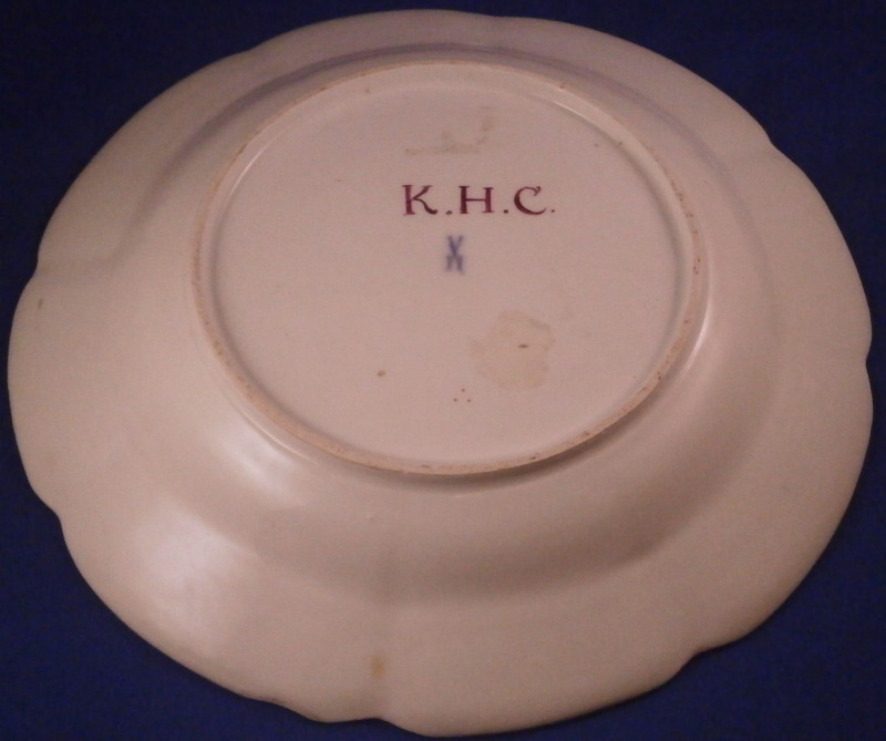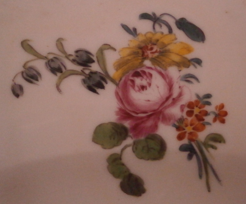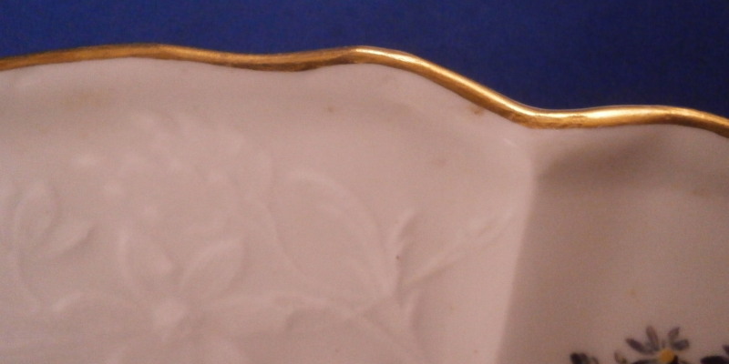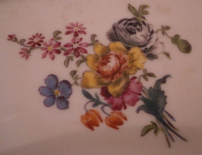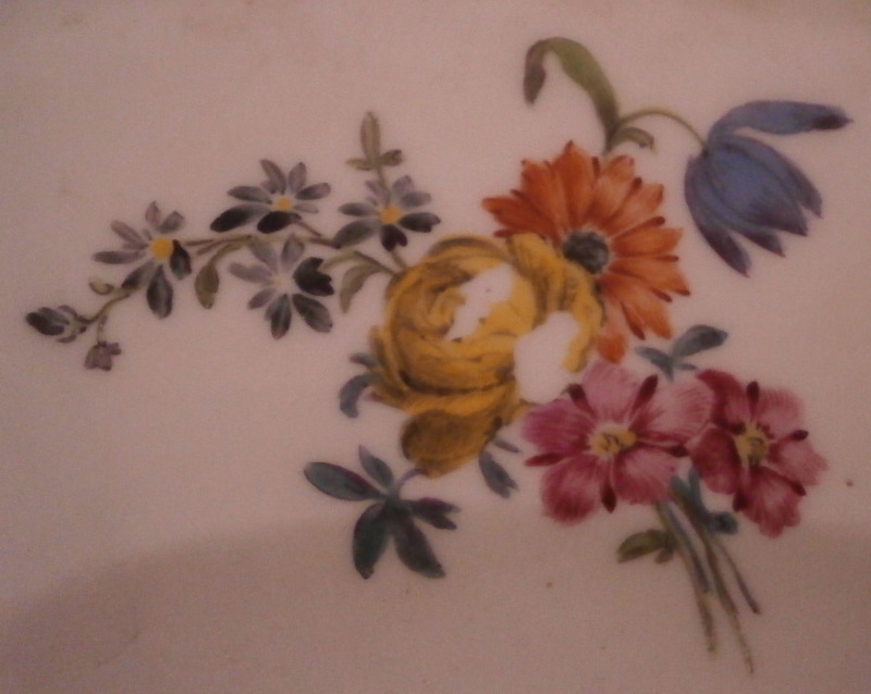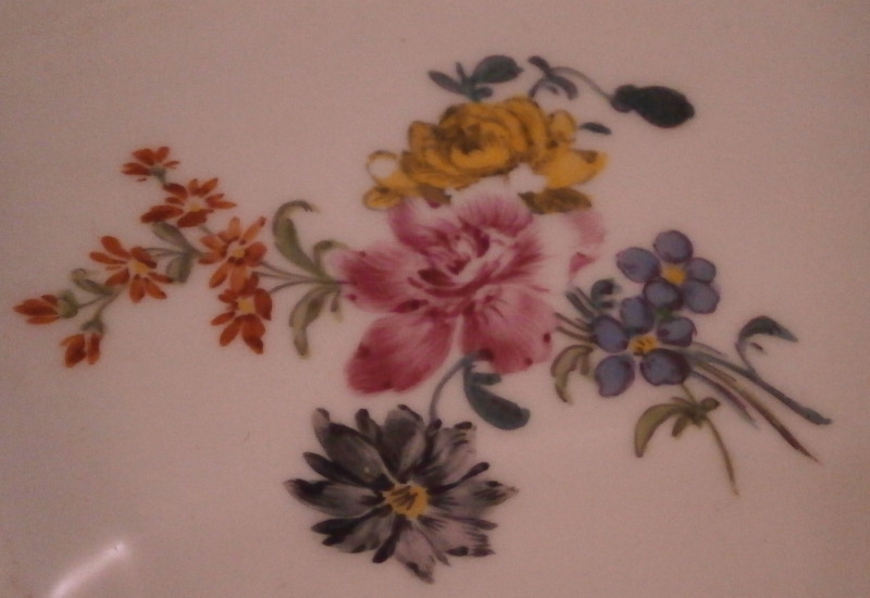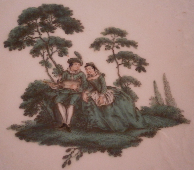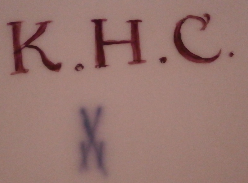 This is a rare treat - a plate from the green Watteau ( grünes Watteau ) service made for the royal court of Saxony by Meissen in 1749 and it is from this original period. It is hand painted with a mostly copper green Watteau scene in the center inckuding a couple in a landscape surrounding and four floral arrangements on the rim. Gold trim to the edge and the Gotskowsky relief design to the paste which means nice flower garlands in releif along the edge of the well and flowers in relief in four sections along the rim between the hand painted flower panels. This service was modeled by J.F. Eberlein. The plate is in superb condition with some flaking to the yellow paint of the flowers and one spot along the edge was ground down a tiny bit but that was during the manufacturing since the gilding is original along this spot. Some tiny firing flaws normal to these early pieces. The plate is 1.375 inches tall and has a diameter of 9.75 inches so a nice size. It is marked with the under glaze blue crossed swords mark underneath as shown, an impressed 22, three dots in orange in a triangle shape as a painter's mark and the K.H.C. in puce for Königliche Hof Conditorei (royal court bakery). Please email me for more information or other pictures.