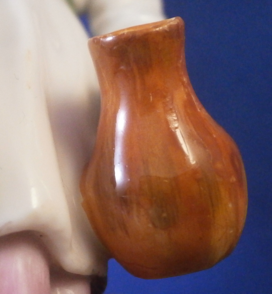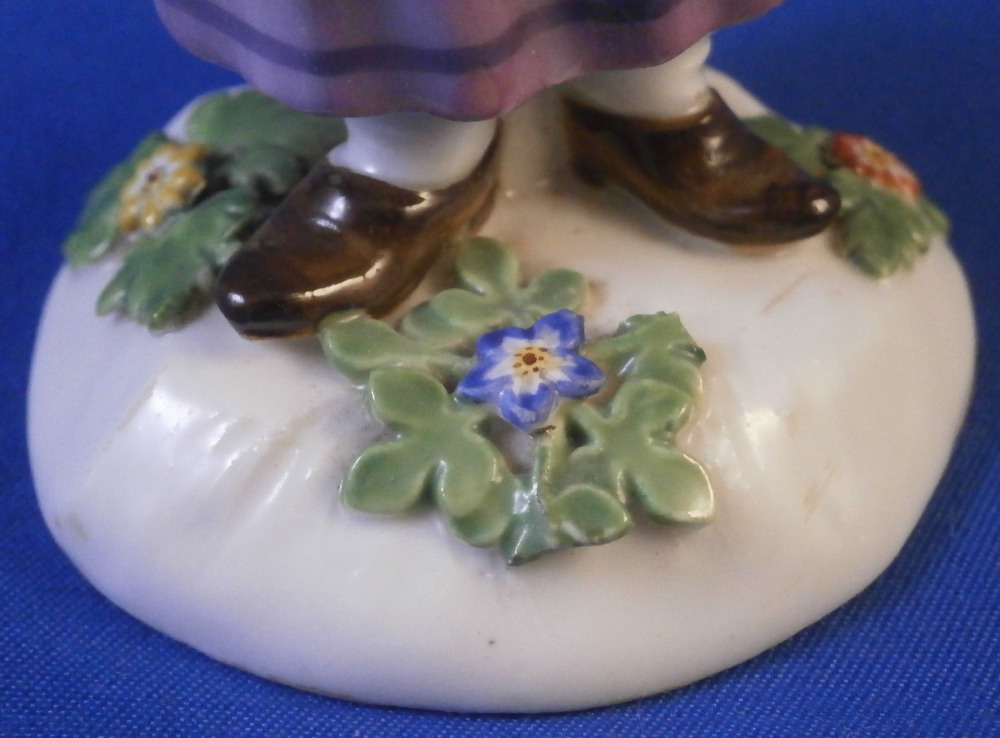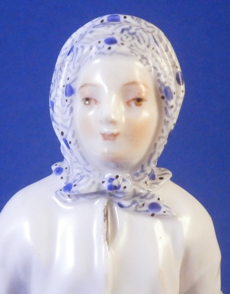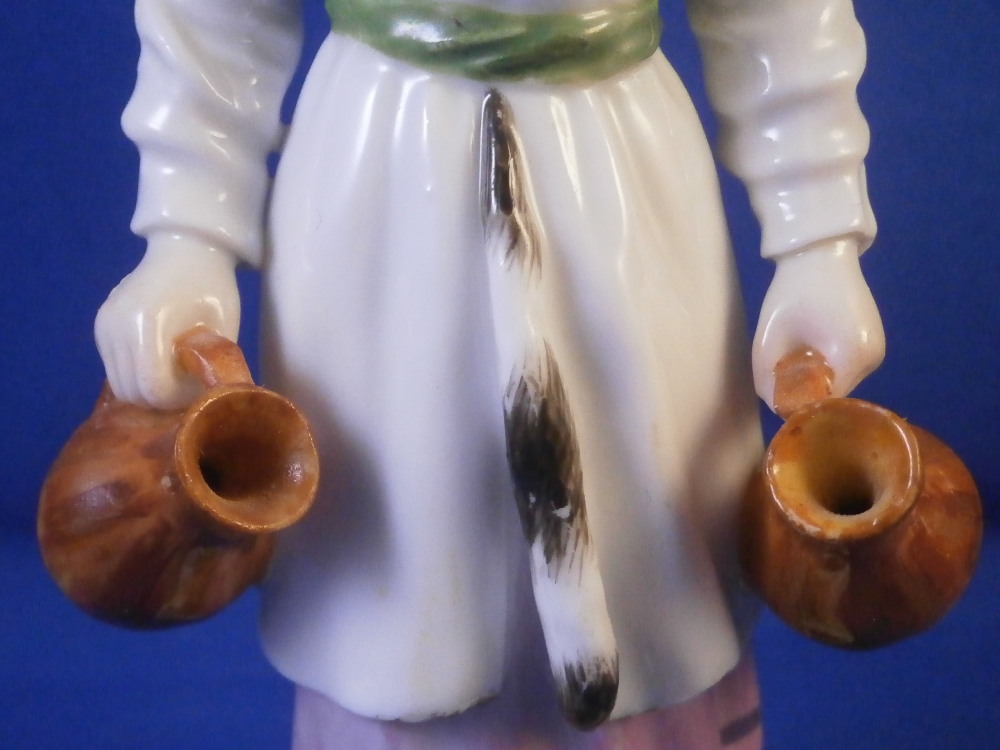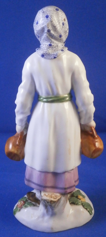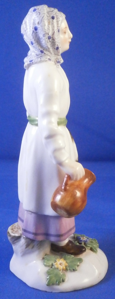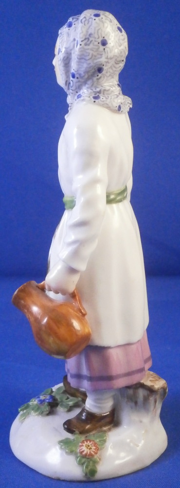 This is a great figurine of a peasant girl from the Russian street trader series made by Meissen during the Pfeiffer period of the 20th century. The series is sometimes called the Cris de St. Petersburg - the Russian version of the Cris de Paris from France. First modeled by Peter Reinicke in the 18th century the figurine is of a lady golding a jug in each hand while wearing a long coat, a head scarf and standing on a white base with some flowers on it. A really well modeled and hand painted figurine. The figure is in great condition with a leaf on the base being chipped and each jug has had the opening restored. Probably small chips but impossible to tell. She displays perfectly!The figure is 5 inches tall, 2.25 inches wide and 1.875 inches deep and marked with the under glaze blue crossed swords mark underneath as well as the usual impressed numbers of the period and a 9. as a painter's mark. Please email me for more information or other pictures.