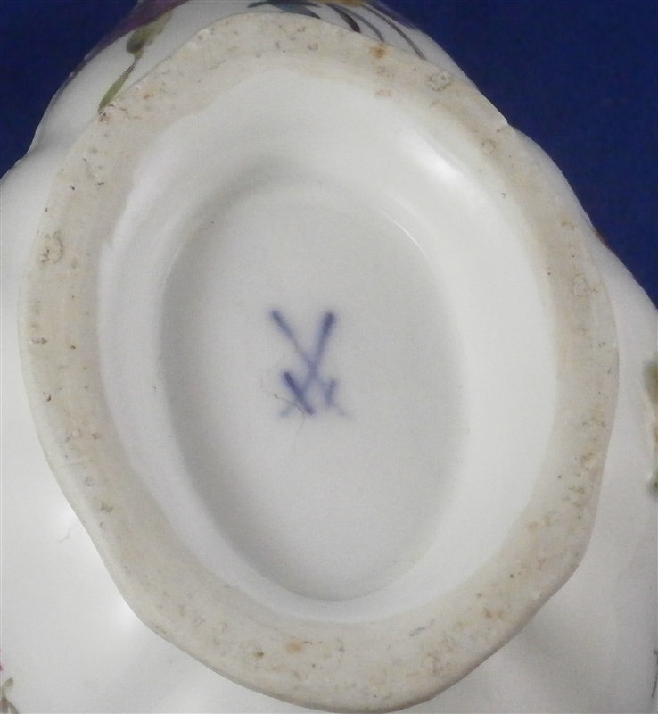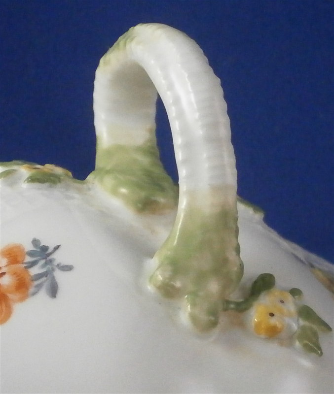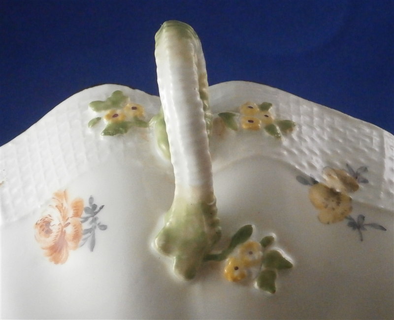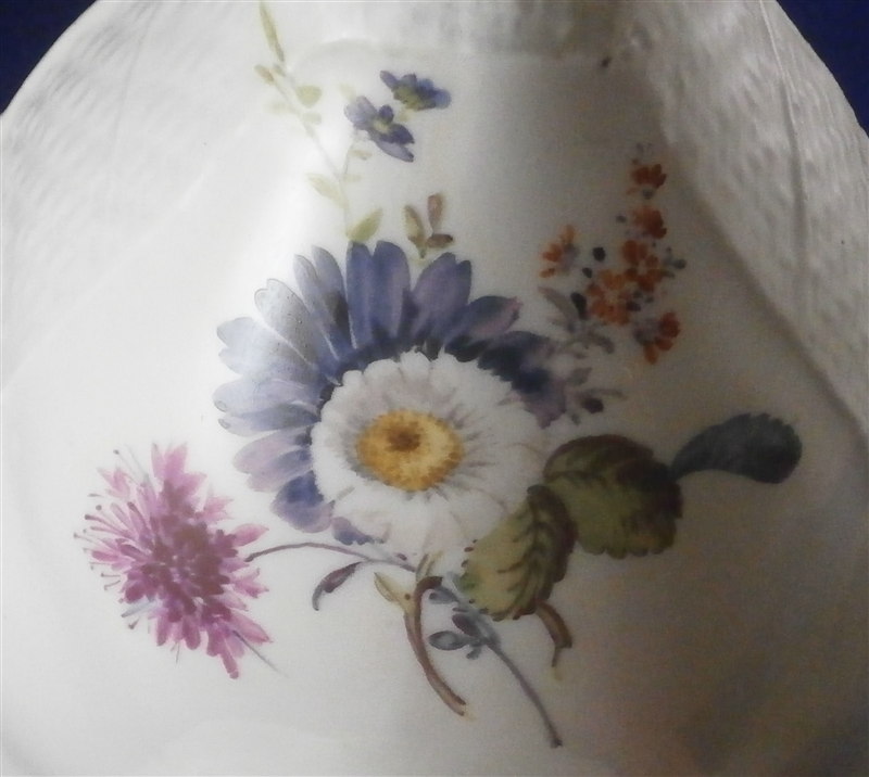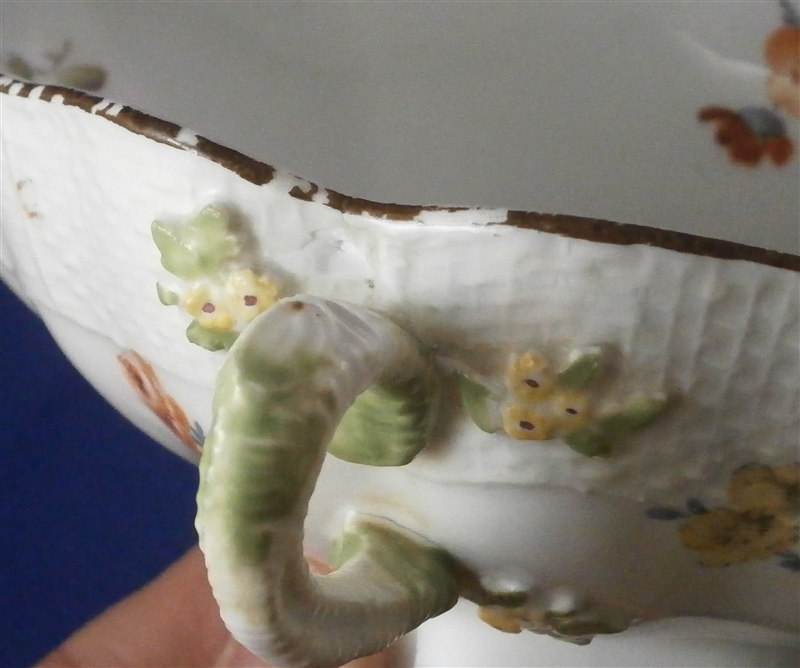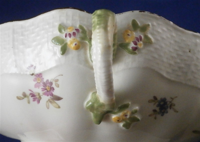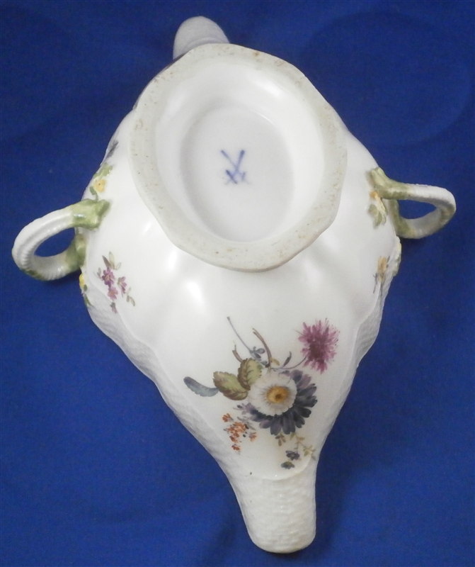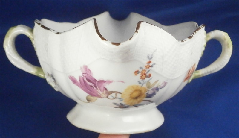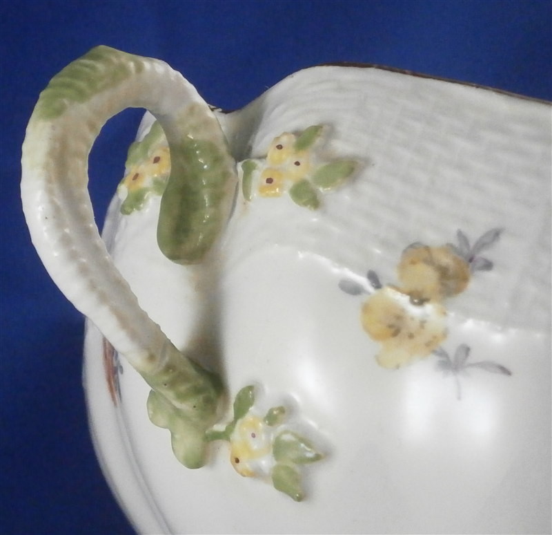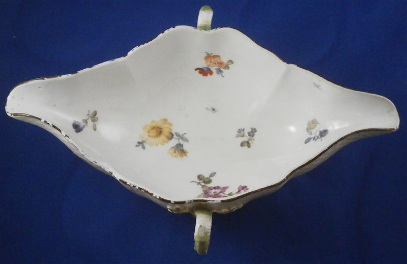 This is a rare sauce dish made by Meissen around 1750. It is handpainted with a floral arrangments at each end, lots of scattered flowers throughout the outside and inside, a brown trim to the edge and two nice branch handles ending in leaves with flowers painted in green. The flowers are already of the Deutsche Blumen style but the colors of the leaves and the way the rose was painted is indicative of being from around 1750 which fits the paste and mark. The little piece is in great condition with one handle having been off but it is almost impossible to spot. There is a little piece of glaze missing just above it which is why I investigated and found the reglued bottom part. Perfectly done and does not take away from the piece. The brown edge trim has flaked off a bit but that would be an easy fix if one wanted to get it done. Nice basket weave design to the top outside rim. The piece is 3 inches tall, 9.25 inches long and and 6.5 inches wide. Marked underneath with the underglaze blue crossed swords mark as shown. Please email me for more information or other pictures.