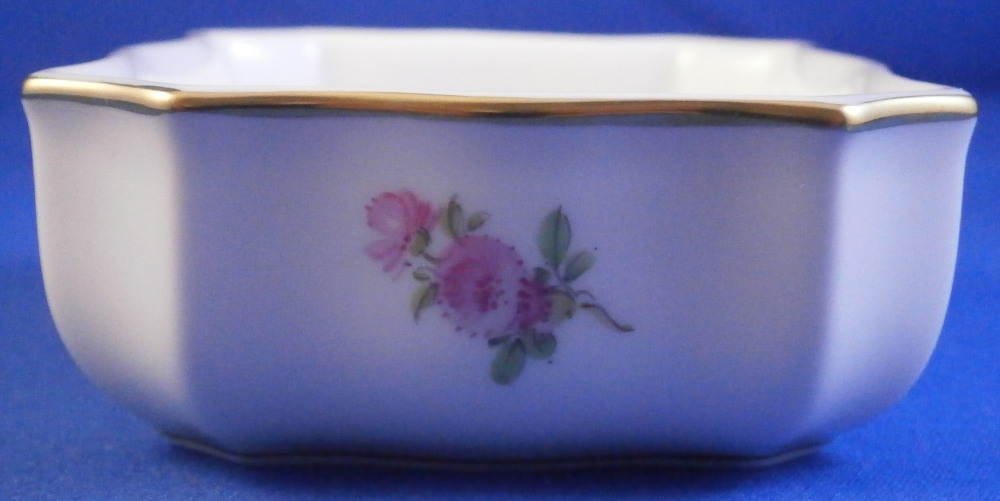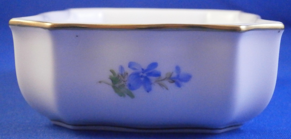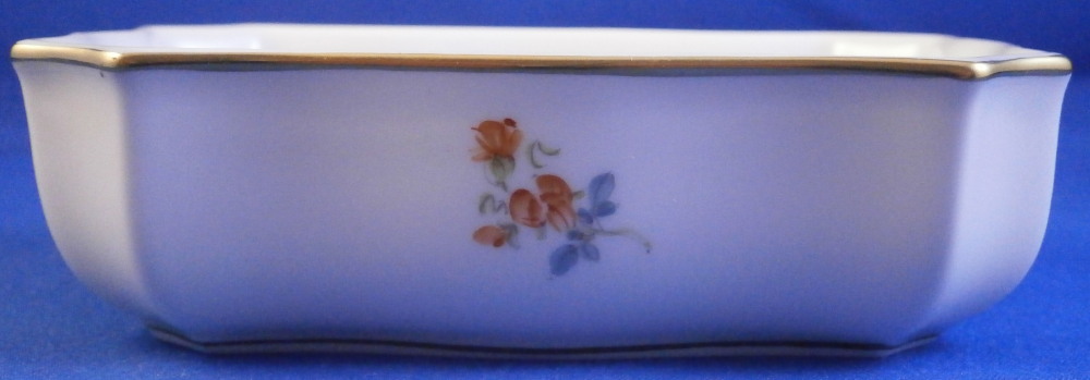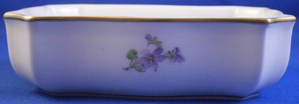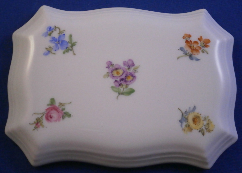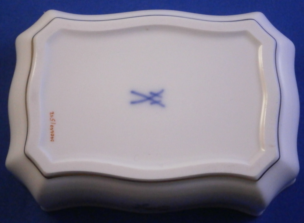 This is a nice little box made by Meissen in the 20th century. Perfect to put your jewelry in it or stamps or whatever else you'd like. I normally know this shape to be for matches with the udnerside lid being rough to use as a striker but here it is smooth and does not have that feature. Both the top and bottom are hand painted with lots of cute very well done little flowers scattered all over with a relief design to the paste along the rim and some gold trim to the edge. The box has a nice shape to it as well. It is in perfect condition! The bottom part is marked with the under glaze blue crossed swords mark (first quality) underneath as well as the usual impressed numbers, etc. as shown. The box is 1.375 inches tall, 3.875 inches wide and just a touch over 2.75 inches deep. Please email me for more information or other pictures.