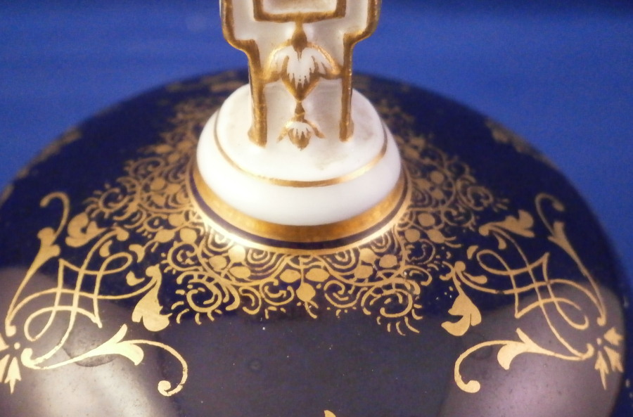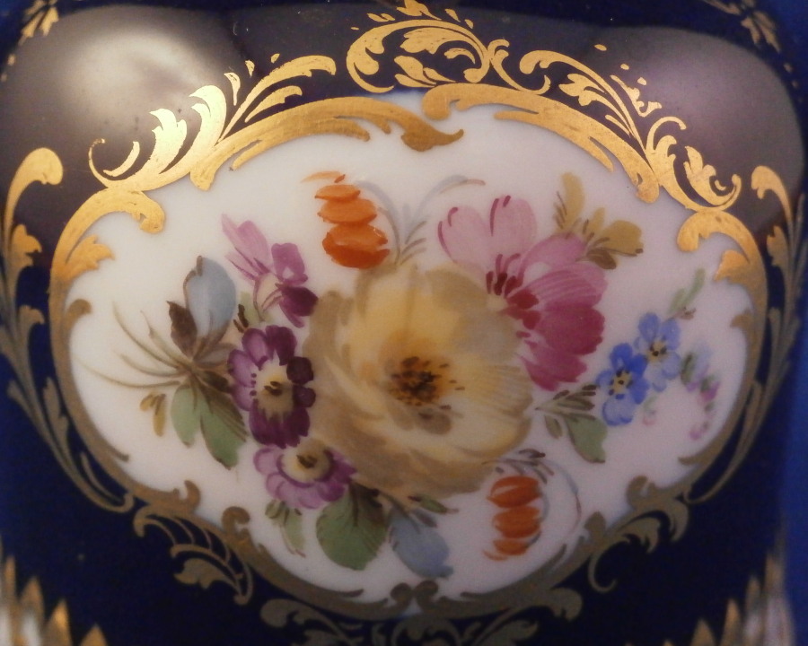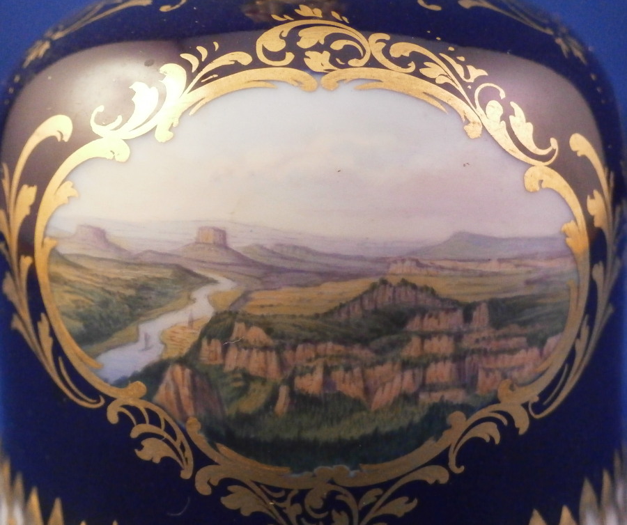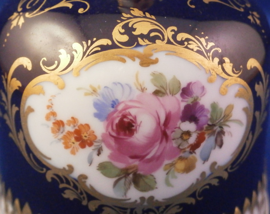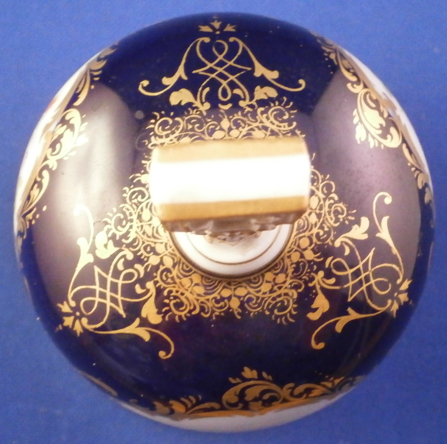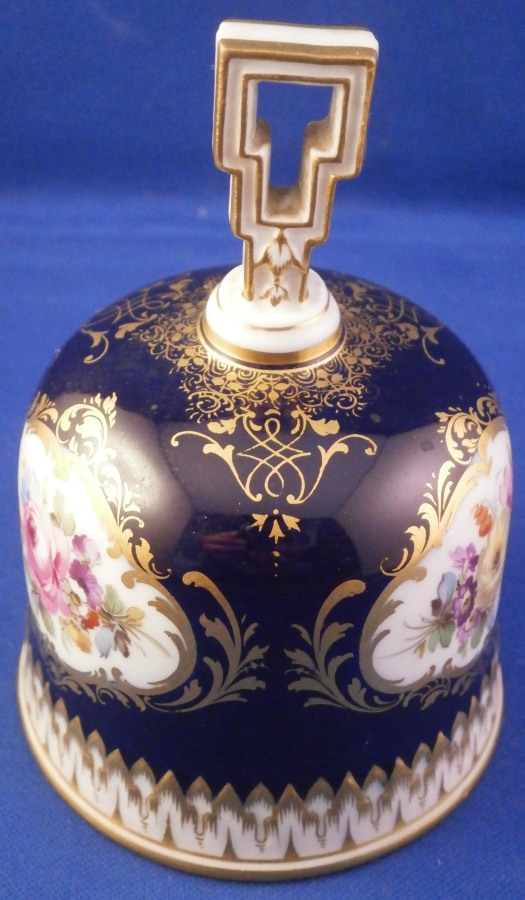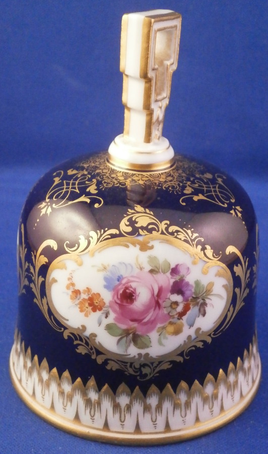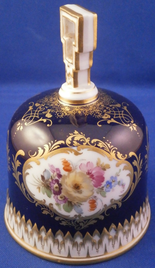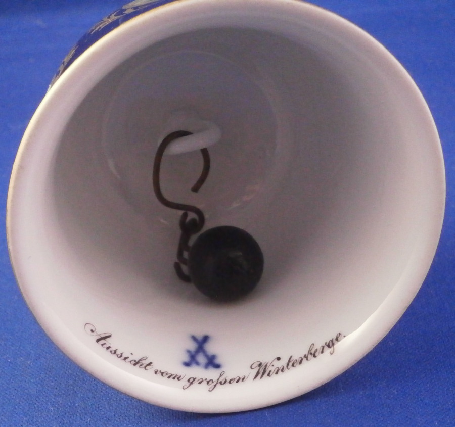 This is a superb bell made by Meissen in the late 19th or early 20th century. It is hand painted with an amazingly detailed scene of an Alpine landscape as well as two flower panels on white ground with the rest of the main body having a cobalt blue ground color highlighted with lots of fancy gilding. The handle is white with gold highlights and the bottom edge is also white with a nice gold trim and a bit of a relief design. The bell is in perfect condition with the clapper metal parts bent a bit which doesn't affect the piece at all. The bell is marked with the under glaze blue crossed swords first choice and the scene title written in black - Aussicht vom grossen Winterberge - view from Grossen Winterberge which you can look up is all the way in the South East of Germany near the Czech border in the Saechsische Schweiz area. The bell is 3.75 inches tall and 2.875 inches in diameter. Please email me for more information or other pictures.