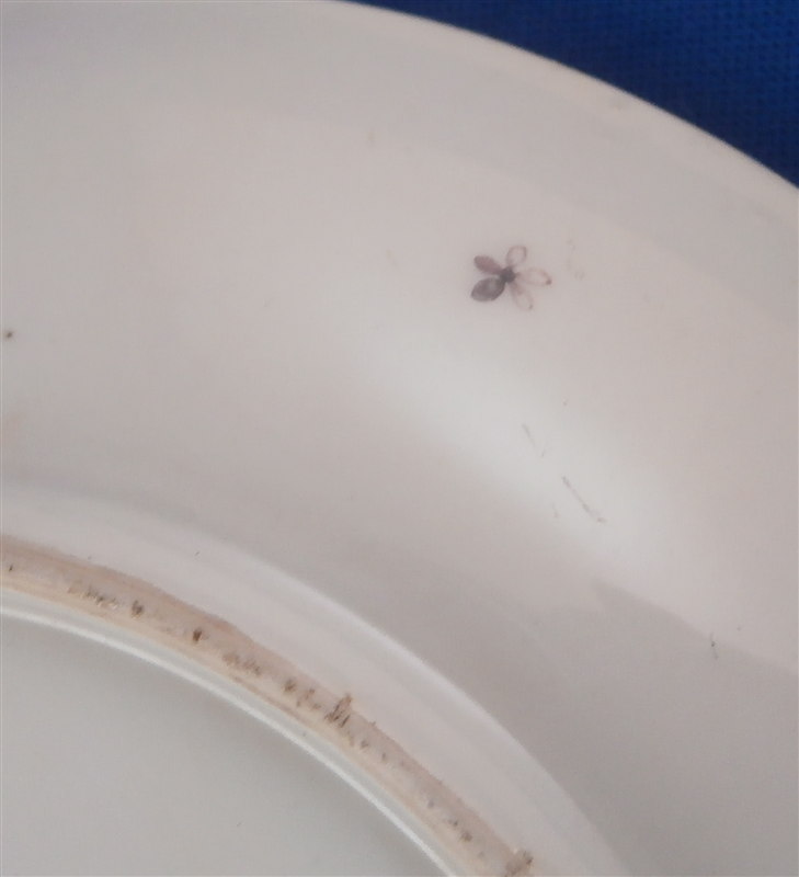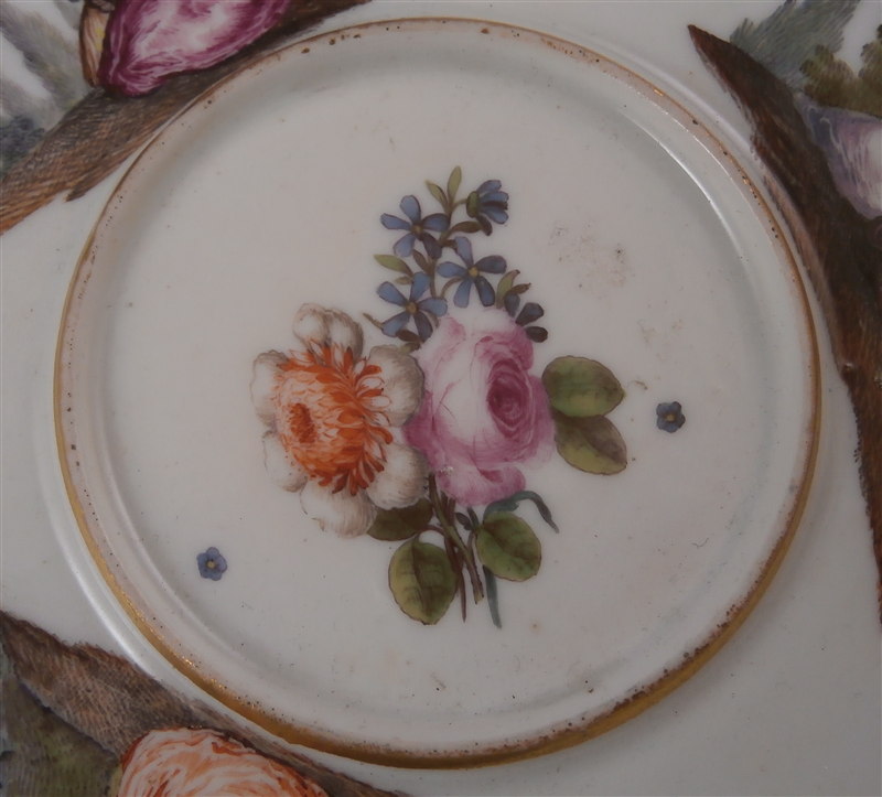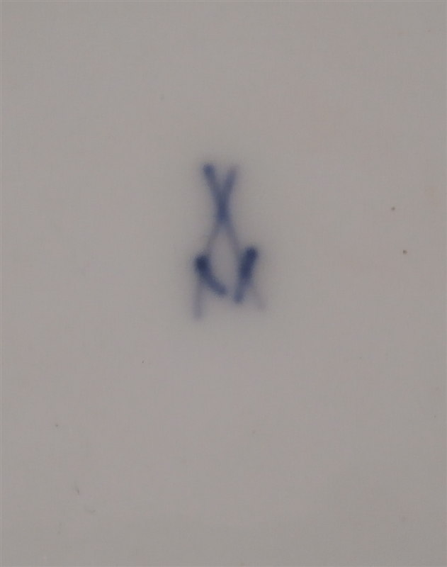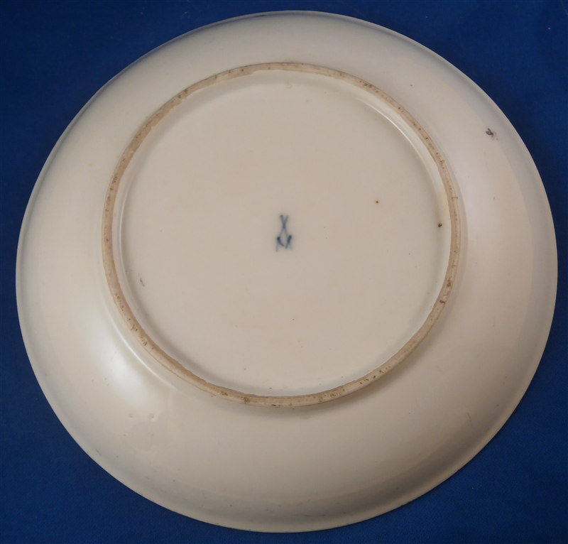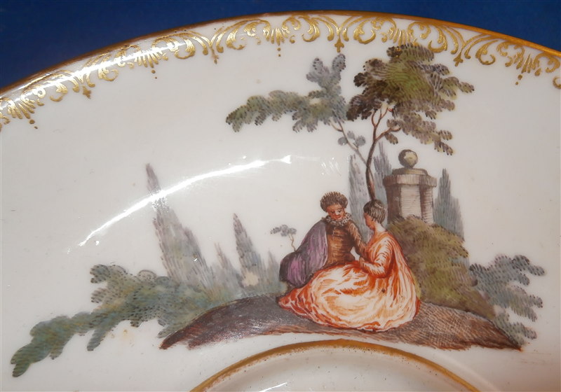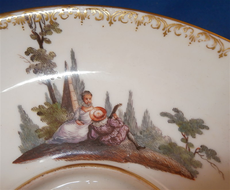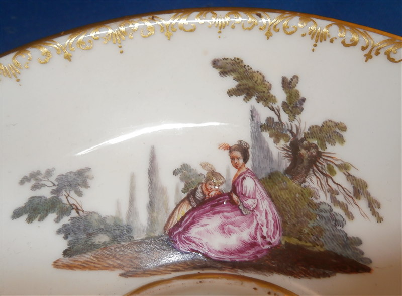 This is a nice early saucer likely for an ecuelle or soup cup made by Meissen in about 1750. The saucer is superbly handpainted with three Watteau scenes including couples in a landscape surrounding as well as a central floral arrangement in the woodcut flower style. Gold trim to the center well edge as well as a nice fancy one to the rim. The saucer is in perfect condition which is always nice! It is 1.125 inches tall and has a diameter of 6.875 inches. It is marked underneath with the underglaze blue crossed swords mark as well as an impressed number 6 by the footring. Please email me for more information or other pictures.