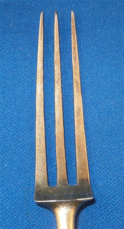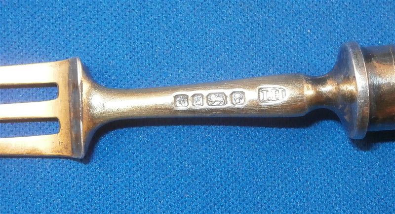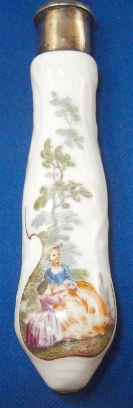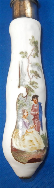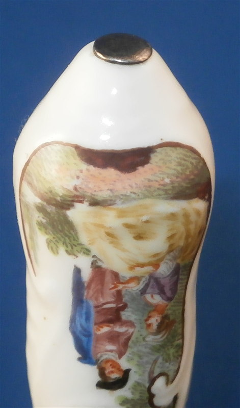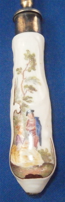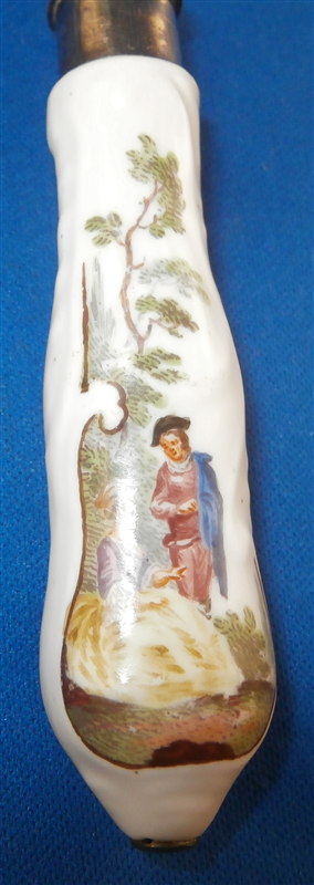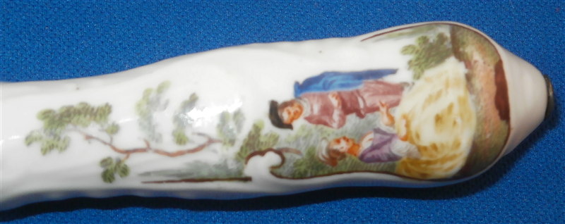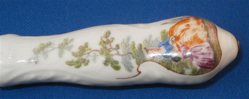 This is a rare fork made by Meissen in about 1750 plus or minus 5 years. Hard to date exactly since the metal parts are a later English replacement but the colors and style are from about 1750 in terms of the porcelain. The handle is nicely modeled with a relief design and handpainted on both the front and the back with a Watteau style scene including two people in a landscape surrounding with a black outline. The ferrule between the handle and the fork itself are made of silver. The silver is nicely marked as shown but I am clueless in that department so I'll leave that to the experts in Silver. The metal part goes into the handle and there is a spot coming out on the other end to fasten it in place which was only done on early pieces! The fork is in superb condition with a tiny bit of wear. The fork is 6.75 inches long of which 2.75 inches is the length of the visible porcelain handle. The handle is about 0.75 inches wide. The porcelain is not marked or shall we say visibly marked since it would be hidden by the ferrule which is normal but it is definitely made by Meissen. Forks are even rarer than knives to find so this is a real treat! Please email me for more information or other pictures.