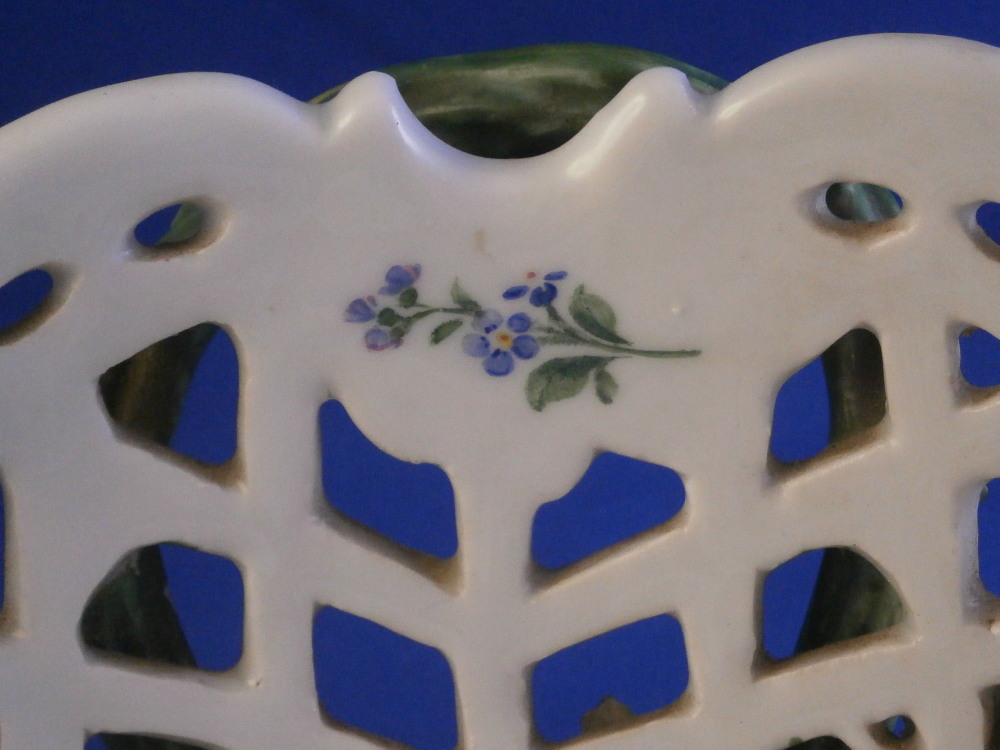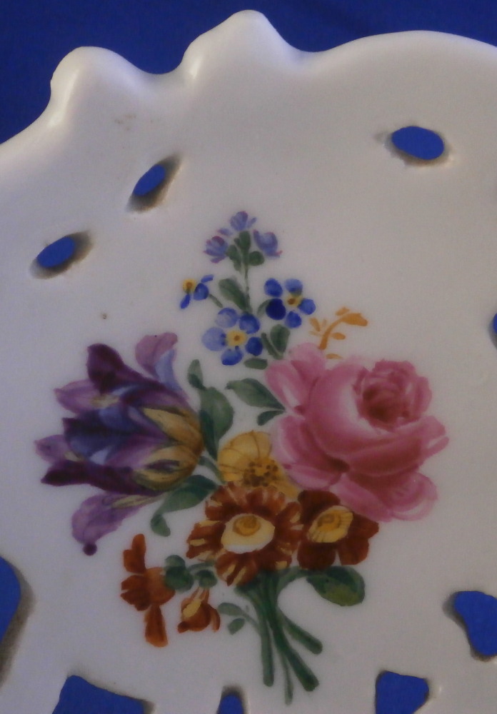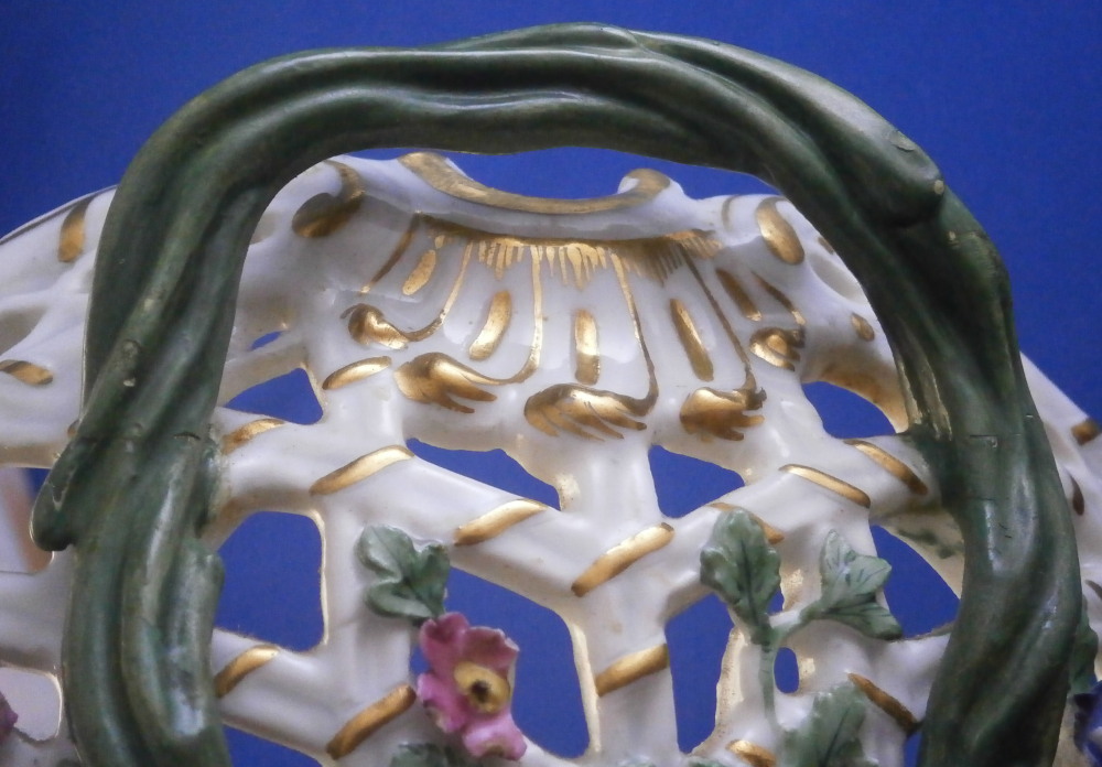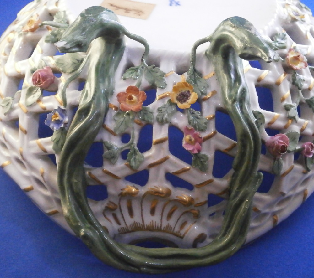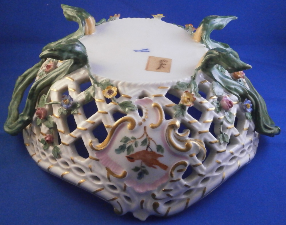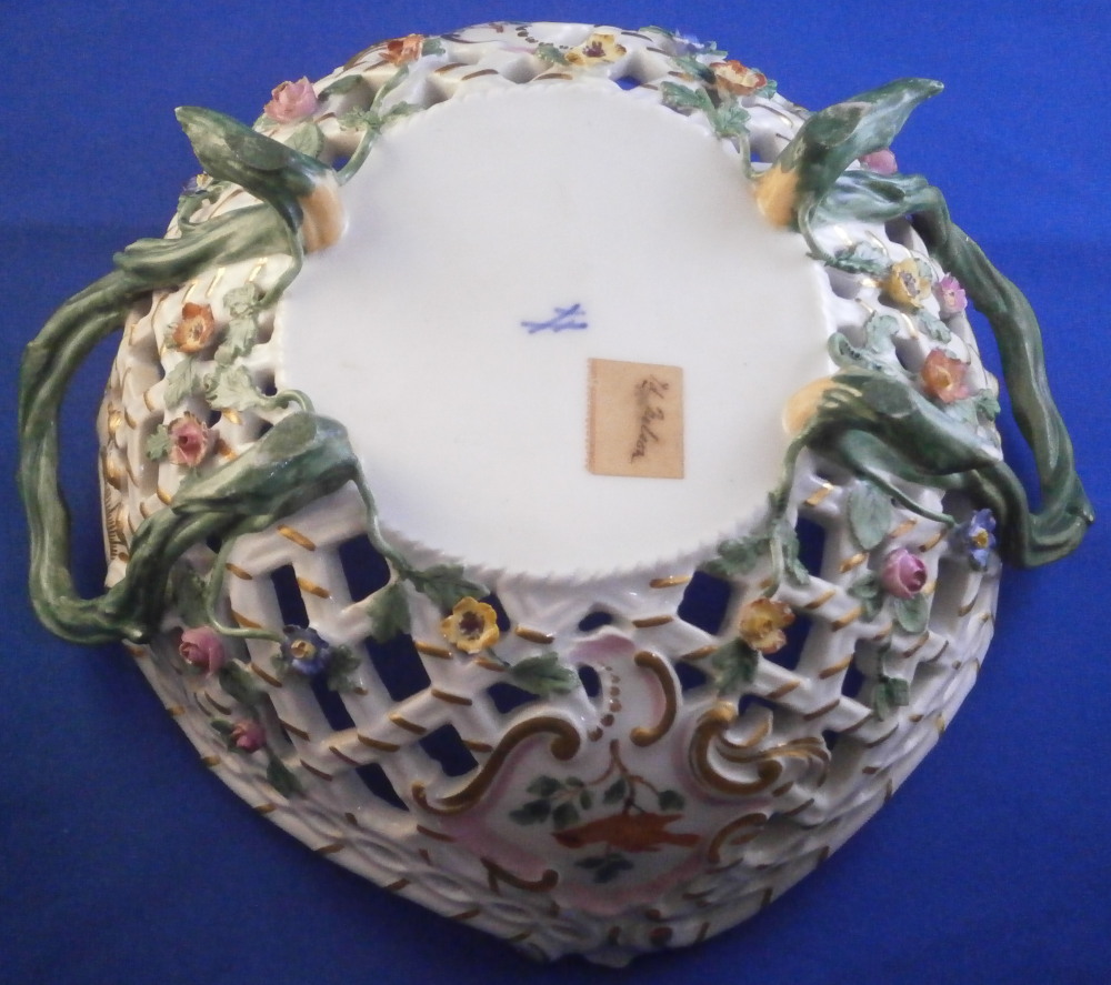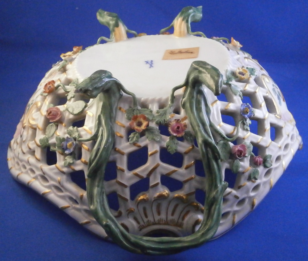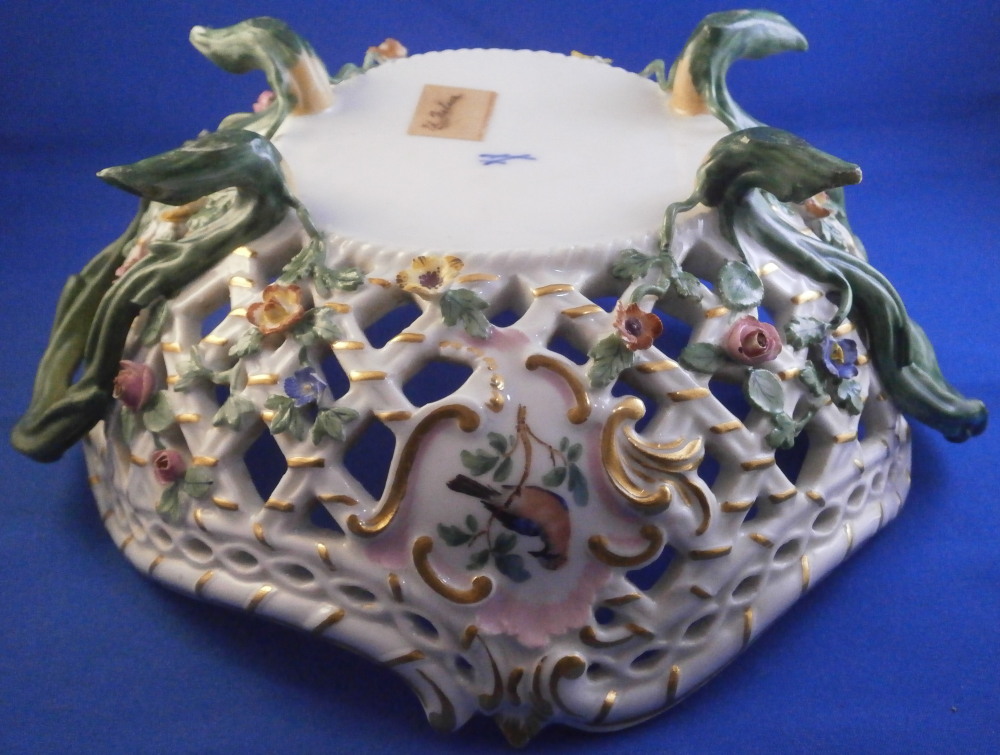 This is a fancy reticulated basket made by Meissen in the early 19th during the so called Schmierzeit. The basket is nicely modeled with the sides heavily reticulate. The inside bottom has a large floral arrangement hand painted on it , there are two smaller floral arrangements along the sides and two small single flowers. Each side has a hand in the shape of a branch that goes down to form the feet. The outside of the basket has a bird scene to the front and the back some gold trim and lots of applied 3D flowers and their leaves coming off the ranch handles. It's a nciely done piece and it looks great! The basket is in good display condition with the usual damage to the applied flowers plus one of the handles was off and has been restored though it was done pretty well and is not visible on display. Some chipping to the ends of the feet. The piece is 4 inches tall, 9 inches wide and 8.625 inches deep. It is marked with the under glaze blue crossed sword mark underneath as well as the usual impressed number as shown. Please email me for more information or other pictures.