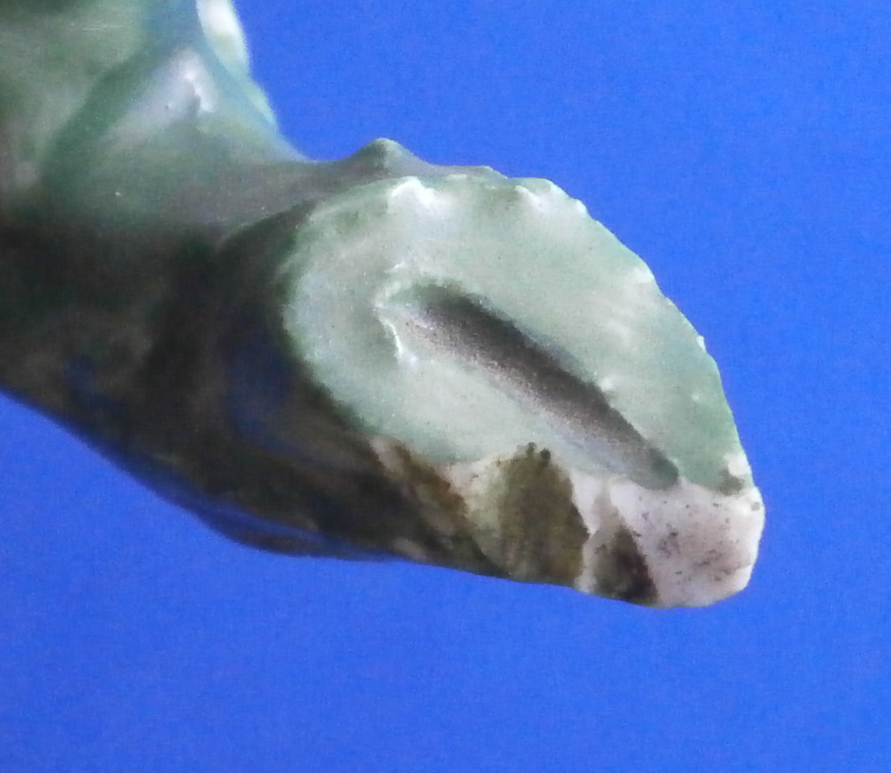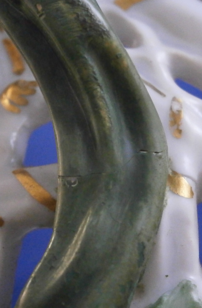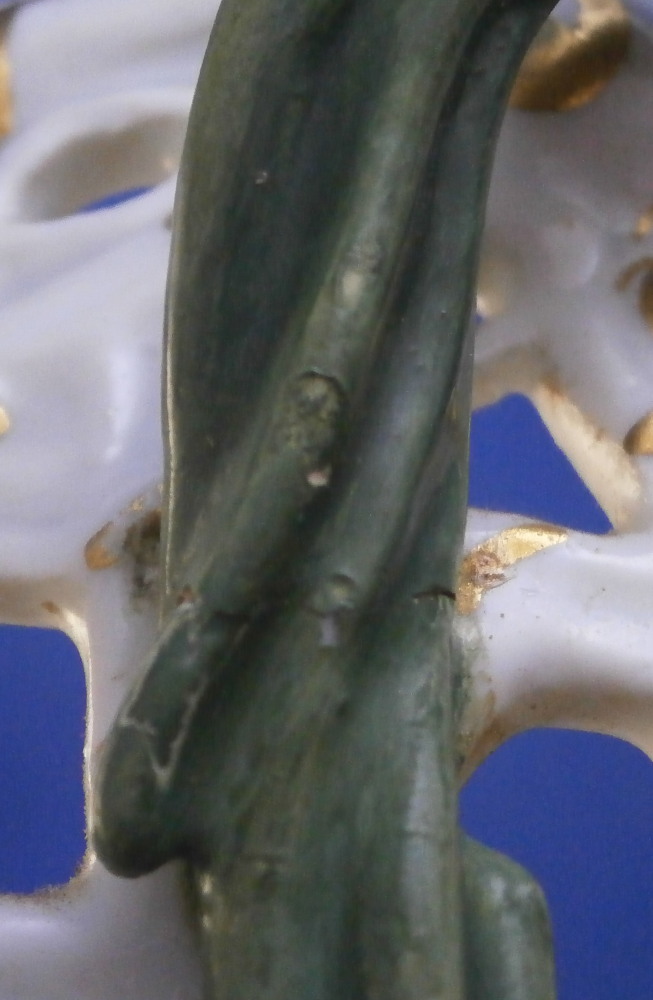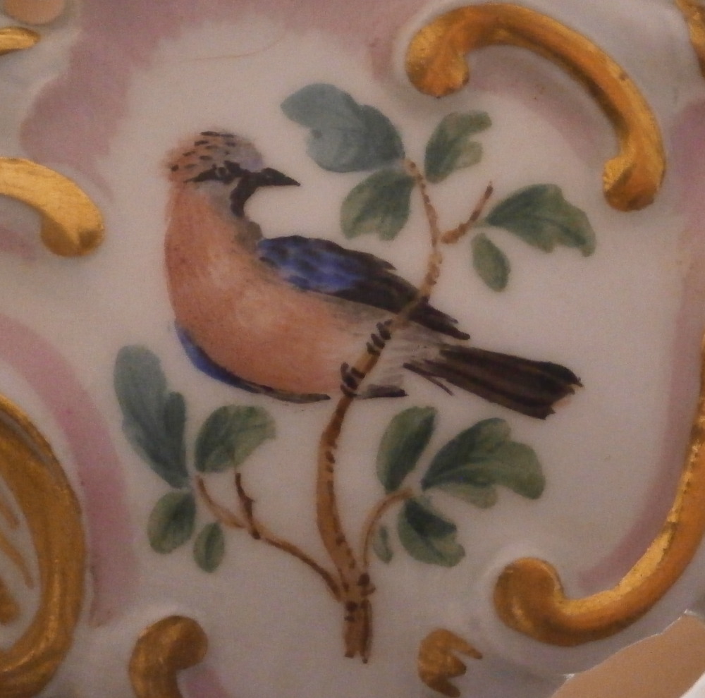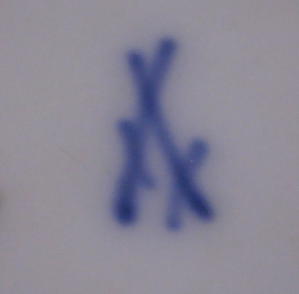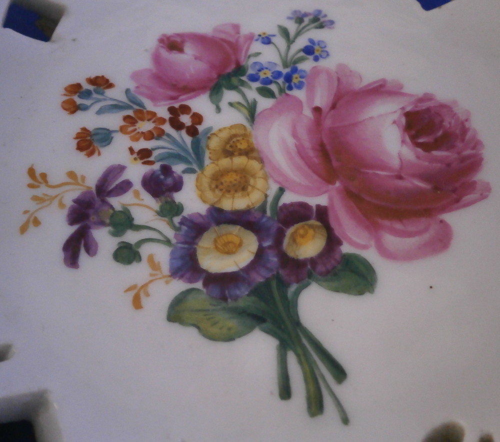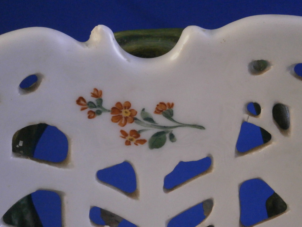 This is a fancy reticulated basket made by Meissen in the early 19th during the so called Schmierzeit. The basket is nicely modeled with the sides heavily reticulate. The inside bottom has a large floral arrangement hand painted on it , there are two smaller floral arrangements along the sides and two small single flowers. Each side has a hand in the shape of a branch that goes down to form the feet. The outside of the basket has a bird scene to the front and the back some gold trim and lots of applied 3D flowers and their leaves coming off the ranch handles. It's a nciely done piece and it looks great! The basket is in good display condition with the usual damage to the applied flowers plus one of the handles was off and has been restored though it was done pretty well and is not visible on display. Some chipping to the ends of the feet. The piece is 4 inches tall, 9 inches wide and 8.625 inches deep. It is marked with the under glaze blue crossed sword mark underneath as well as the usual impressed number as shown. Please email me for more information or other pictures.