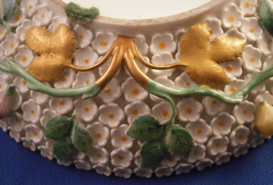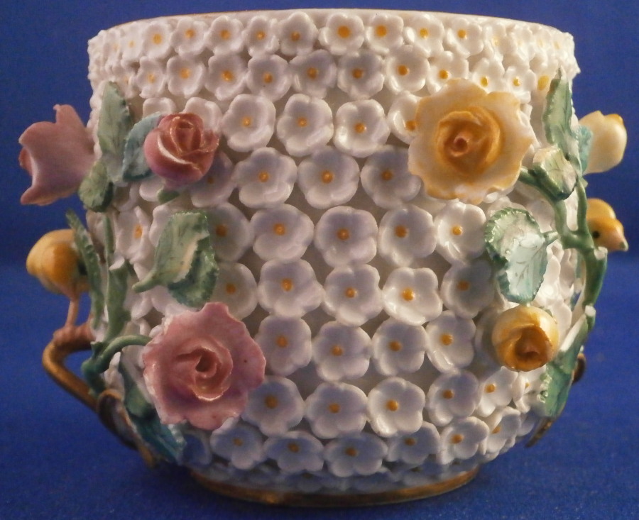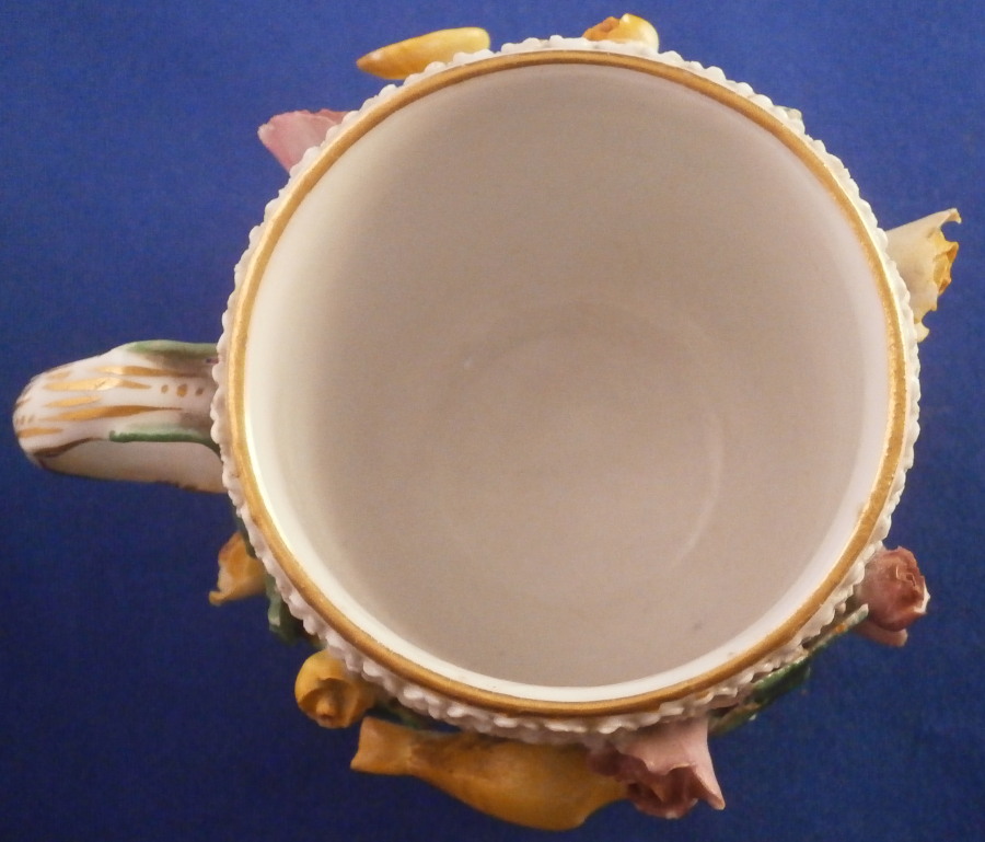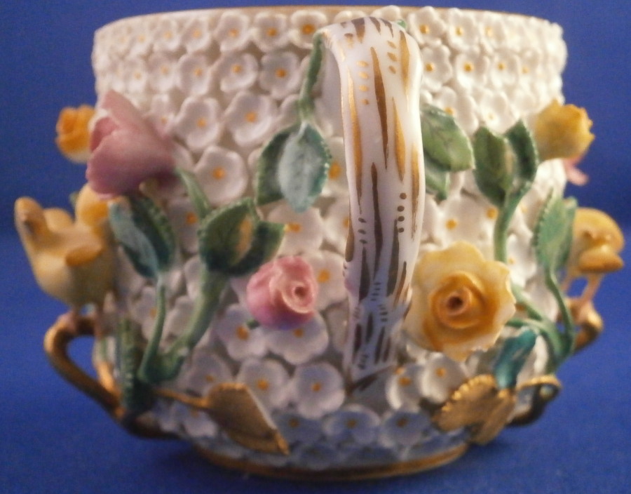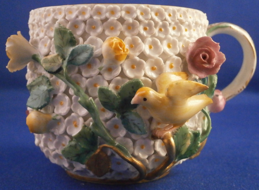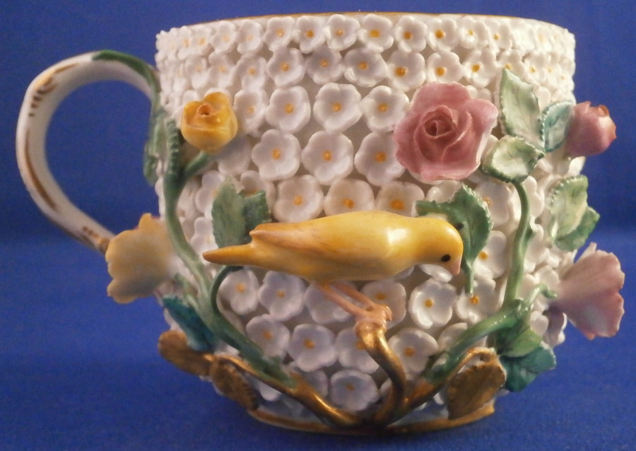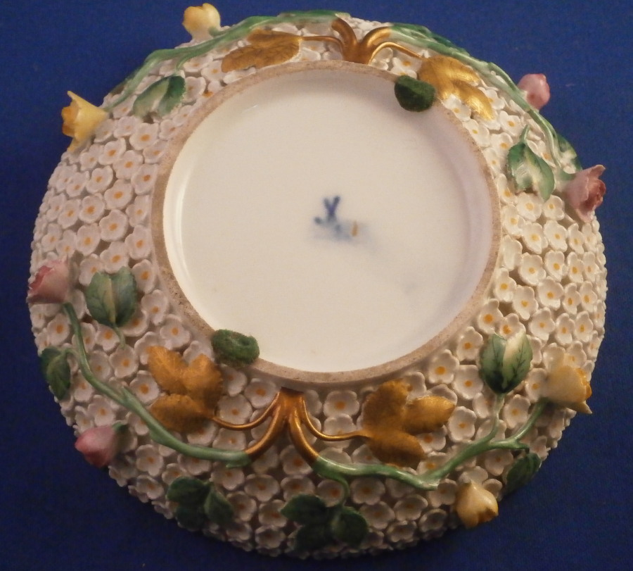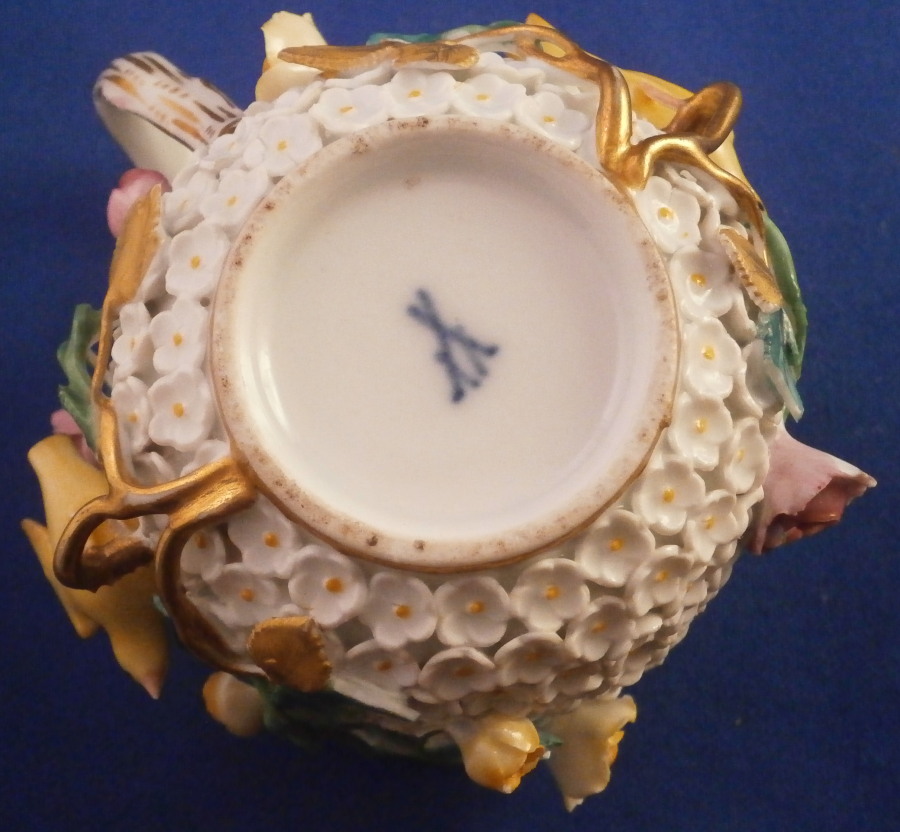 This is a fun cup and saucer made by Meissen in the early to mid 19th century. It is decorated with one of the fanciest and highly collectible designs on any Meissen piece - the famous Schneeballen design after the Schneeballen flower. While this translated means snowballs it is actually name after a kind of flower blossom that is very neat looking I think it is called the snowball bush in English. The tiny blossoms form a round ball and smell nice, too. The tiny flowers that make up the ball is were this design comes from. This version here is the lidless version. It never had a lid or it would ahve the slightly rough inside edge to the cup which it does not. The whole cup outside as well as the saucer underside rim are covered with the small blossoms then on top of that you have rose blossoms and in the case of the cup canaries, the rims have a gold trim and the top of the saucer has the scattered small flowers. A superb example of this style! A bit overloaded for my taste but apparently I am in the minority with that as people go crazy for these pieces. The main bodies of the cup and saucer are in perfect condition without any cracks, chips, wear, etc. The one bird is missing a piece of its tail, the other one is perfect as well. The snowball blossoms look to be in good shape as well but there is one on the saucer that has a tiny chip you can find if you look for it. The flowers and leaves that are applied on top of the white blossoms have some damage and that is always the case. There are four chipped leaves on the cup, some chipping to some flowers only one of which is a decent size the rest are very minor nibbles. 8 of the tiny vines connecting the larger vines to the leaves/ or flwoers are missing. The saucer bottom is in great shape as well with only a few minor nibbles to the flowers and no chipped leaves but 5 little vine pieces are missing. Both pieces are marked with the underglaze blue crossed swords mark underneath which look to be from the late Schmierzeit which explains why the one on the saucer is smudged a bit. Quite typical of this period and it is why it is named this way. Impressed numbers on both piece though it is very faint on the cup. The cup is 2.375 inches tall and 2.5 inches in diameter (not including all the decoration on the outside!). The saucer is a bit over 1.25 inches tall and 5.125 inches in diameter. Please email me for more information or other pictures.