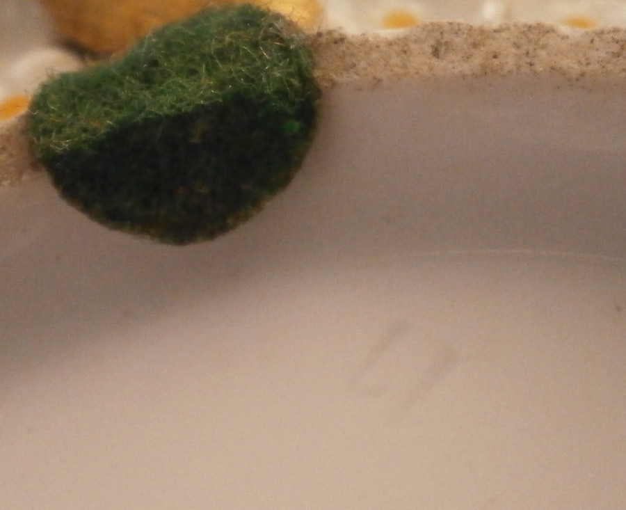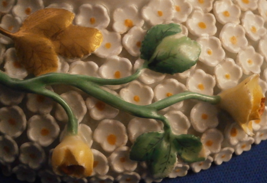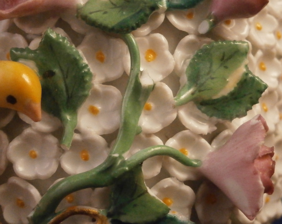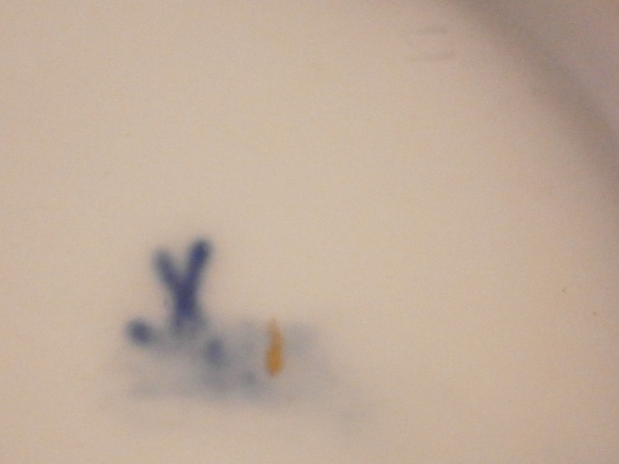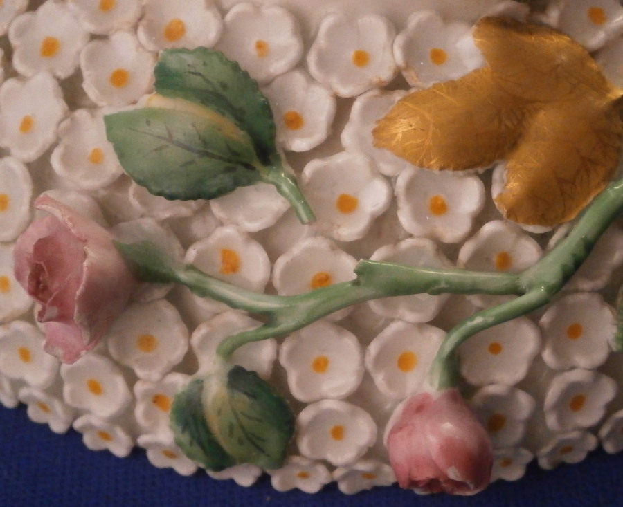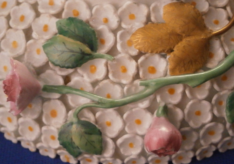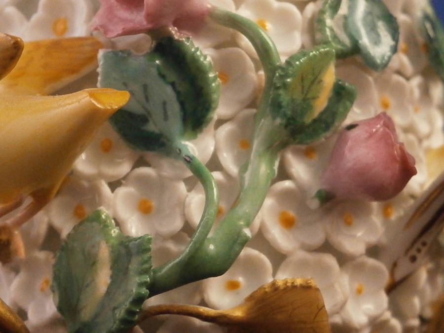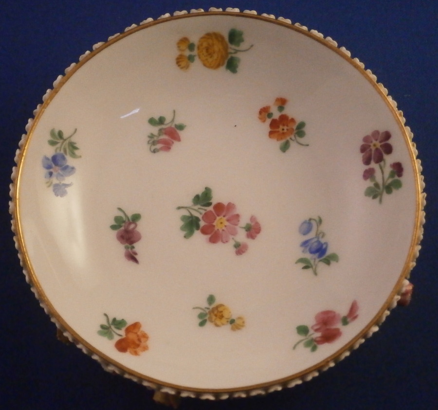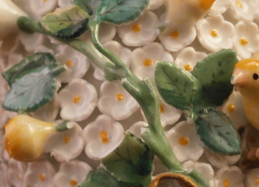 This is a fun cup and saucer made by Meissen in the early to mid 19th century. It is decorated with one of the fanciest and highly collectible designs on any Meissen piece - the famous Schneeballen design after the Schneeballen flower. While this translated means snowballs it is actually name after a kind of flower blossom that is very neat looking I think it is called the snowball bush in English. The tiny blossoms form a round ball and smell nice, too. The tiny flowers that make up the ball is were this design comes from. This version here is the lidless version. It never had a lid or it would ahve the slightly rough inside edge to the cup which it does not. The whole cup outside as well as the saucer underside rim are covered with the small blossoms then on top of that you have rose blossoms and in the case of the cup canaries, the rims have a gold trim and the top of the saucer has the scattered small flowers. A superb example of this style! A bit overloaded for my taste but apparently I am in the minority with that as people go crazy for these pieces. The main bodies of the cup and saucer are in perfect condition without any cracks, chips, wear, etc. The one bird is missing a piece of its tail, the other one is perfect as well. The snowball blossoms look to be in good shape as well but there is one on the saucer that has a tiny chip you can find if you look for it. The flowers and leaves that are applied on top of the white blossoms have some damage and that is always the case. There are four chipped leaves on the cup, some chipping to some flowers only one of which is a decent size the rest are very minor nibbles. 8 of the tiny vines connecting the larger vines to the leaves/ or flwoers are missing. The saucer bottom is in great shape as well with only a few minor nibbles to the flowers and no chipped leaves but 5 little vine pieces are missing. Both pieces are marked with the underglaze blue crossed swords mark underneath which look to be from the late Schmierzeit which explains why the one on the saucer is smudged a bit. Quite typical of this period and it is why it is named this way. Impressed numbers on both piece though it is very faint on the cup. The cup is 2.375 inches tall and 2.5 inches in diameter (not including all the decoration on the outside!). The saucer is a bit over 1.25 inches tall and 5.125 inches in diameter. Please email me for more information or other pictures.