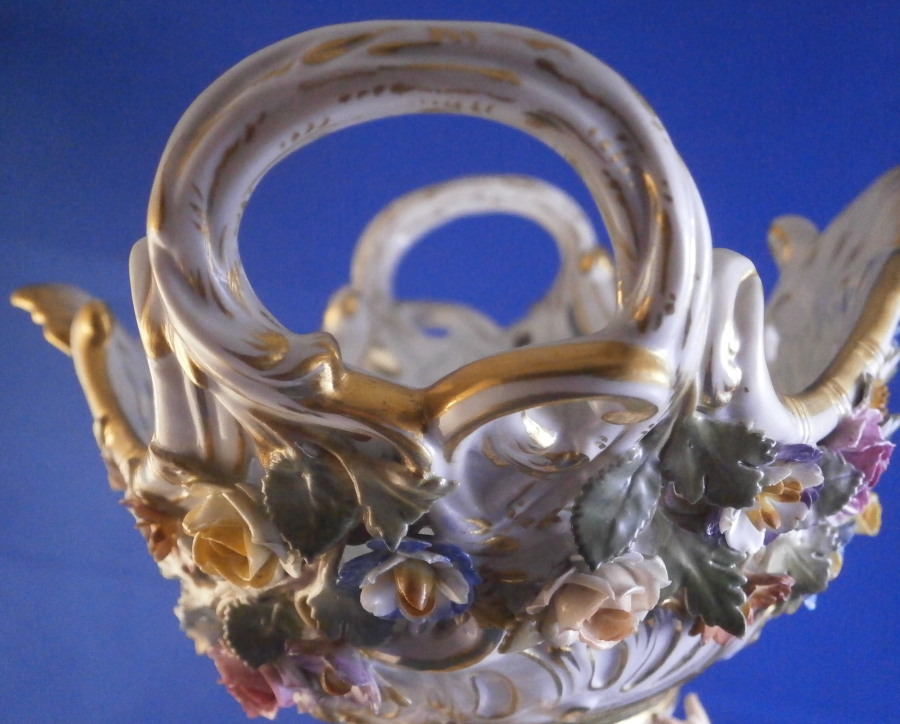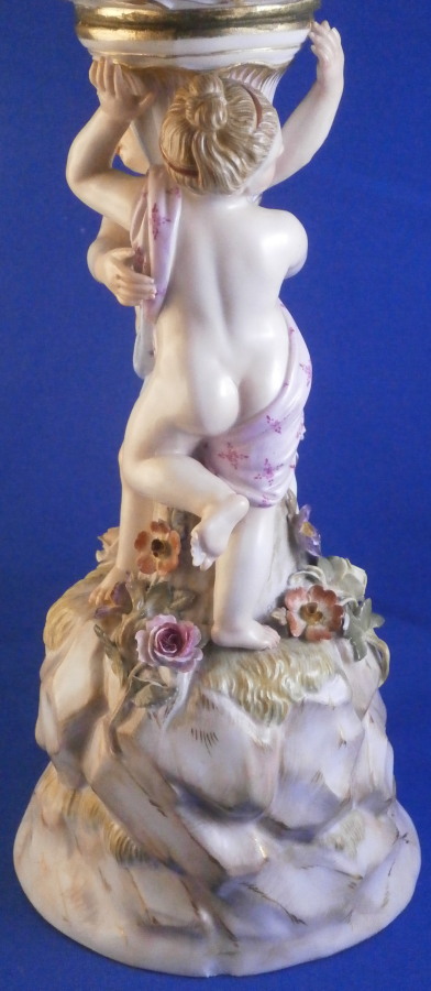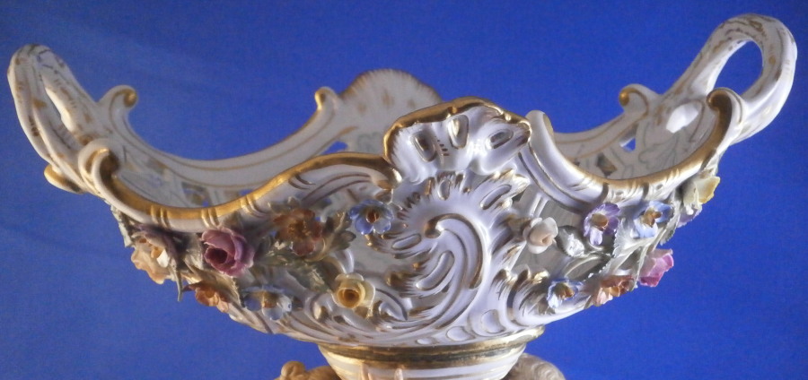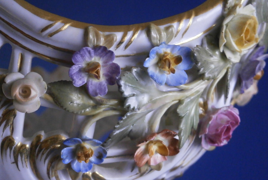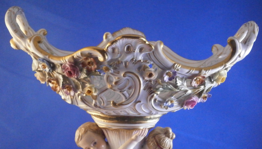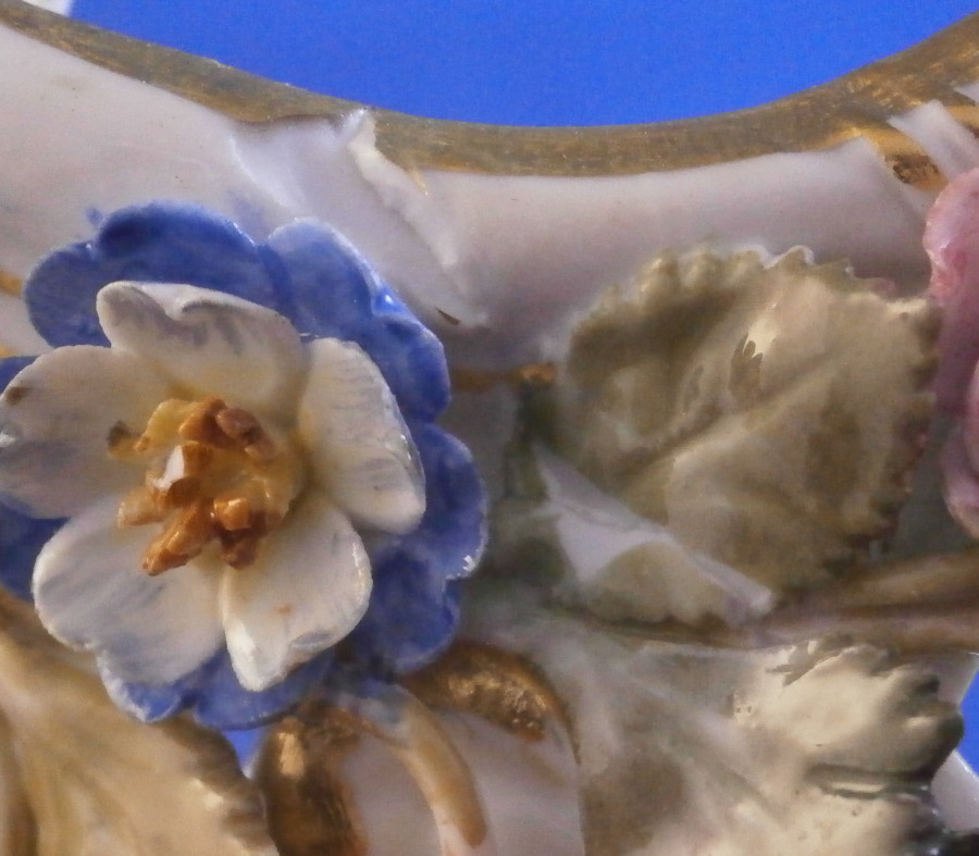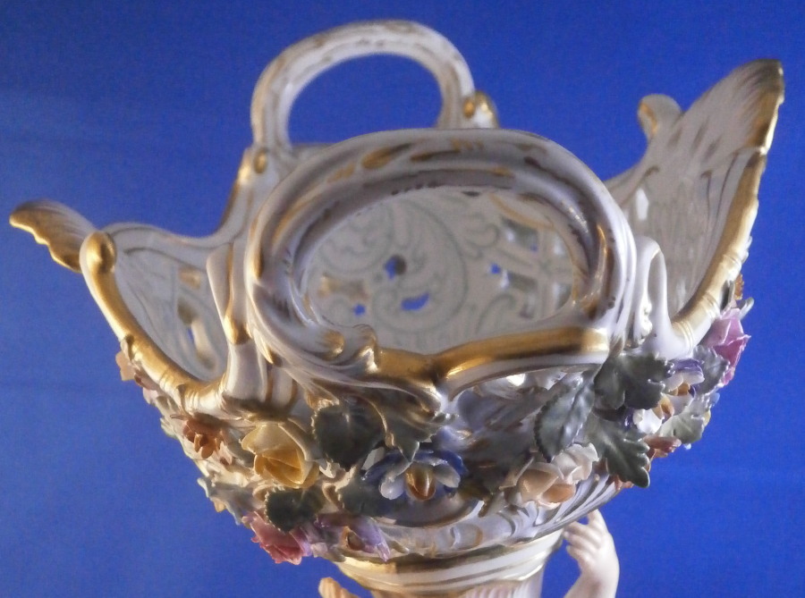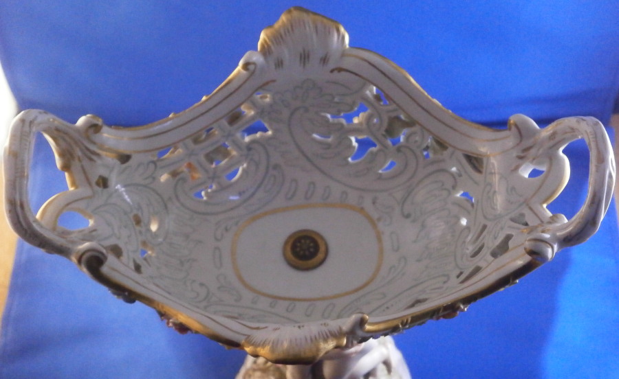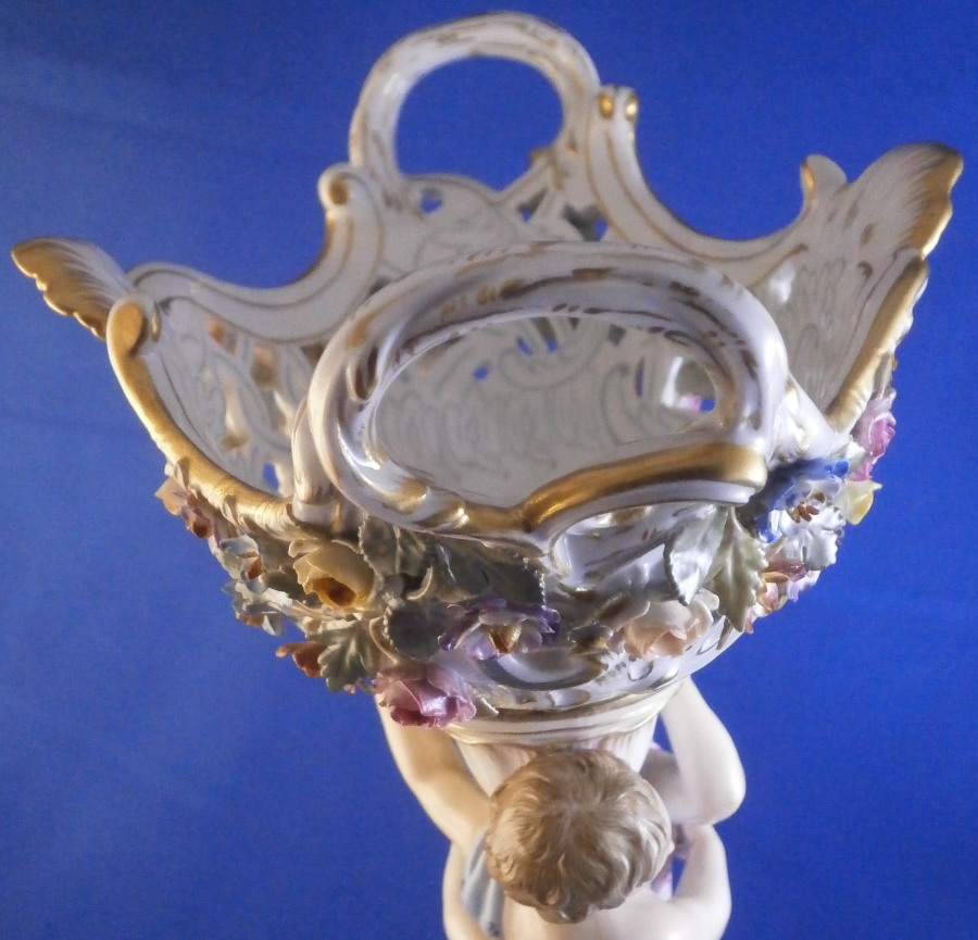 This is a rare figural pedestal dish made by Meissen in the later 19th century. It's a gorgeous piece with the base having some rocks along the bottom with applied flowers to it. The center is a tree trunk that a male and a female putti are embracing with the top being a nicely reticulated bowl with a handle to each side and lots of applied vines with flowers and leaves. A very fancy piece with lots of gold highlights to the details. The inside of the bowl has details pained to it in a bluish grey color. The bowl part is held together with the base with a long metal rod with a decorative top. I am sure some sort of glue is involved at the joint as well. The piece displays nicely bu is not withoutflaw as one could expect given the fragile nature and size. There are some chips to the flowers and leaves on the base (nothing major really), a firing crack to the front only of the neck of the male putto, a chip to the underside toes of the female's upper foot which is not obvious from the front, just a little bit of damage to the applied flower of the basket (very minor), two chips to the edge of the base of which one is mostly glazed over and from when it was made and a crack to the edge of the basket as shown. That is the only damage that matters I think. It is more of a hairline where a piece came outin the front or that is where it got knocked and the hairline went from there. It's not bad and the peice really display nicely! It is rather large being 11.5 inches tall with the bowl being 8 inches wide and 5.5 inches deep. The base is about 4.25 inches by 4.125 inches. The compote is marked underneath with the under glaze blue crossed swords mark with one cut in it because of the firing crack issue in the neck of the male. It also has the usual impressed and incised marks as shown. Please email me for more information or other pictures.