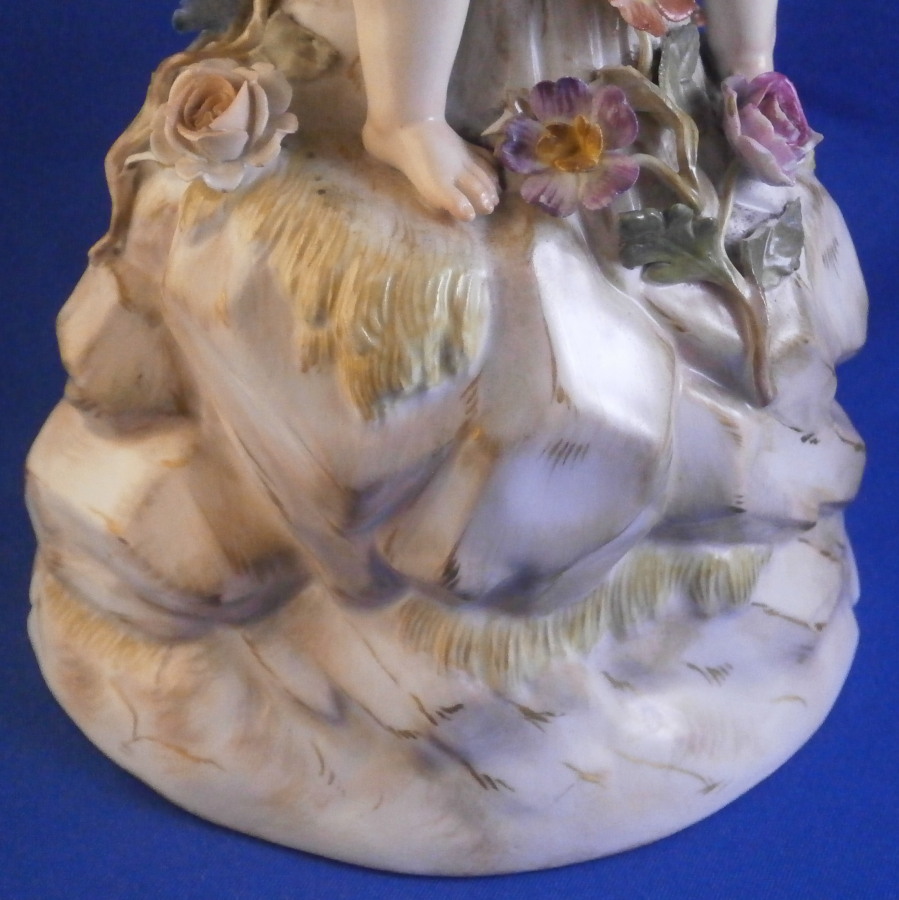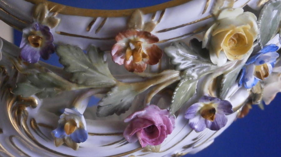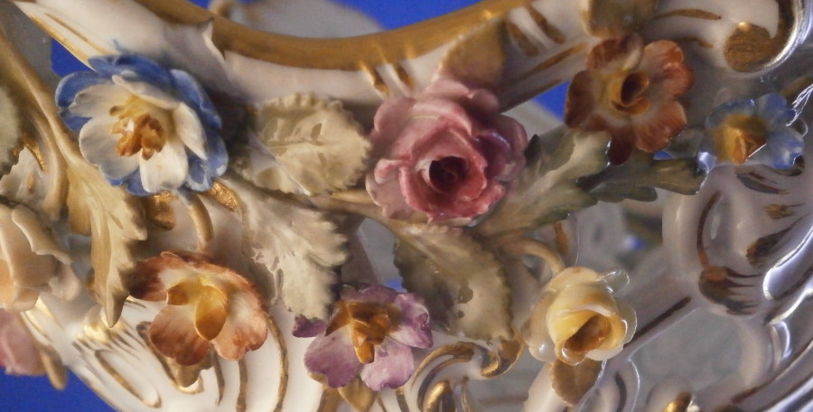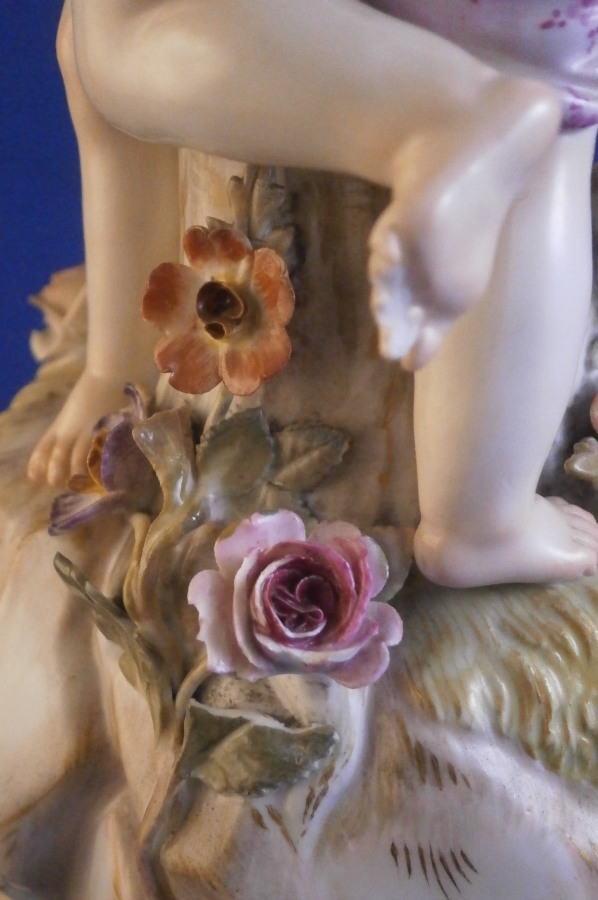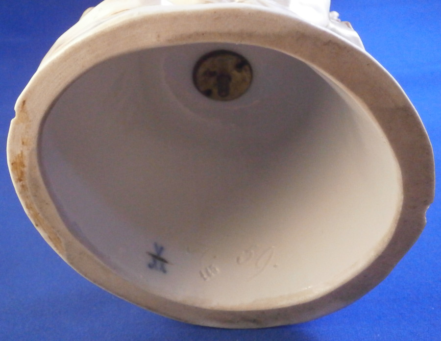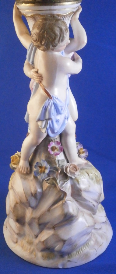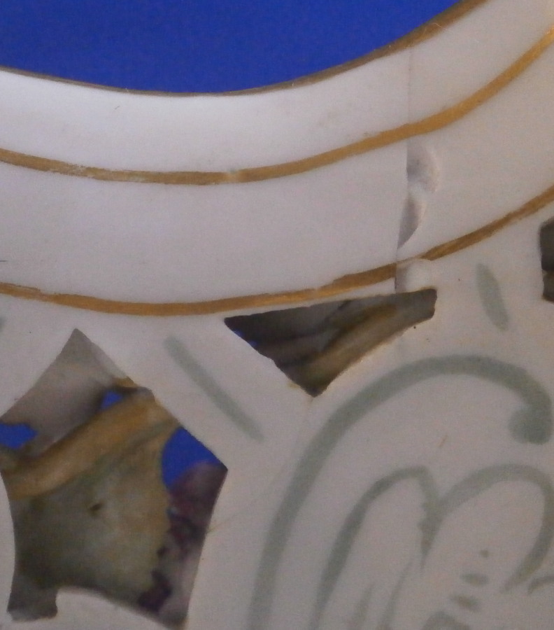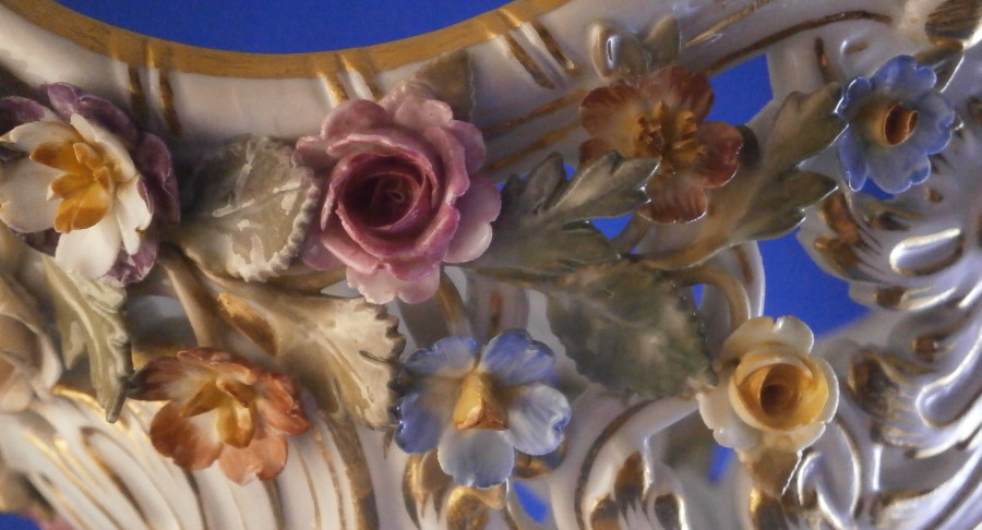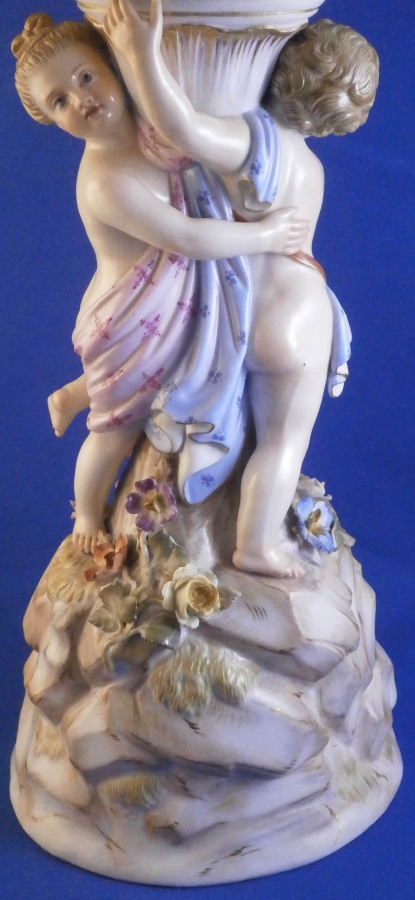 This is a rare figural pedestal dish made by Meissen in the later 19th century. It's a gorgeous piece with the base having some rocks along the bottom with applied flowers to it. The center is a tree trunk that a male and a female putti are embracing with the top being a nicely reticulated bowl with a handle to each side and lots of applied vines with flowers and leaves. A very fancy piece with lots of gold highlights to the details. The inside of the bowl has details pained to it in a bluish grey color. The bowl part is held together with the base with a long metal rod with a decorative top. I am sure some sort of glue is involved at the joint as well. The piece displays nicely bu is not withoutflaw as one could expect given the fragile nature and size. There are some chips to the flowers and leaves on the base (nothing major really), a firing crack to the front only of the neck of the male putto, a chip to the underside toes of the female's upper foot which is not obvious from the front, just a little bit of damage to the applied flower of the basket (very minor), two chips to the edge of the base of which one is mostly glazed over and from when it was made and a crack to the edge of the basket as shown. That is the only damage that matters I think. It is more of a hairline where a piece came outin the front or that is where it got knocked and the hairline went from there. It's not bad and the peice really display nicely! It is rather large being 11.5 inches tall with the bowl being 8 inches wide and 5.5 inches deep. The base is about 4.25 inches by 4.125 inches. The compote is marked underneath with the under glaze blue crossed swords mark with one cut in it because of the firing crack issue in the neck of the male. It also has the usual impressed and incised marks as shown. Please email me for more information or other pictures.