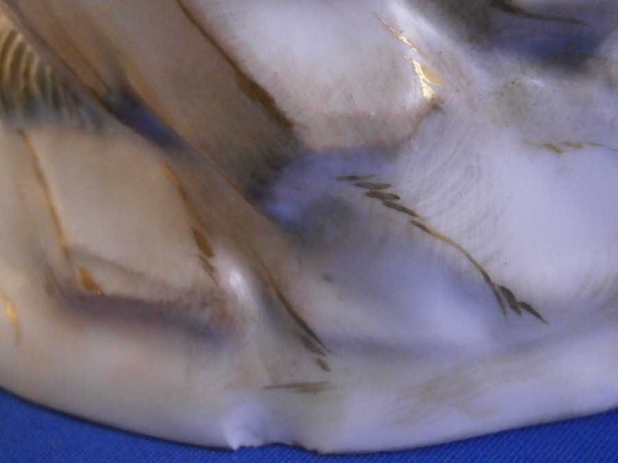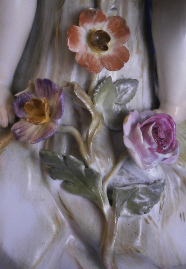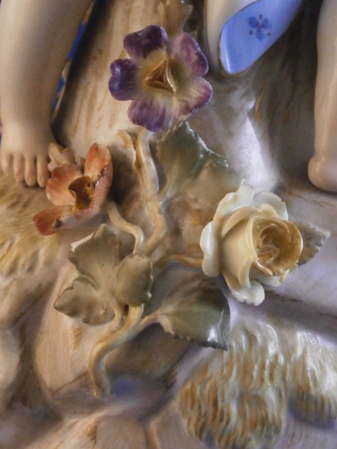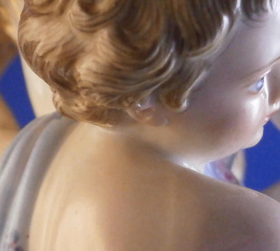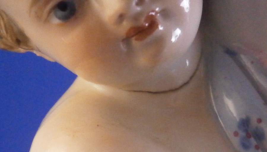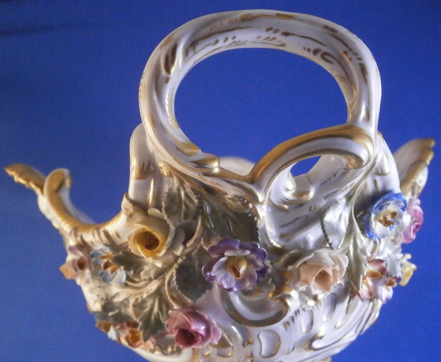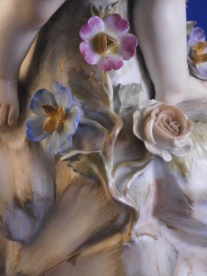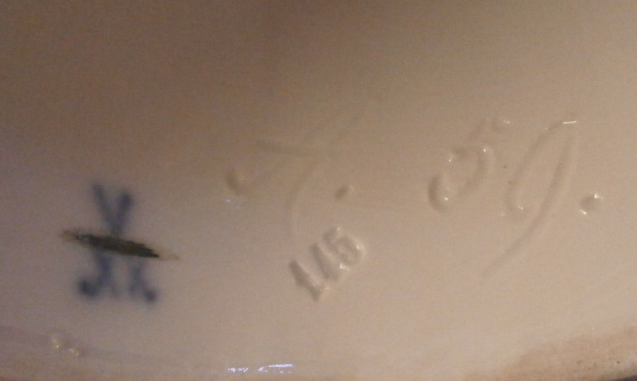 This is a rare figural pedestal dish made by Meissen in the later 19th century. It's a gorgeous piece with the base having some rocks along the bottom with applied flowers to it. The center is a tree trunk that a male and a female putti are embracing with the top being a nicely reticulated bowl with a handle to each side and lots of applied vines with flowers and leaves. A very fancy piece with lots of gold highlights to the details. The inside of the bowl has details pained to it in a bluish grey color. The bowl part is held together with the base with a long metal rod with a decorative top. I am sure some sort of glue is involved at the joint as well. The piece displays nicely bu is not withoutflaw as one could expect given the fragile nature and size. There are some chips to the flowers and leaves on the base (nothing major really), a firing crack to the front only of the neck of the male putto, a chip to the underside toes of the female's upper foot which is not obvious from the front, just a little bit of damage to the applied flower of the basket (very minor), two chips to the edge of the base of which one is mostly glazed over and from when it was made and a crack to the edge of the basket as shown. That is the only damage that matters I think. It is more of a hairline where a piece came outin the front or that is where it got knocked and the hairline went from there. It's not bad and the peice really display nicely! It is rather large being 11.5 inches tall with the bowl being 8 inches wide and 5.5 inches deep. The base is about 4.25 inches by 4.125 inches. The compote is marked underneath with the under glaze blue crossed swords mark with one cut in it because of the firing crack issue in the neck of the male. It also has the usual impressed and incised marks as shown. Please email me for more information or other pictures.