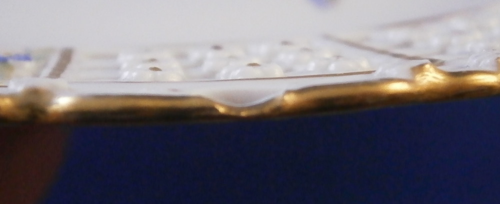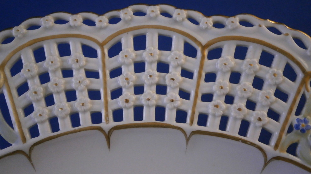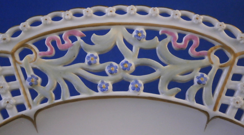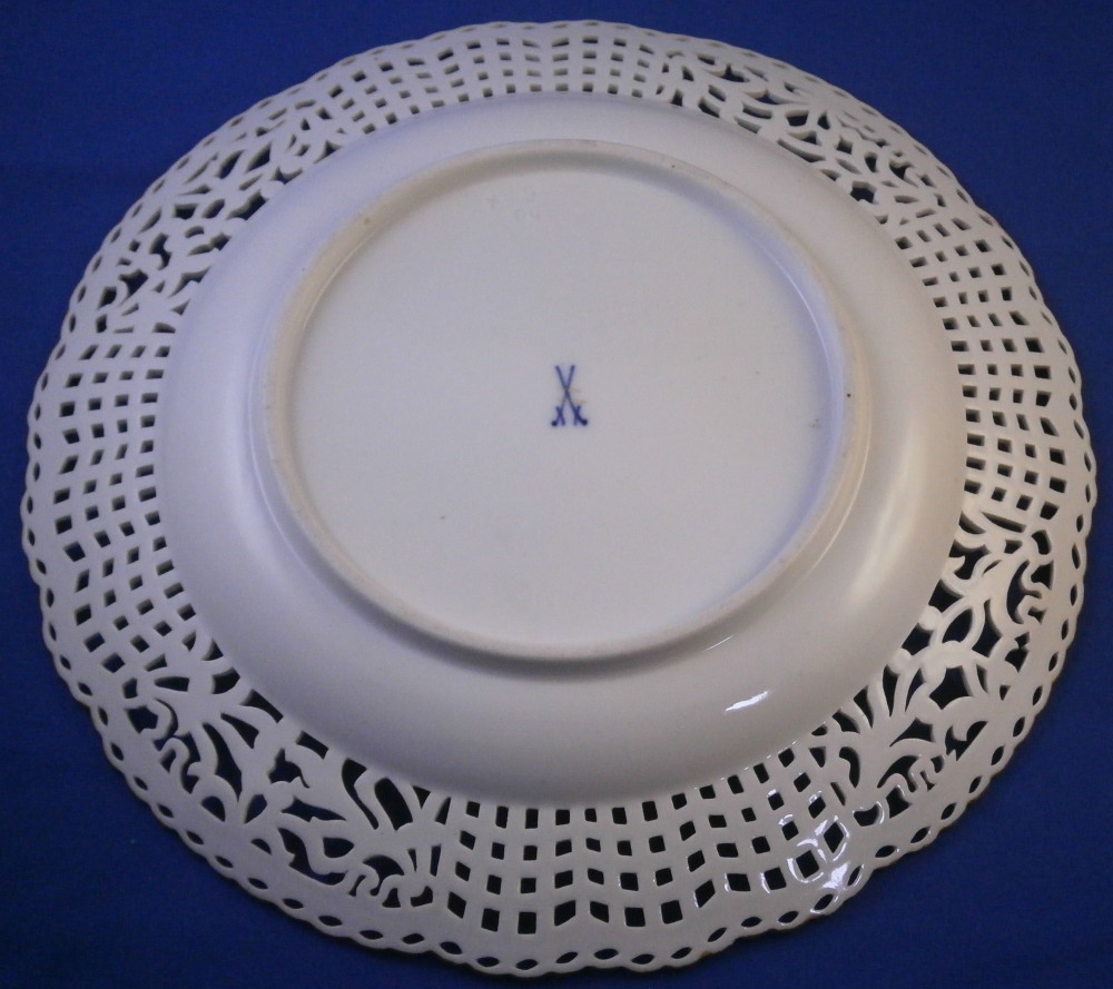 This is a really nice plate made by Meissen in the later 19th century. The plate has a nicely reticulated rim to it with four sections of flowers with leaves and a pink ribbon rim and four panels of reticulation with tiny raised flowers at the intersections. The edge has a reticulated design to it of little arches with more of the raised flowers. Nice gold trim highlights. The center of the plate just has a simple yet elegant floral arrangement to it as well as two single small flowers. It's a really pretty plate! The plate is in perfect condition but was deemed a second choice piece because of a smear of green paint on the leaf of the rose and a in the making chip to the very edge which was glazed and gilded over. Neither takes away from the piece at all and it looks amazing! It is marked with the under glaze blue crossed swords mark with two cuts across it as shown and the usual impressed marks and a paitner's number. The plate is 1.125 inches tall and 9.375 inches in diameter. I rarely buy second choice pieces but sometimes you come across one that is just too nice to pass up - so here it is :) Please email me for more information or other pictures.
