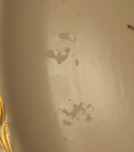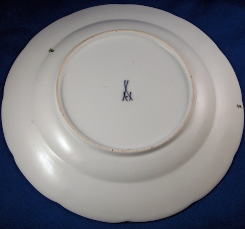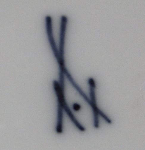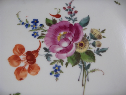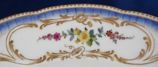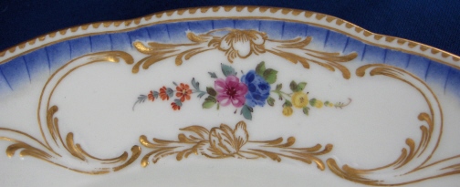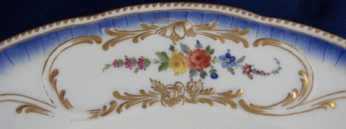 This is a fun porcelain bowl made by Meissen around 1765. It is handpainted with a large floral arrangement in the center with three small flowers / leaves in the bowl part, three superb cartouches with floral designs on the rim surrounded by some nice gilding and a funky blue rim trim that somehow reminds me of Sevres - not sure why :) Gold trim to the edge. This is a really elegant and decorative piece and quite unusual to find. The piece is in great condition with a little wear to a spot or two. There are some ground spts in the white area of the bowl which were done at the factory to hide firing imperfections. It displays perfectly! The dish is 1 inch tall and 9.5 inches in diameter. Marked underneath with the underglaze blue crossed swords with the dot between the bottom parts as well as an impressed L and a gold script painters mark on the footring. There are two leaves on the underside of the rim to hide imperfections. Please email me for more information or other pictures.