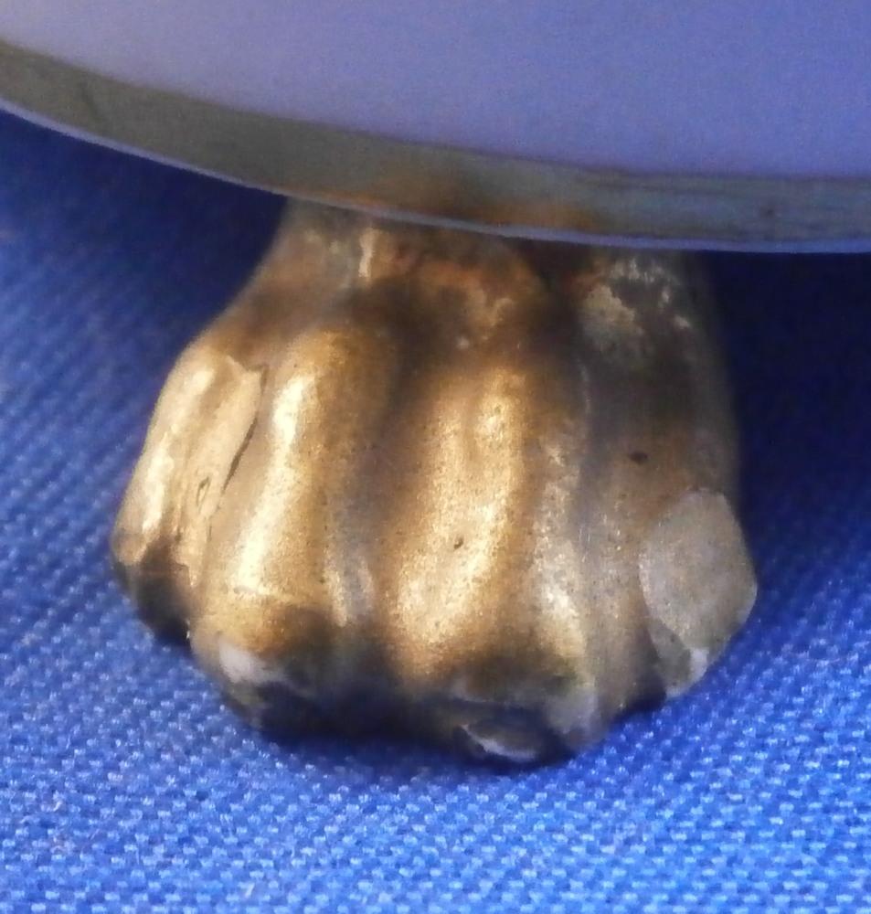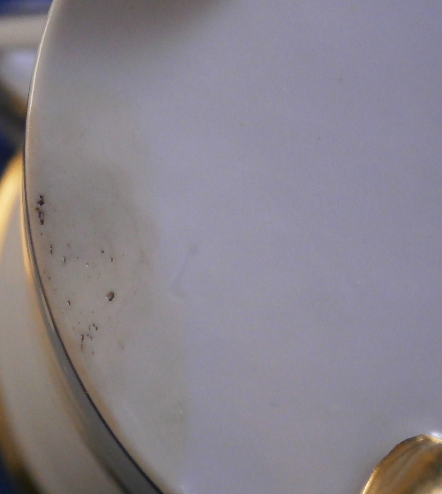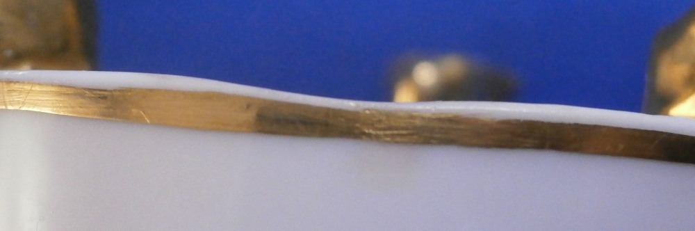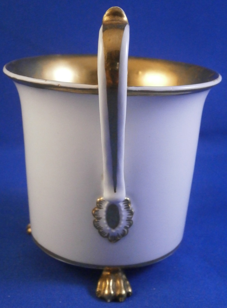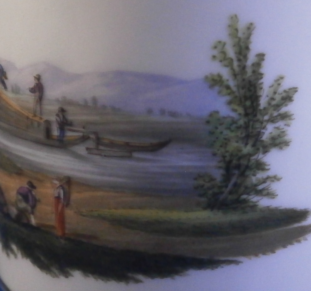 This is a fun cup made by Meissen in in the late 18th to early 19th century. This Roman numeral I mark was a way to identify different types of porcelain pastes and was used from the around 1774 until 1815. The cup is hand painted with a really nice scene depicting people in a landscape surrounding including a a large tree and a building in the background plus off course a few people and a large and a small boat on a river. The cup ists on three claw feet which is always a nice addition plus it has a nice handle shape to it. The feet are gilded, the handle has some gold trim to it and the inside of the cup is gilded about an 0.75 inches down. A well done piece that looks amazing. Just needs a simple saucer with a gold trim to complete a set or it works perfectly well on its own the way it is. The piece is in great condition with the claw feet having some chips as shown. The underside edge has had a chip ground down and painted over which has yellowed a bit over time. Not obvious when on display and it really looks great even with these minor issues. I showed the side view in that spot and as you can see it is very minor. The cup is 2.75 inches tall (plus the handle sticks up another 0.75 inches) and has a diameter of 2.875 inches with the feet sticking out a bit as well from that. The piece is marked underneath with the under glaze blue crossed swords, the Roman numeral I as well as the usual impressed numbers. Please email me for more information or other pictures.