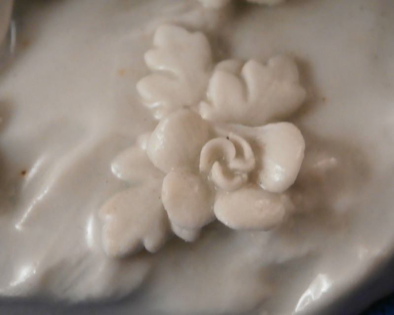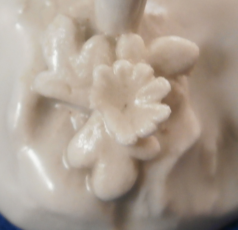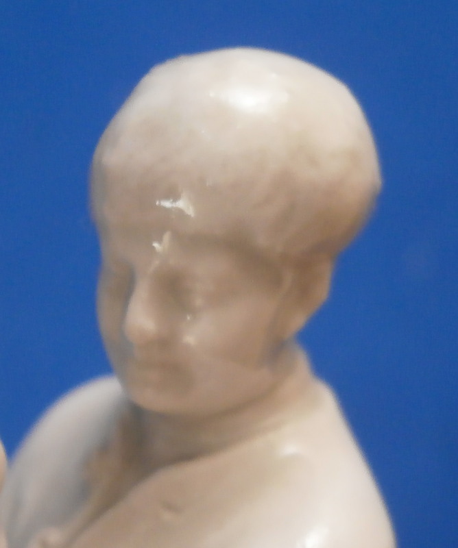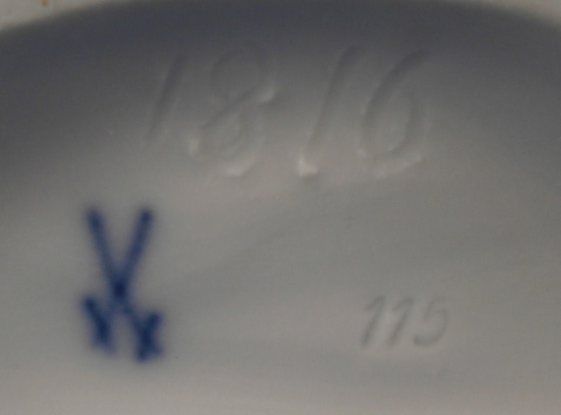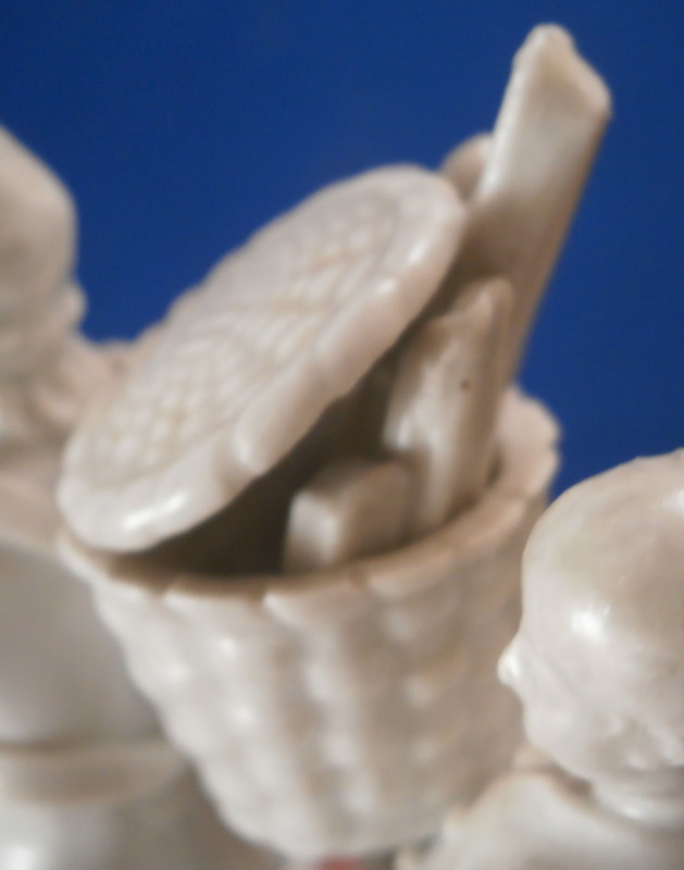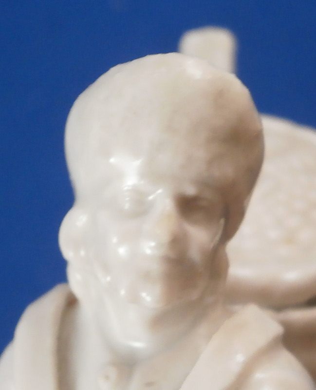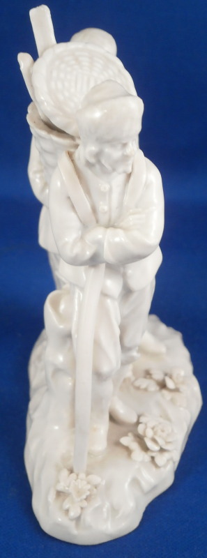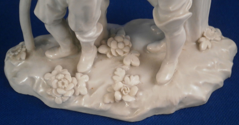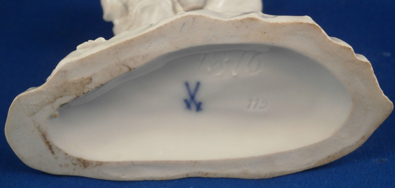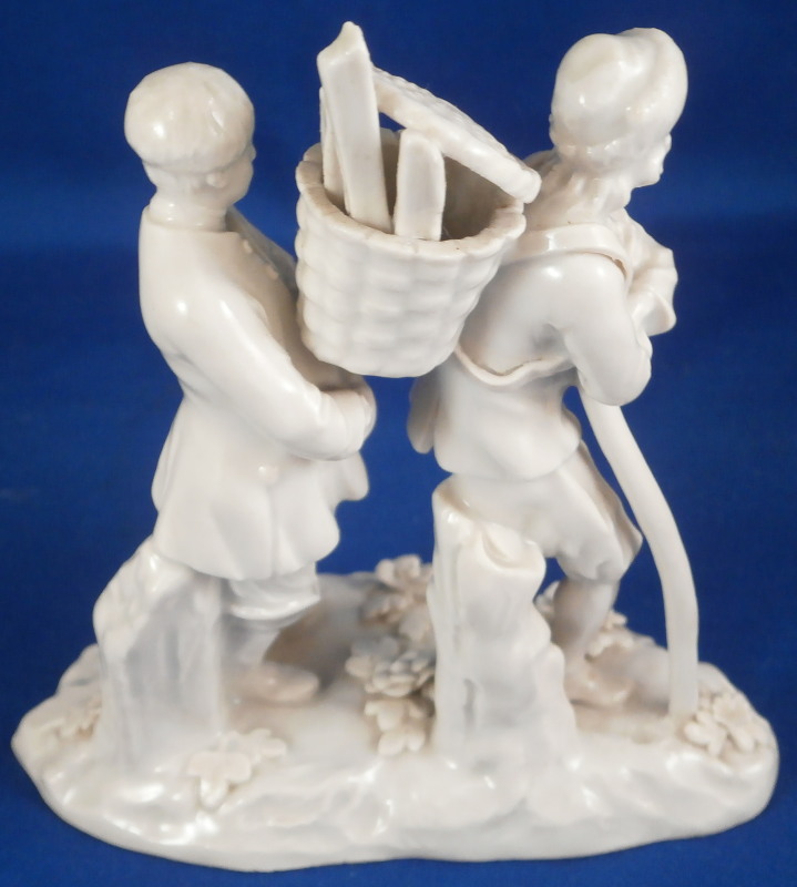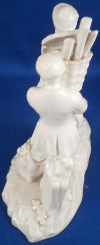 This is a small blanc de chine figurine made by Meissen in the 20th century. I am not quite sure what this figure is supposed to represent but it is very well modeled with a ton of detail. There are two figures that look Russian to me. One has a woven basket with its lid on his back filled with something - might be bread but I doubt it. The other figure is following the first. Both are standing on a nice base with lots of flowers on it. The detail is very nice for a small piece like this but again I am not sure what this model is. The figurine is in great condition with some minor damage to two flowers as shown. The figurine is 3.75 inches tall, 3.75 inches long and 1.875 inches deep. It is marked with the under glaze blue crossed swords mark underneath the base as well as an impressed 115 and incised 1816. Not a common model as I could not find this one when I searched for it. Please email me for more information or other pictures.