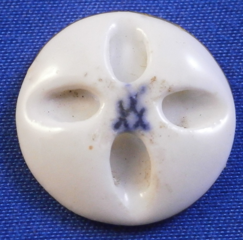 This is a fourth very rare small button made by Meissen in the 19th century. It is the type you could attach using the four holes in the back so it is tighter than the ones with just one loop. Not something you see often at all and I have six of them so if you'd like more than one here is a rare chance to complete your unique project for the Meissen crazy collector :) The front of the button is hand painted with a superb polychrome floral arrangement on white ground with a gold trim to the edge. The back has four oval holes to it which you can get the string through to attach it securely and tightly. A fairly flat button that is only about 0.125 inches thick with a diemter of just over 0.75 inches. The porcelain is marked underneath with the blue swords mark as shown - 1st quality with the area around it ground flat because of how it was fired which is normal. The button is in perfect condition just like the day it was made. It displays perfectly and looks super elegant plus I have rarely ever seen this style and if you are in need of a few this is probably your only chance to get them for a long time. Please email me for more information or other pictures.