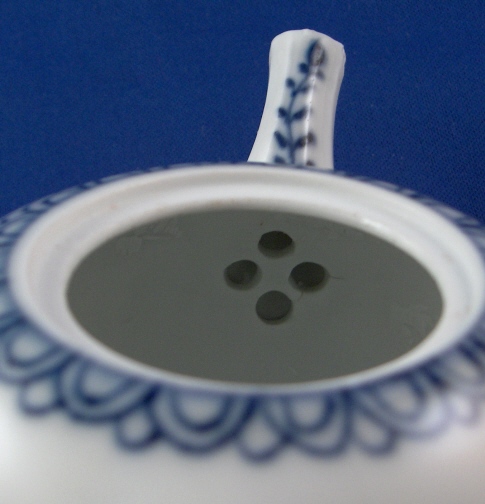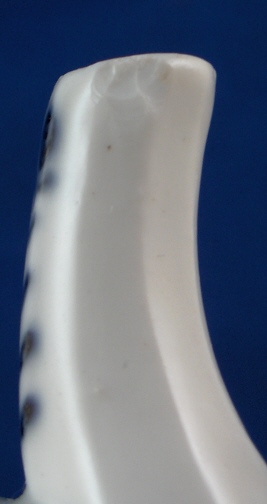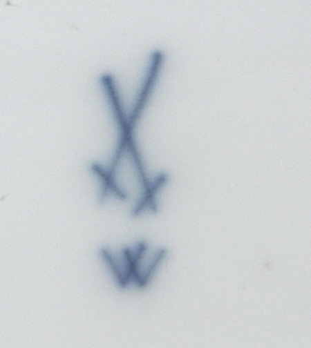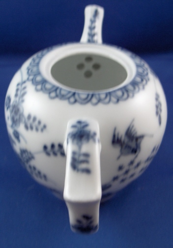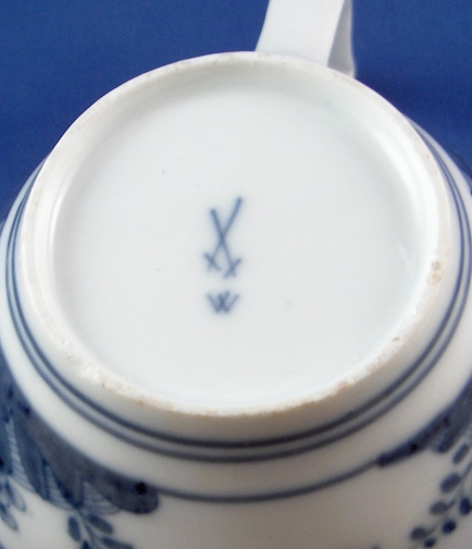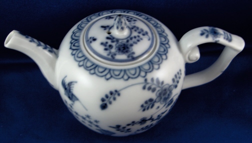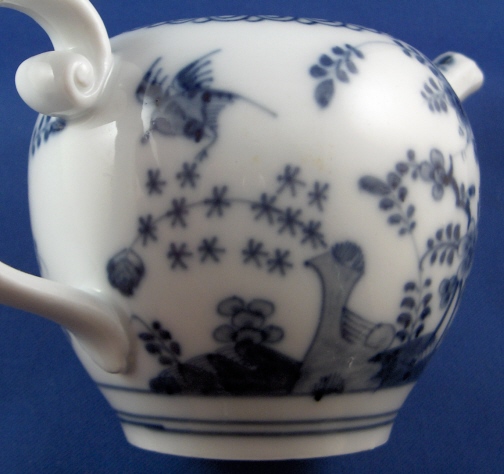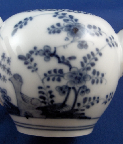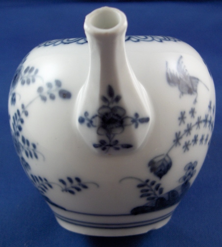This is a rare early miniature teapot with its proper lid made by Meissen in about 1740. The pot is handpainted in underglaze blue with the Fels und Vogel (Rock and bird) pattern that is quite nice. Marked with the straight blue crossed swords to the bottom with a W underneath as a blue painters mark. It is in great condition with a some shallow chipping to the left side of the spout (when looking at the tip straight on) and one chip to the footring that is glazed over and thus original to the making. None of this takes away from the piece at all when on display or any other time. The pot is 3.625 inches tall, 3.75 inches wide and 6.5 inches long. Please email me for more information or other pictures.