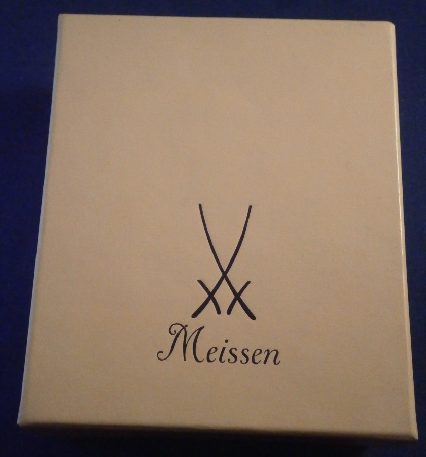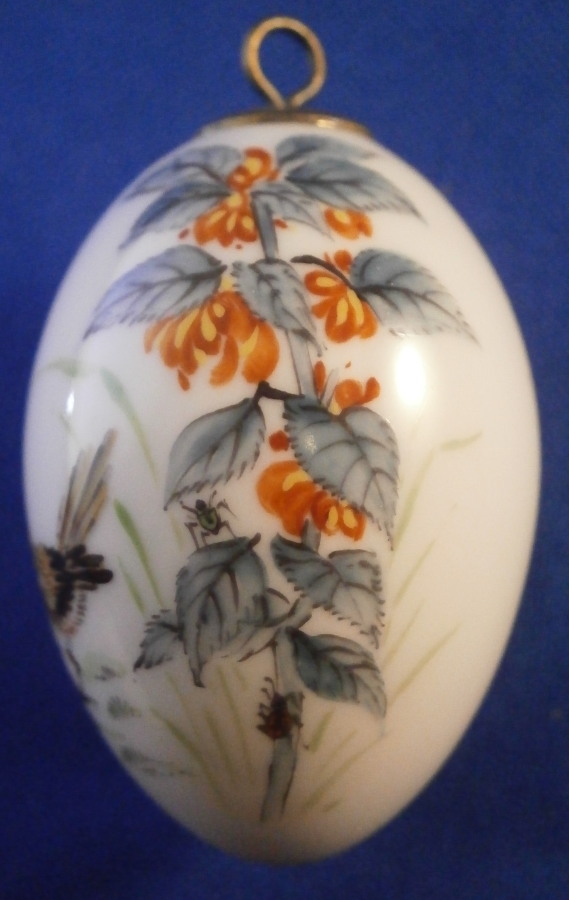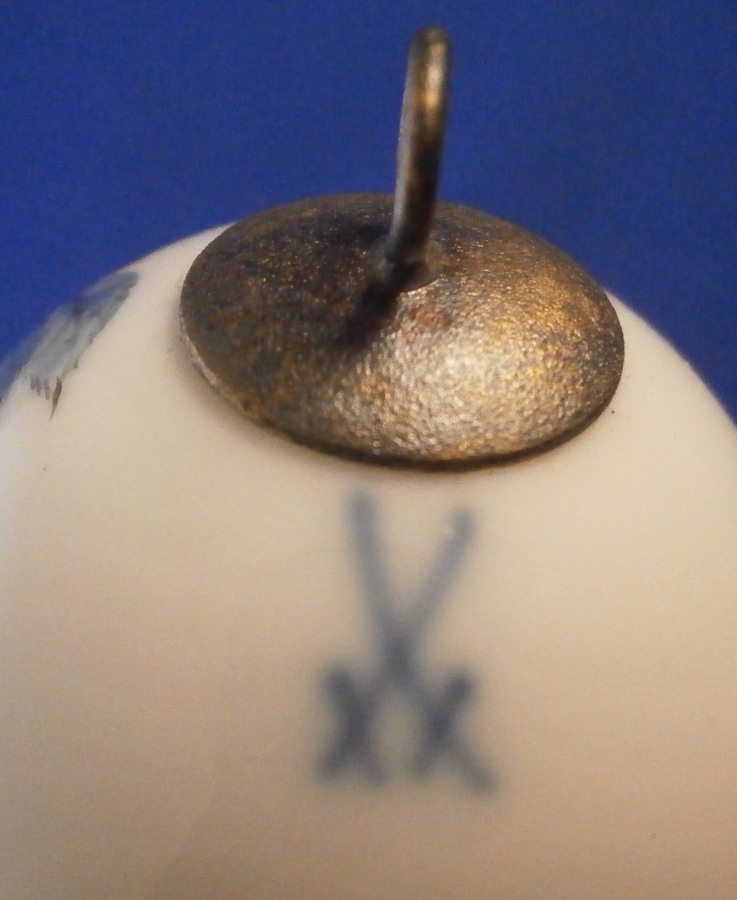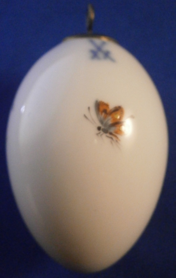 This is a rare easter egg ornament made by Meissen in the 20th century. One sees these little ornaments from time to time but I have not come across this decoration before. The piece is hand painted with a nice design including two birds and a Kakiemon style flower with two little bugs crawling up the stem :) A little butterfly on the other side. Top has a metal piece with a loop attached to it for easy hanging! The piece is in perfect condition and comes with its original box. It is marked with the under glaze blue crossed swords mark (first choice) to the back top as shown. The egg 1.75 inches tall (not including the loop) andabout 1.25 inches in diameter. Please email me for more information or other pictures.