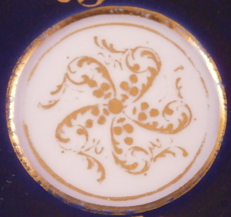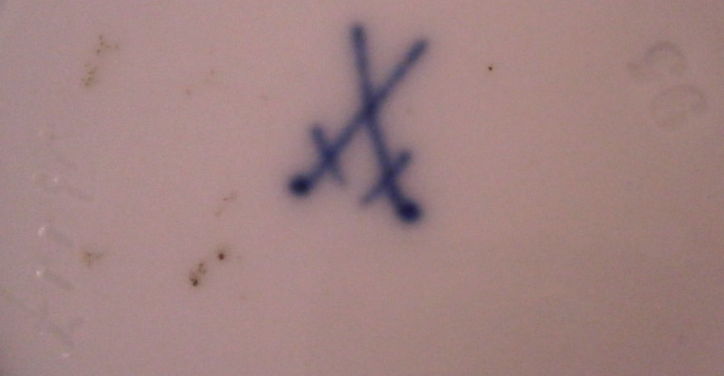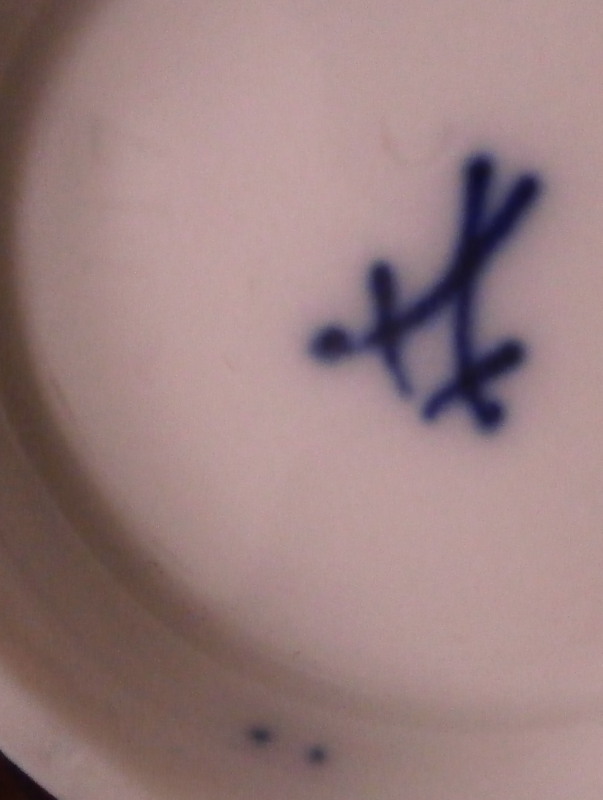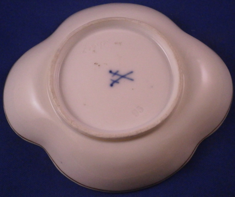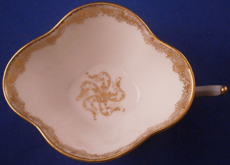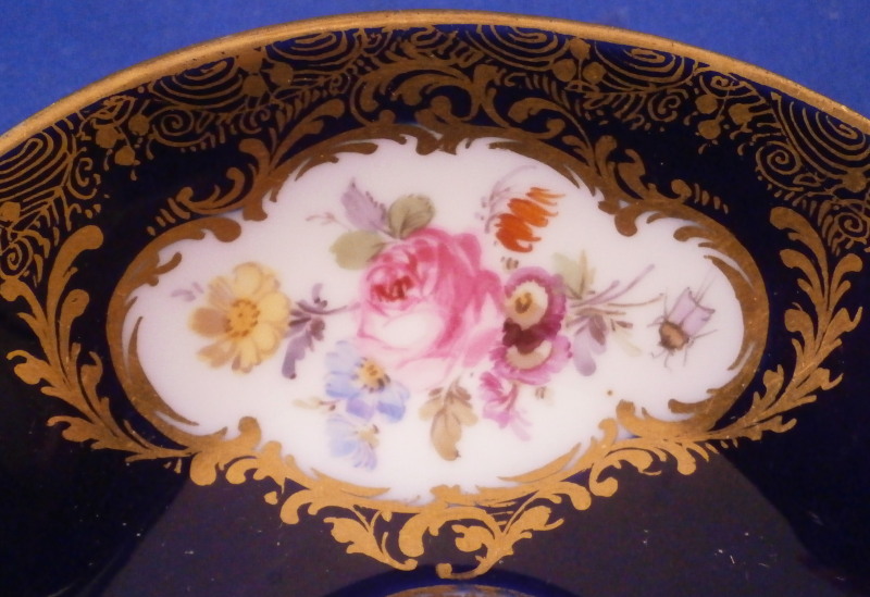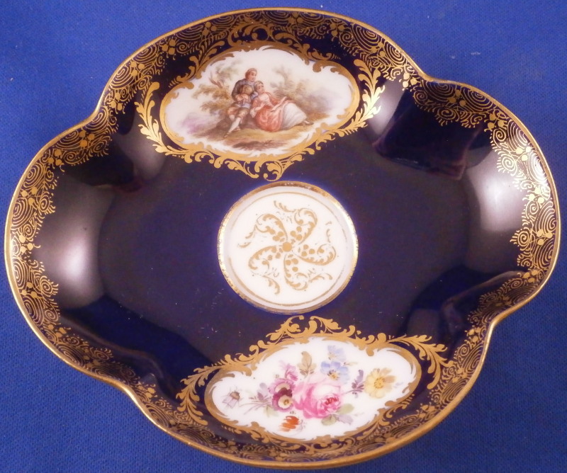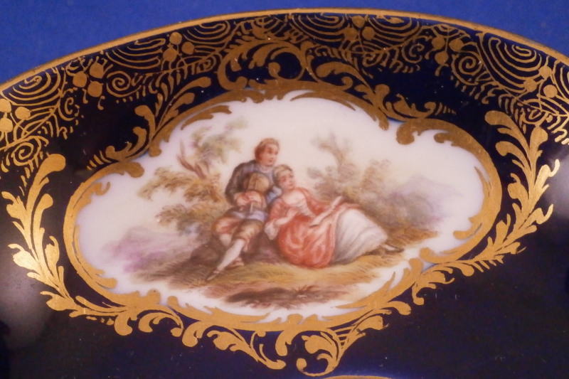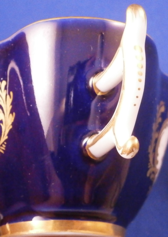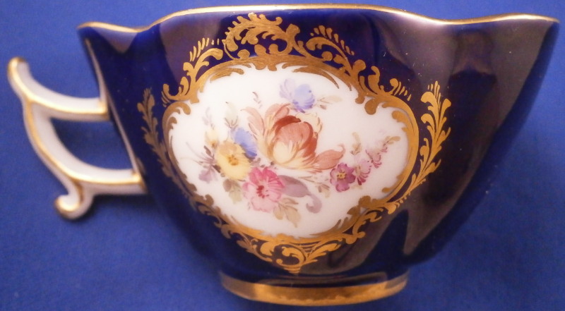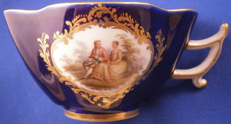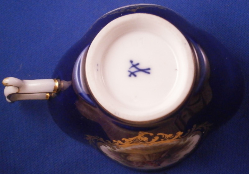 This is a superb quatrefoil shaped cup and saucer made by Meissen in the later 19th century. Smaller than a full sized version but not tiny so likely a child's cup. Each piece is hand painted with a panel with a nice floral arrangement on white ground as well as an amazing Watteau style scene on white ground each being surrounded by some fancy gold trim. The rest of the cup & saucer has a deep cobalt blue ground color and some more fancy gold trim all over. The outside rim of the saucer and inside rim of the cup also has a gold trim to it as shown as does the footring. There is a nice design to the center of the saucer and the inside bottom of the cup. The handle of the cup has a nice shape to it based on a mid 18th century design. The set is in perfect condition with just a tiny bit of wear to the gilding of the saucer well. Both pieces are marked with the under glaze blue crossed swords mark underneath as well as the usual impressed / incised numbers and letters as shown - first choice off course. The saucer is just under 1 inch tall, 4.75 inches wide and 4.25 inches deep. The cup is 1.75 inches tall, 3 inches wide excluding the handle and 2.625 inches deep. Please email me for more information or other pictures.