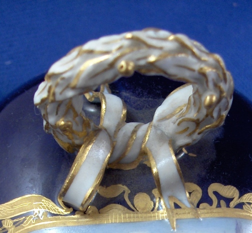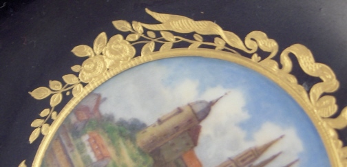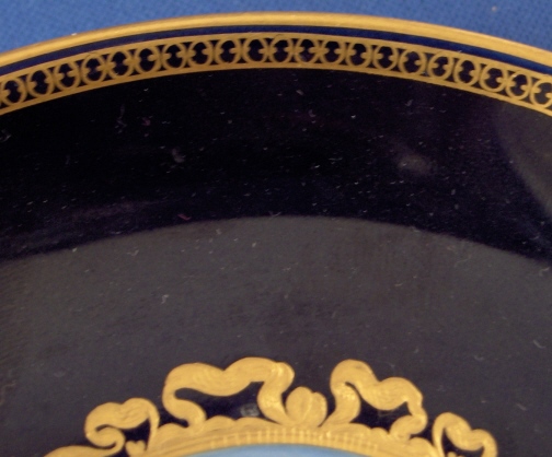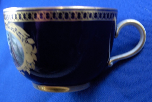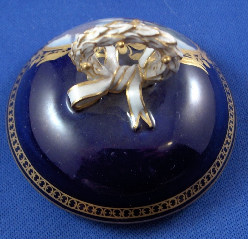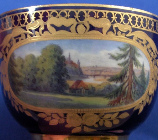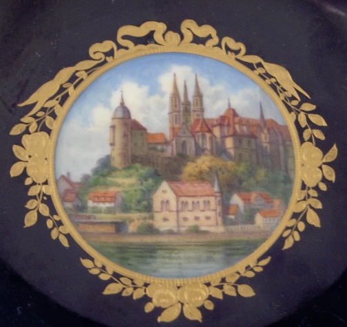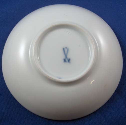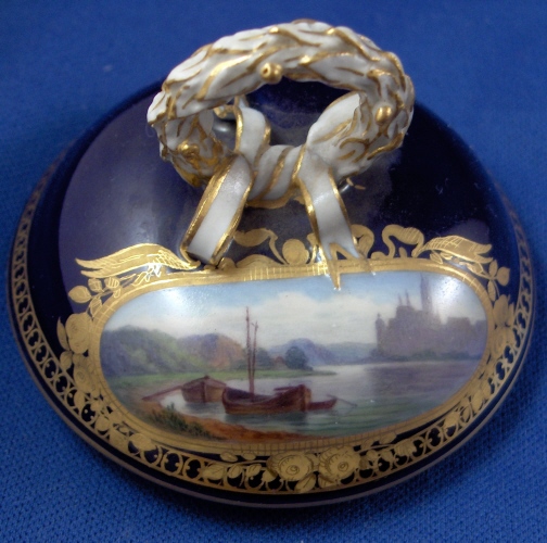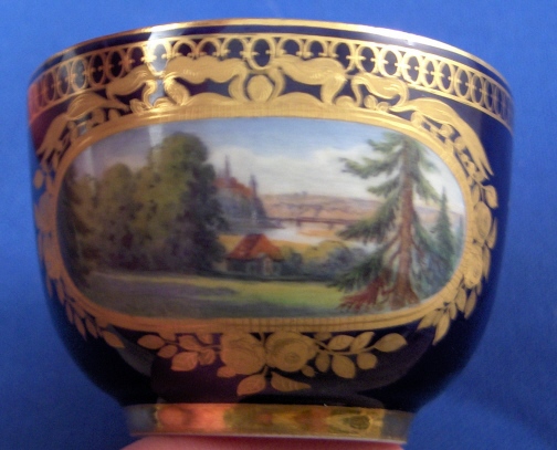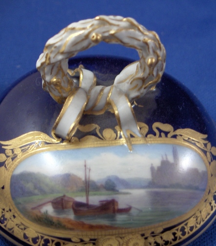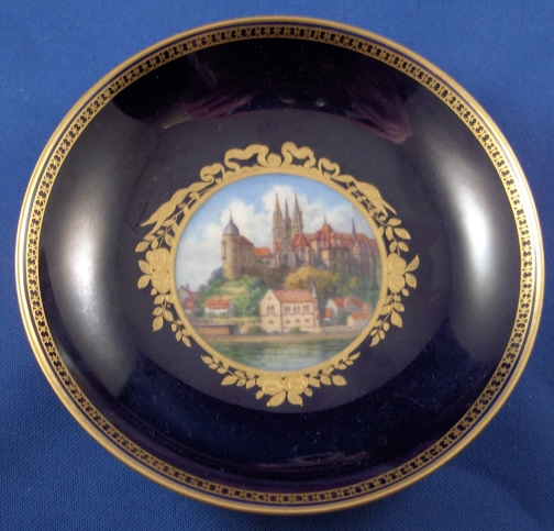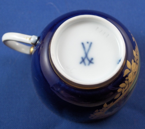 This is a rare lidded cup and saucer made by Meissen during the Pfeiffer period around 1925. The set has a nice cobalt blue ground color and a nice gild design to the rim but the best part is the scene on each piece surrounded by fancy floral gilding. The scene have a touch of Art Nouveau to them especially the one on the cup and the lid. The saucer has a scene of a castle or church by a river on it. Nice detail as one would expect from Meissen. The scene on the cup is more of a forest scene with some building in the background and the one on the lid is with two boats on a river also with some building in the background. This is one superb set and amazingly in perfect condition! The cup and saucer are marked underneath with the underglazed blue crossed swords mark with the dot as well as some impressed numbers and a blue V. which is likely a painters mark. The cup is just over 1.5 inches tall and 2.25 inches in diameter. The saucer is 0.875 inches tall and 4.375 inches in diameter. And the lid is 1.5 inches tall and 2.375 inches in diameter. Please email me for more information or other pictures.