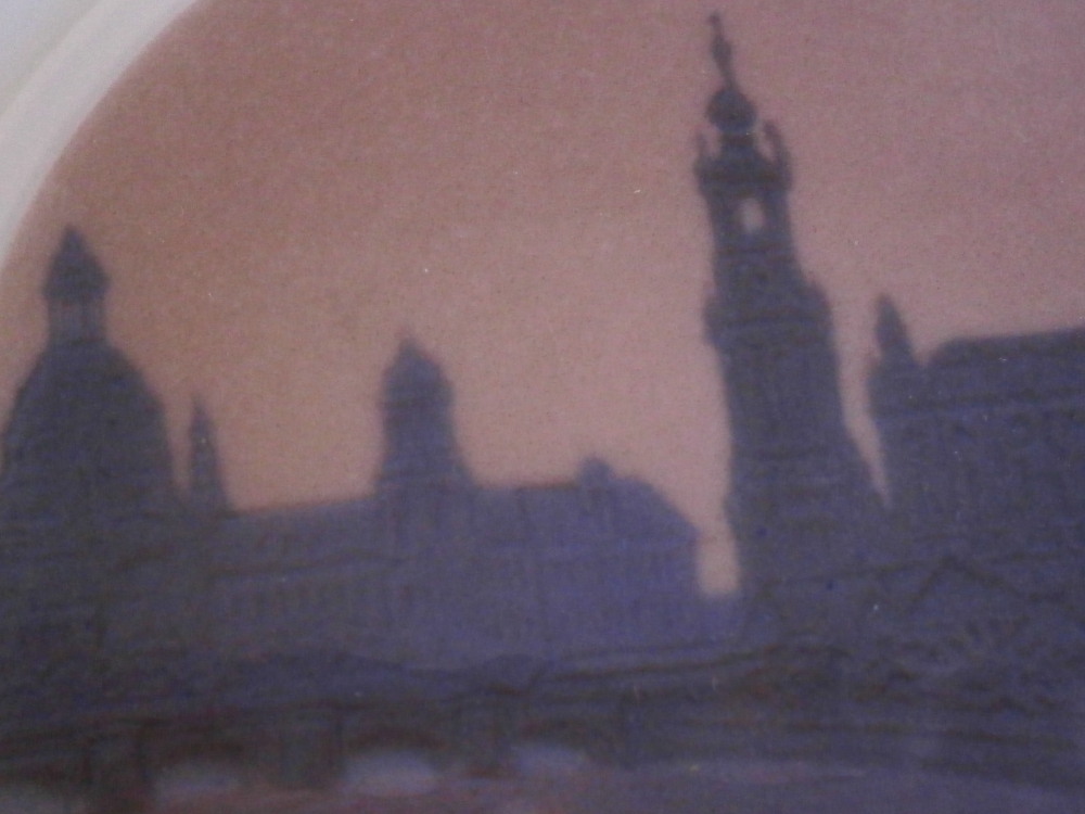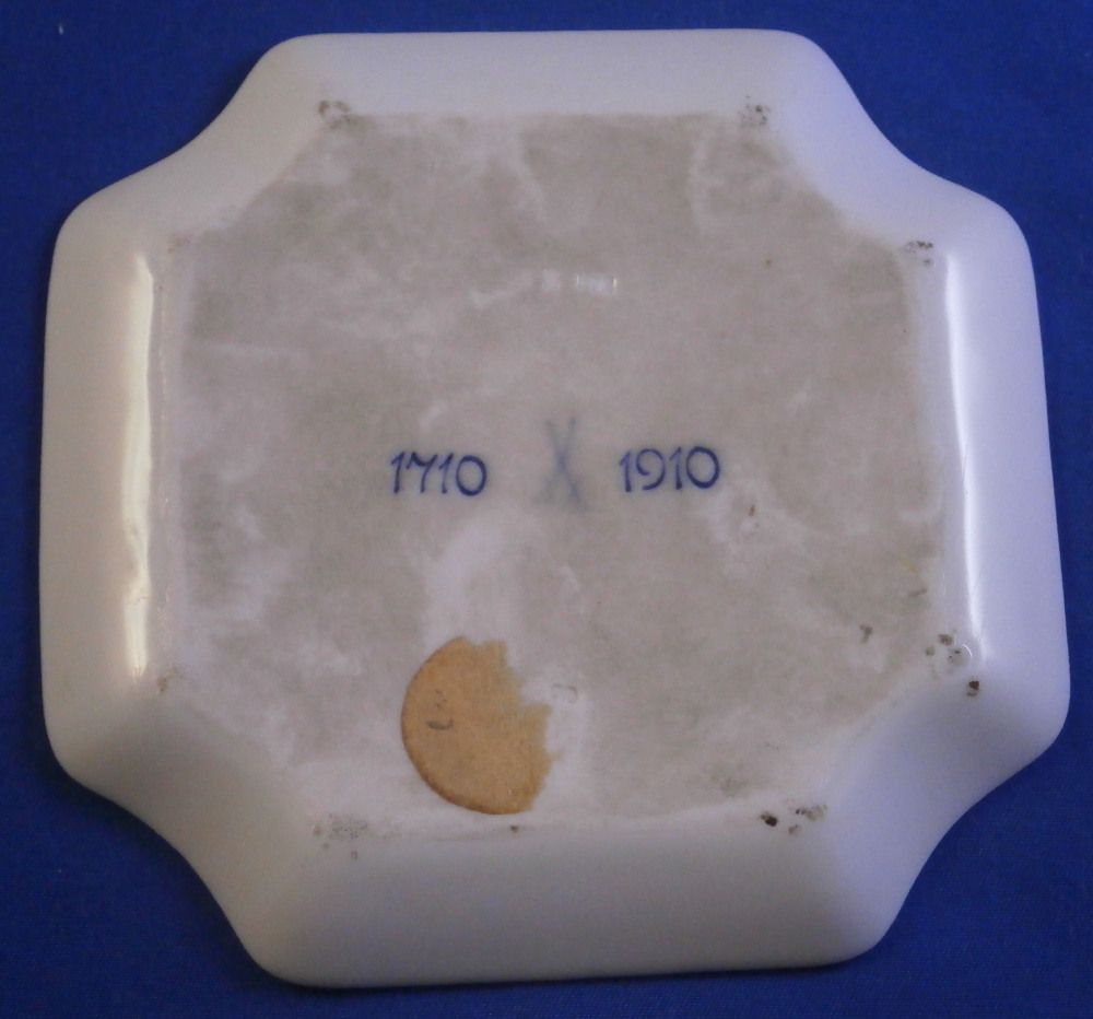 This is a cute little trinket or pin dish made by Meissen in the early 20th century - 1910 to be exact. It was made for their 200 year anniversary. It is rare to find Meissen pieces with under glaze scenes so this is a treat. The scene is hand painted and of the famous Albrechtsburg - the site of where Meissen porcelain started. Nicely done and like I said the under glaze painted pieces are hard to find. Very much in the Art Nouveau / Jugendstil taste of the period. The piece is in perfect condition. It is marked with the under glaze blue crossed swords mark underneath with the year 1710 and 1910 next to it. It also has some impressed numbers as shown. The dish is just over 0.25 inches tall and about 4.25 inches wide and deep.4.625 inches at the diagonal. Please email me for more information or other pictures.