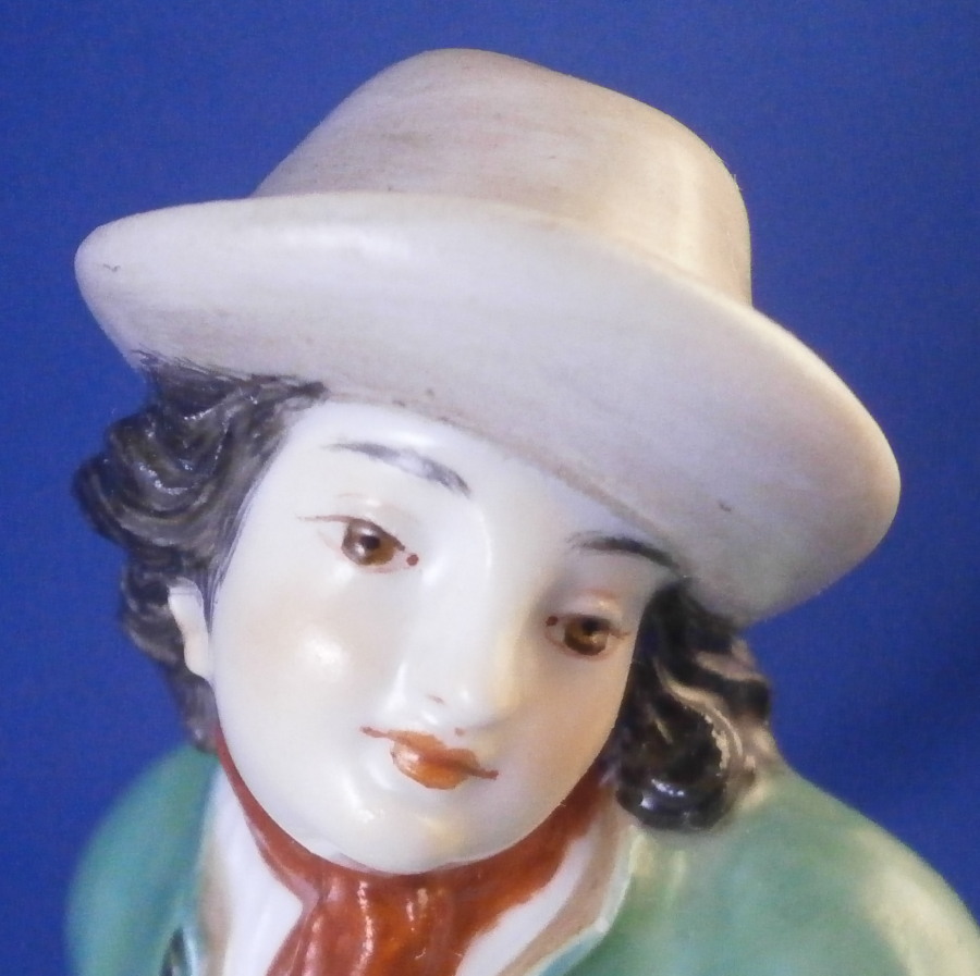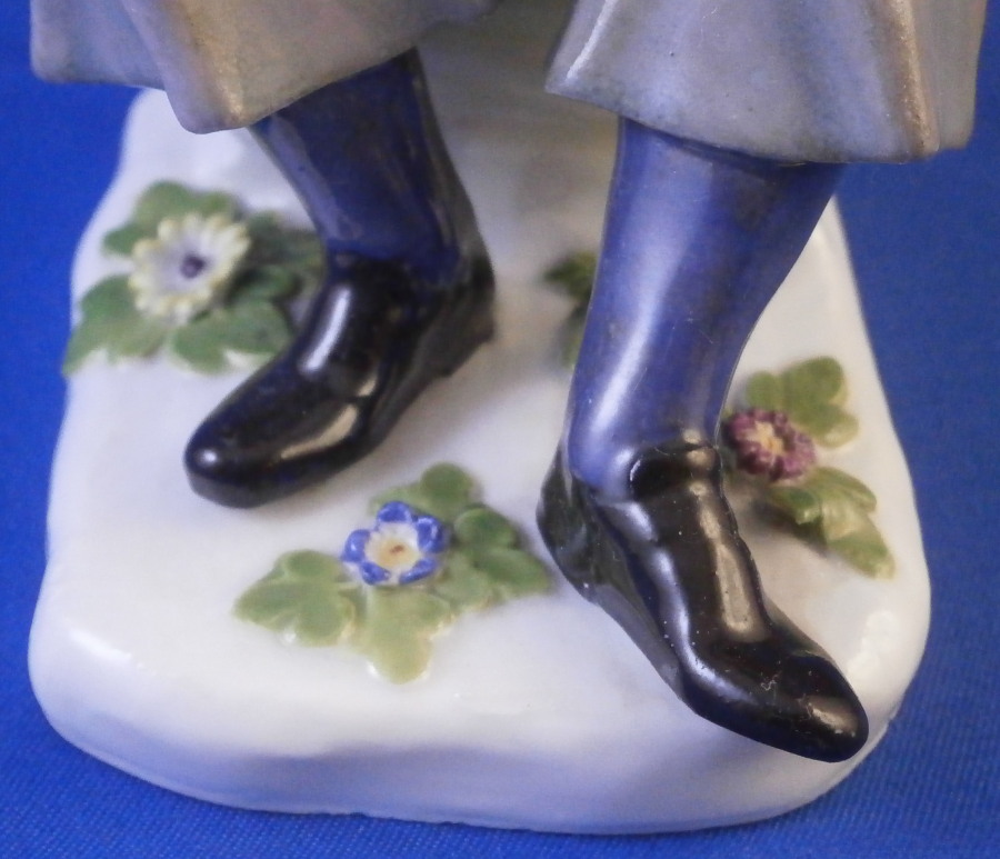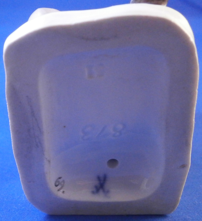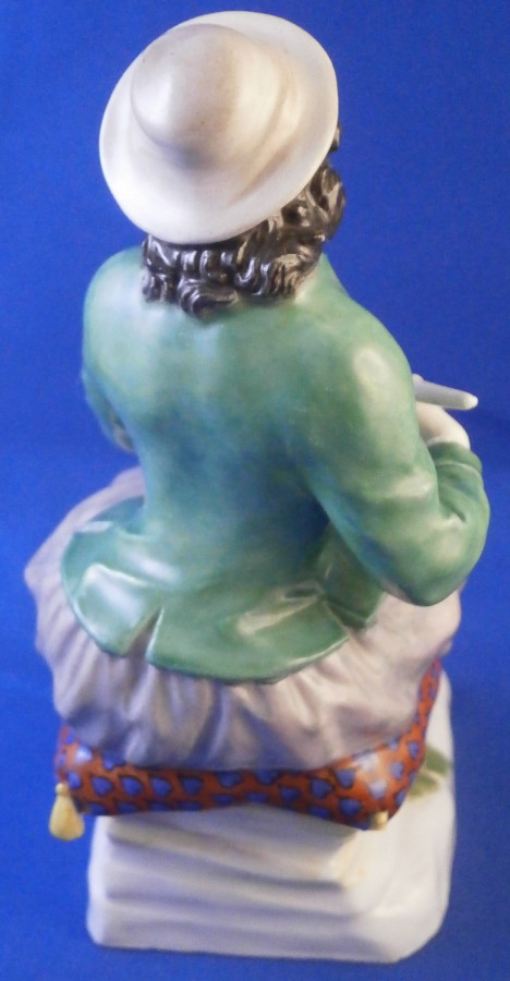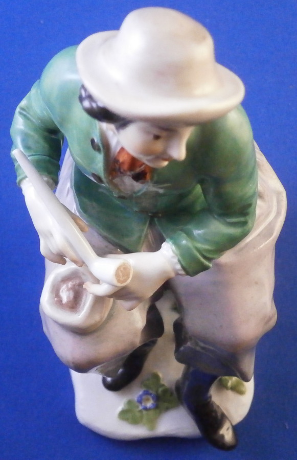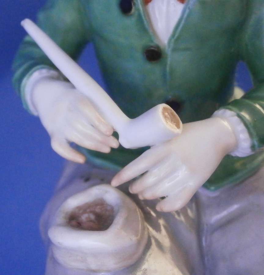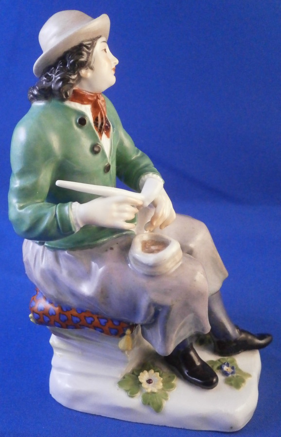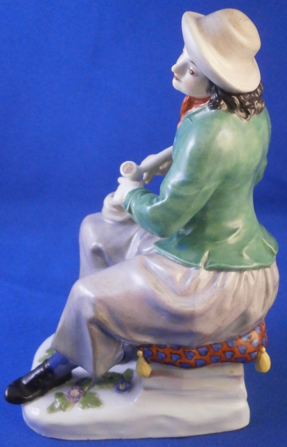This is a figurine made by Meissen in the late 19th or early 20th century. It is of a Dutchman sitting on a nice pillow prepping his pipe for a nice smoke. He is dressed in a fancy outfit and the base has a couple of nice flowers to it. it's a great looking piece one does not come across very often. Off course it was first modeled in the 18th century. Nice design and hand painted to perfection as one would expect from this maker. The figure is in great condition with one of the tassels on the back corner of the pillow chipped off. Not obvious when on display and the piece looks amazing!The figure is 5 inches tall, 2.125 inches wide and 3.25 inches deep. It is marked underneath with the under glaze blue crossed swords mark as well has the usual impressed and painter's marks as shown. Please email me for more information or other pictures.