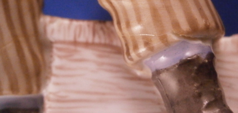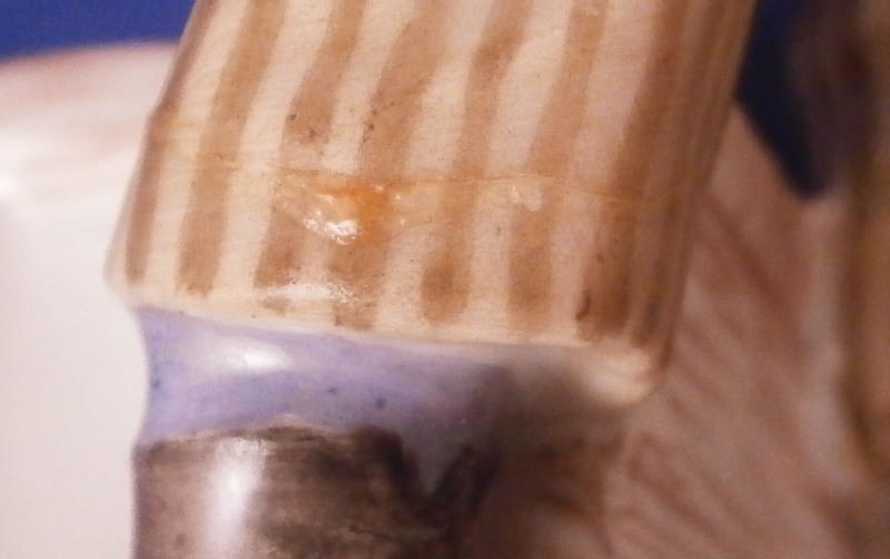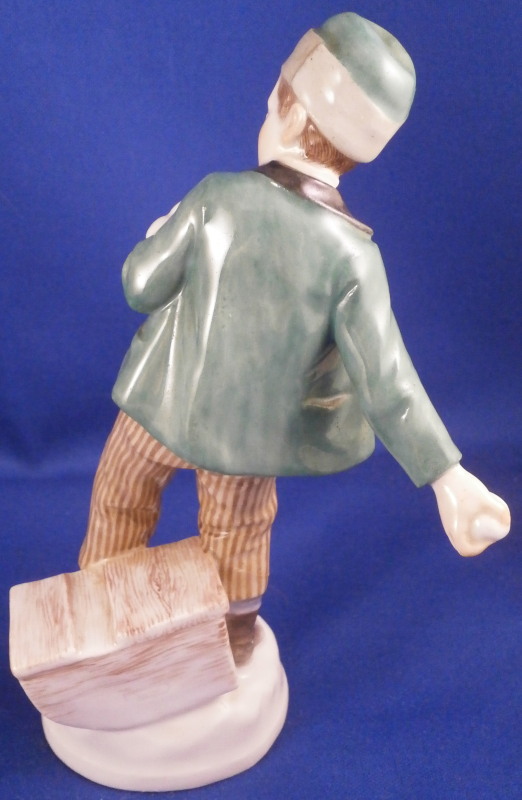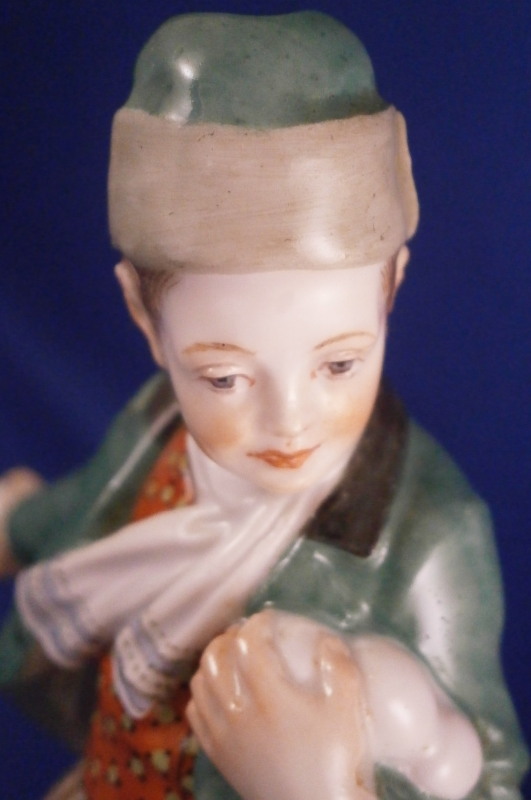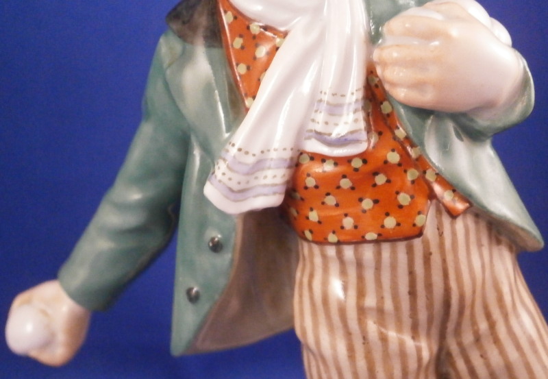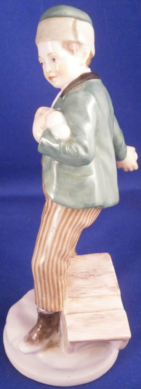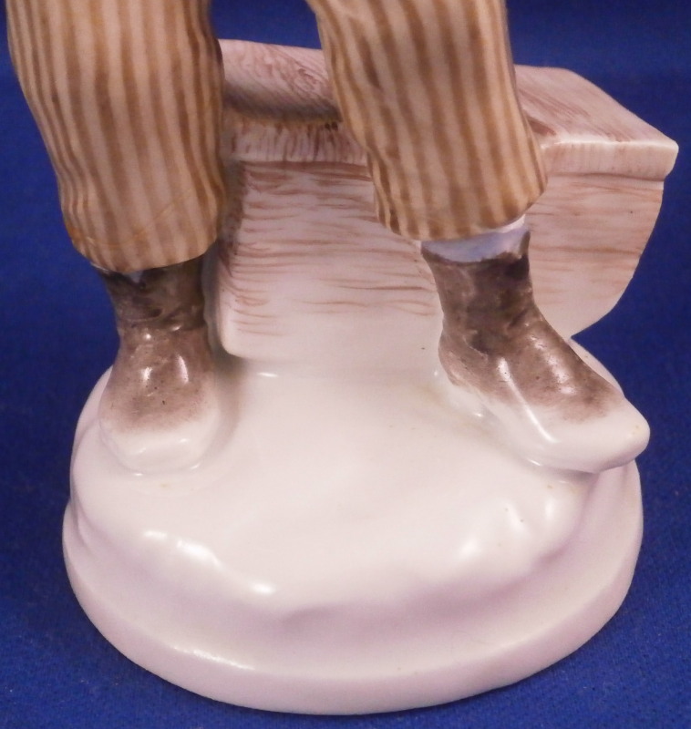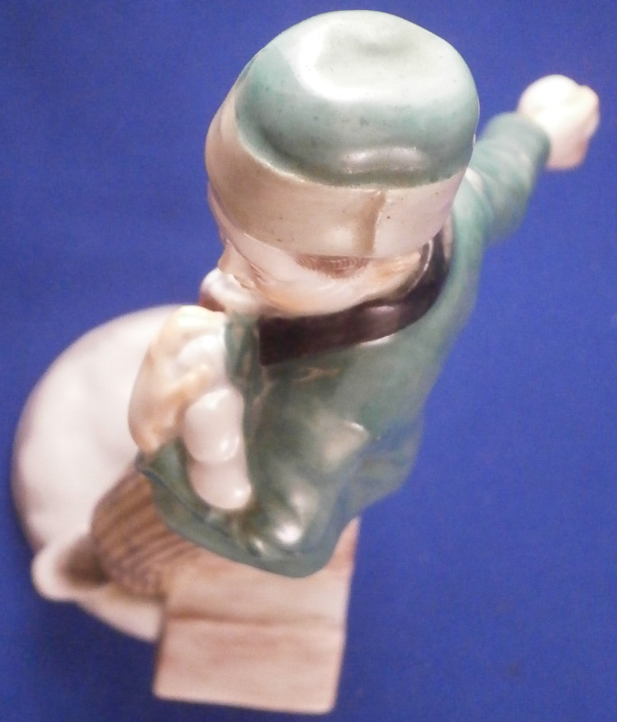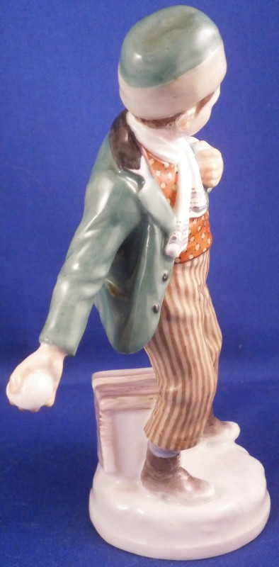 This is a figurine of a boy throwing snowballs at the frightened little girl I also have on the site made by Meissen in the 1920s during the Pfeiffer period. Originally modeled by Alfred König in the early 20th century it is officially called snwoball launcher and the counter part to the frightened girl figure . Sounds a bit like my kids except my daughter would be more likely to pummel my son after a while :) The boy is nicely dressed with striped pants, a colorful vest and a green jacket with a scarf wrapped around his neck and a hat on his head. He has his right arm stretched out with a snowball in his hand ready to launch it with three more balls in his left hand ready to go. A wooden slay / sled behind him on a snowy base. The piece is 5.5 inches tall, 3.5 inches wide and 2.25 inches deep. The figure is marked with the under glaze crossed swords mark with the dot between the top ends underneath the base as well as the usual impressed and incised marks as well as a painters mark 17. in red as shown. The figurine displays perfectly but sadly has been broken through the legs right about at the height of the sled as shown. Impossible to spot unless you have it right in front of your eyes. Please email me for more information or other pictures.