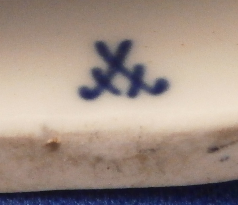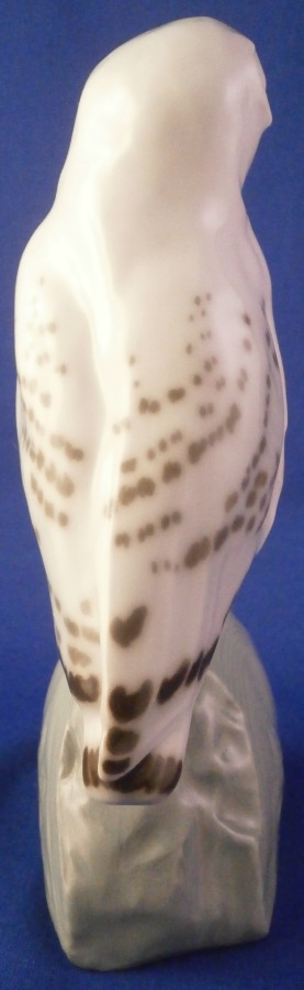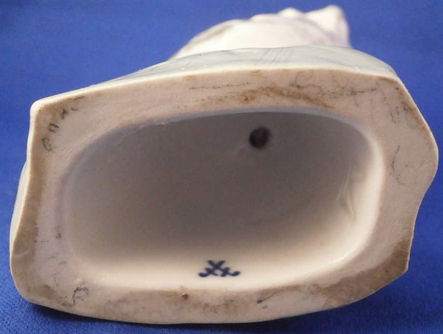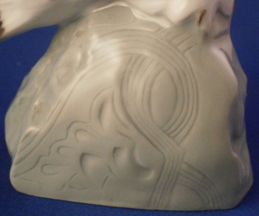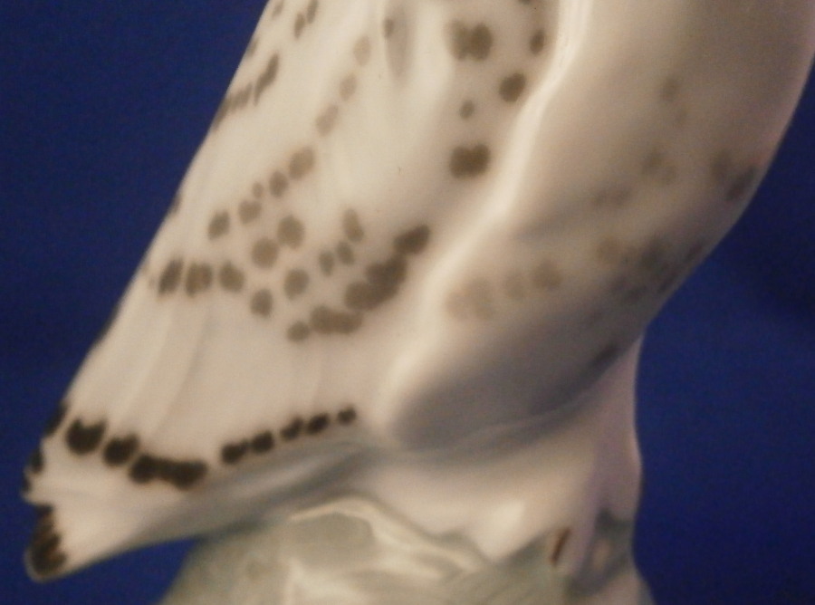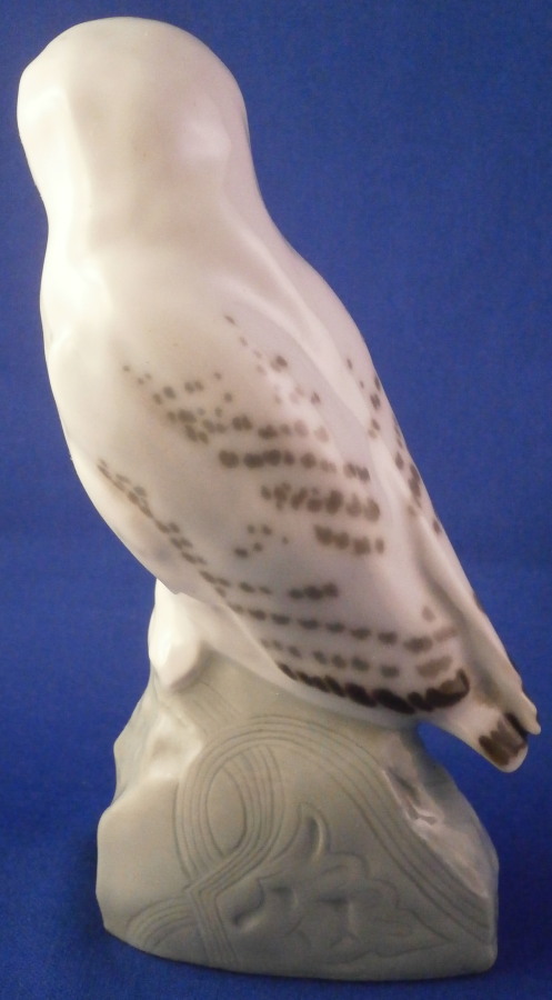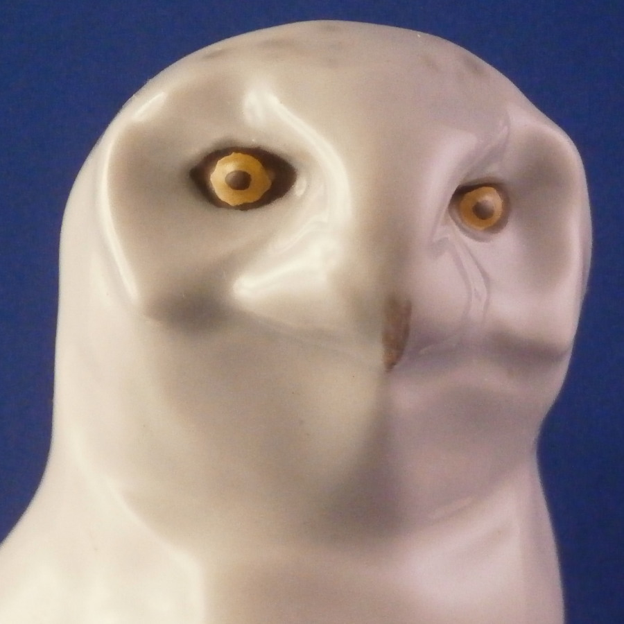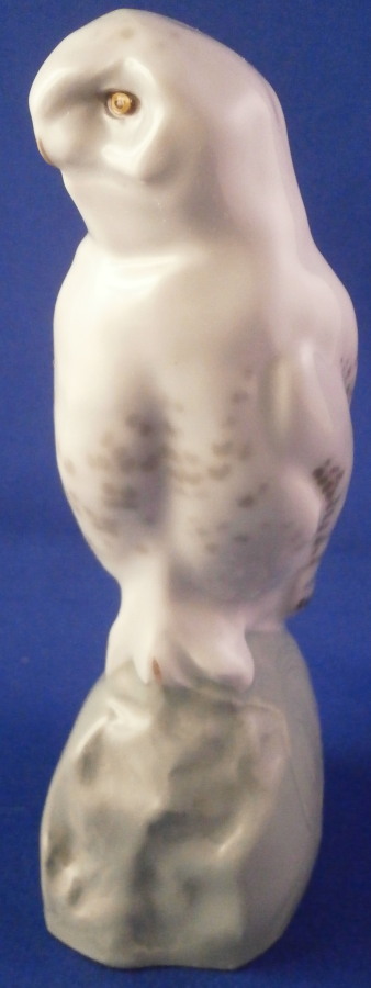 This is a really nice figurine of a snow owl made by Meissen in the late 19th or early 20th century. I think this type of owl has many names - snow owl / polar owl / arctic owl / white owl but either way is is a really nice figurine decorated in their rare under glaze colors from around 1900. It was designed by Hermann Fritz but I am not sure of the exact date this was first modeled. It is very well modeled with lots of details and hand painted perfectly. The owl is sitting on a green rock with an interesting Art Nouveau / Jugendstil design to sides. N The figure is in perfect condition! It is marked underneath with the under glaze blue crossed swords mark (first choice) as well as the model number, a painter's mark and another incised number as shown. The piece is 5.25 inches tall, 1.625 inches wide and 2.75 inches long. Please email me for more information or other pictures.