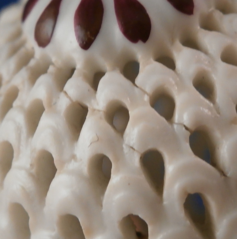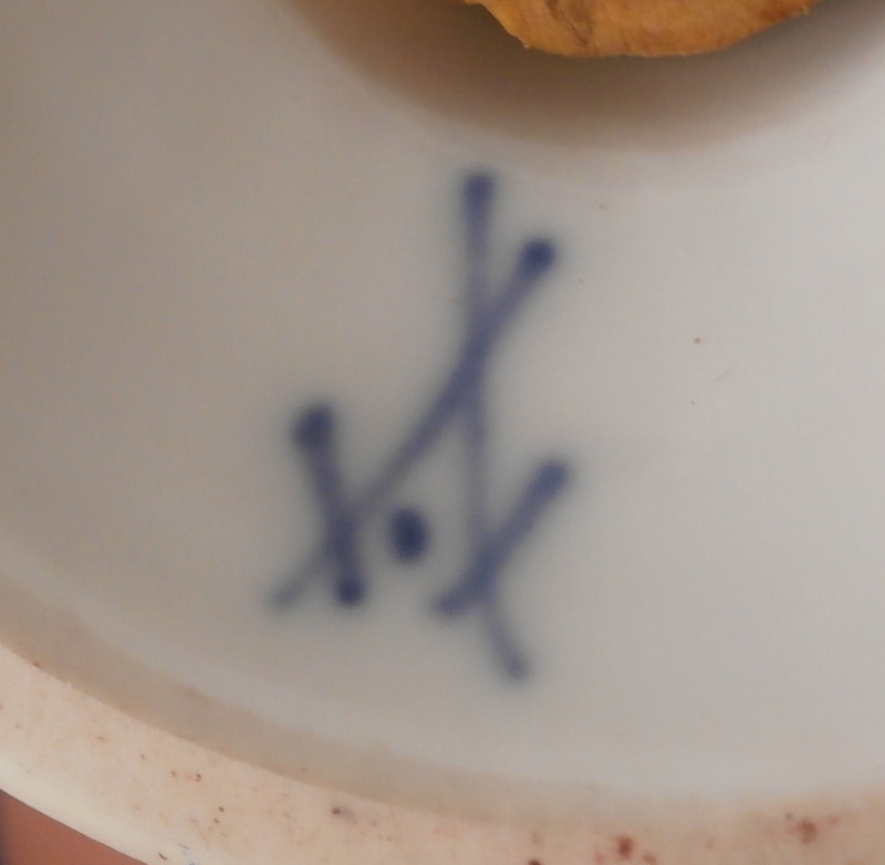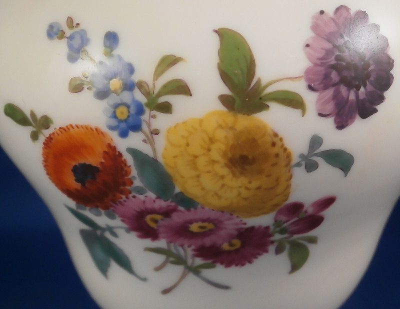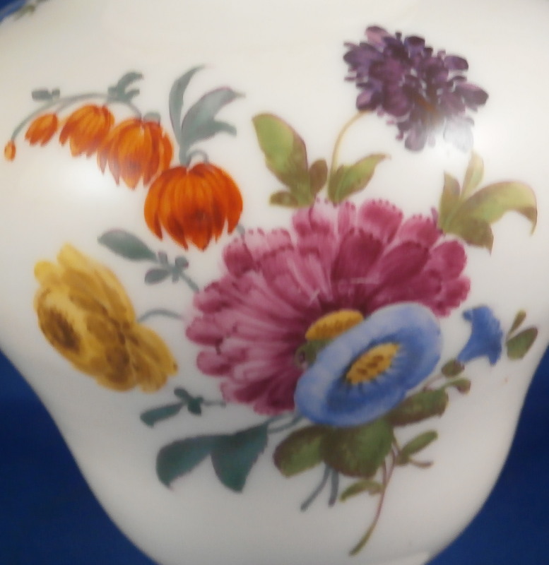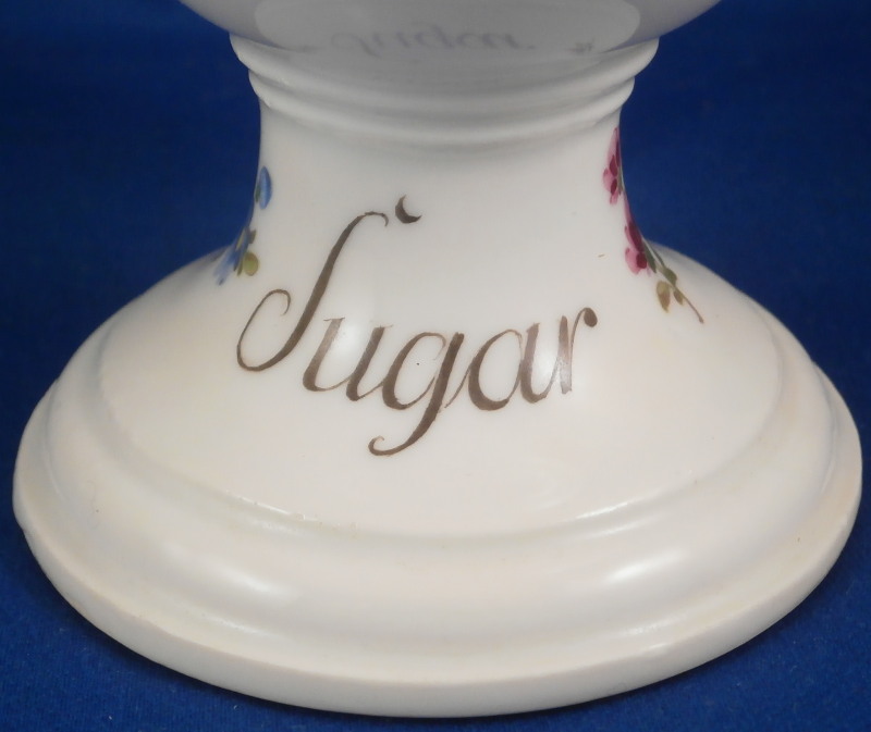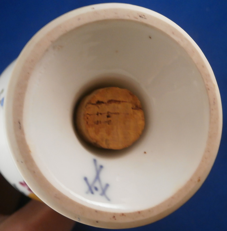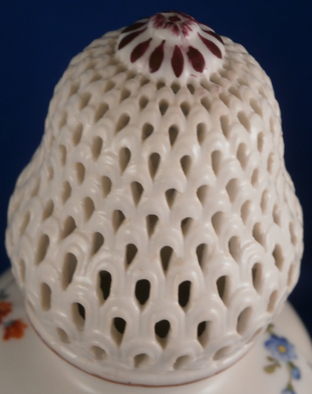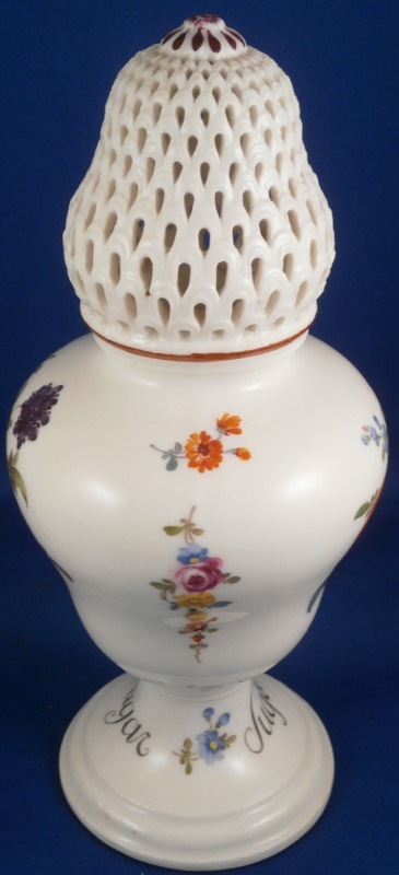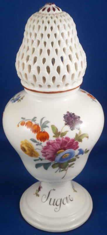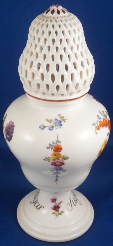 This is a fun sugar shaker / caster / muffineer made by Meissen in about 1765 during the dot period. It is rather large with a two large nice hand painted floral arrangements as well as some smaller single flowers and a little floral garland to either side along the mold line. A bit of nice trim to the very top and where the shaker part and the main body meet. An amazing reticulated top for the sugar to pour out of and amazingly the word sugar twice on the foot with flowers in between. So obviously a very early export piece! Not something one sees often from Meissen especially since there rarely is writing on porcelain :) This piece does have a very decorative shape. It is in amazing condition with some minor crack to the top in one area that appear from the making. The cork that is being used is obviously a newer replacement which is to be expected. The piece is marked with the underglaze blue crossed swords with the dot between the bottom. It is just under 6.75 inches tall and 3 inches in diameter. Please email me for more information or other pictures.