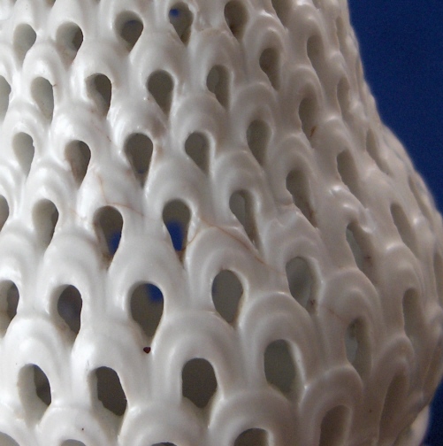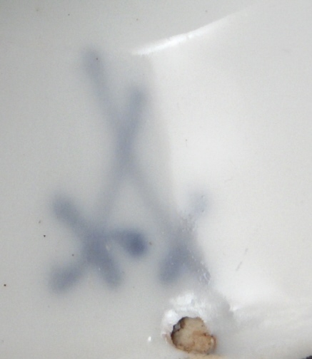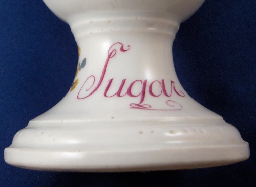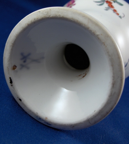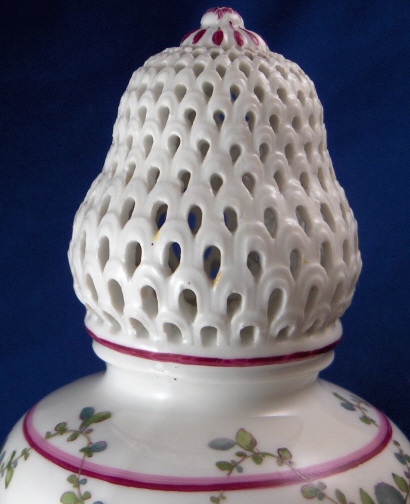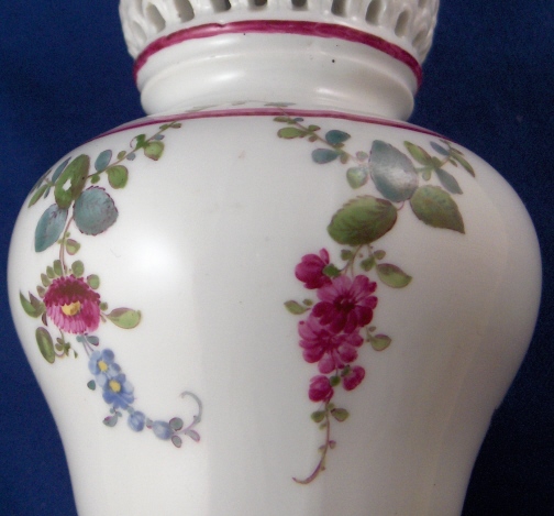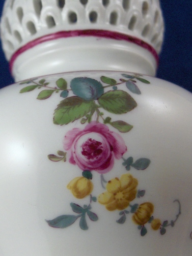 This is a very rare sugar shaker / caster / muffineer made by Meissen in about 1765 during the dot period. It is rather large with a superb design of floral garlands all around with a puce trim, a puce top design, an amzing reticulated top for the sugar to pour out of and amazingly the word sugar twice on the foot with flowers in between. So obviously a very early export piece! Not something one sees often from Meissen especially since there rarely is writing on porcelain :) This piece does have a very decorative shape. It is in amazing condition with some stained cracks on one small part of the reticulated top though it is stable and fairly meaningless. One leaf has a paint flake and there are tiny glaze flaws on the foot normal to the early wares. So all in all as good as it gets! The cork that was originally in the bottom is long gone which is no big deal. The pot is marked with the underglaze blue crossed swords with the dot between the bottom. The piece is just under 7 inches tall and 3 inches in diameter. Please email me for more information or other pictures.