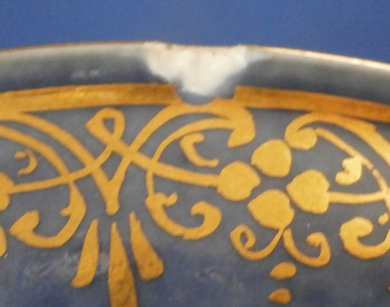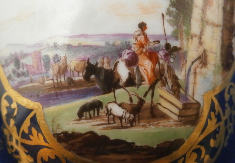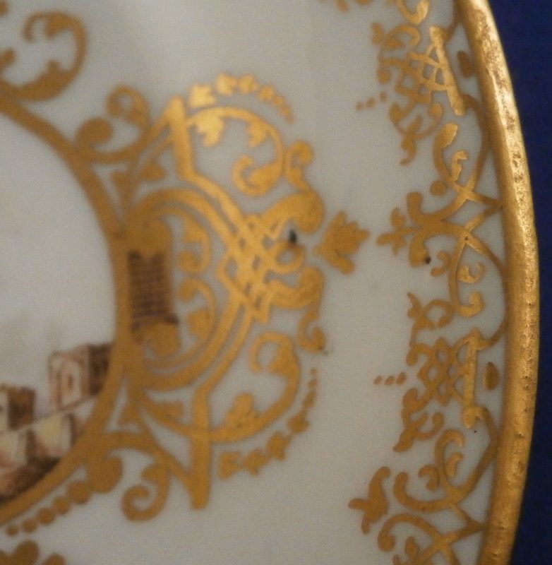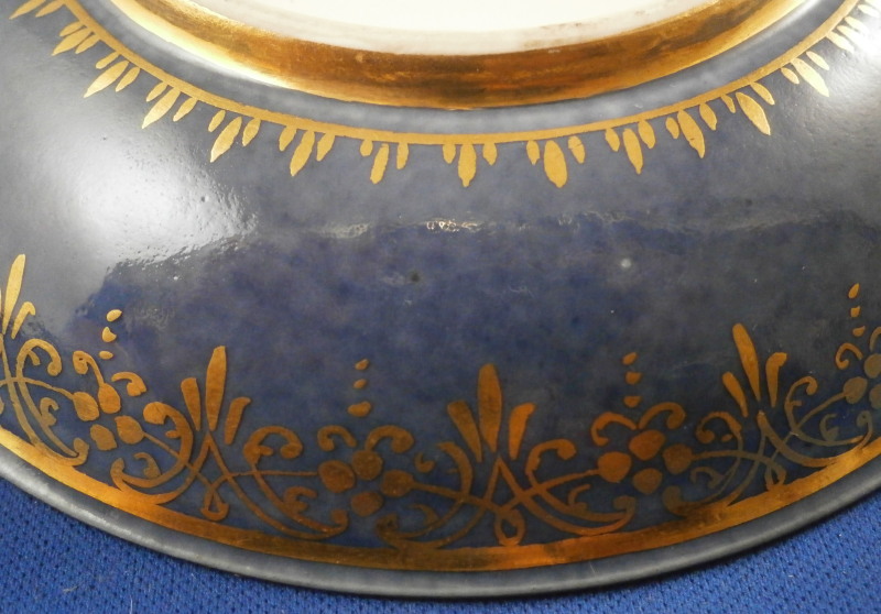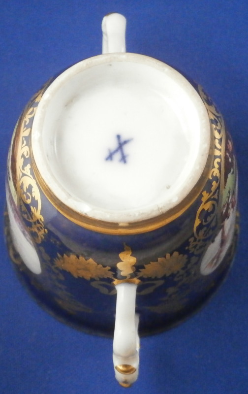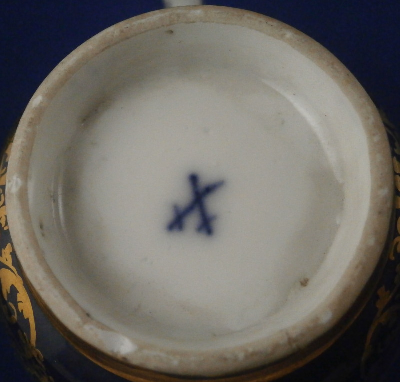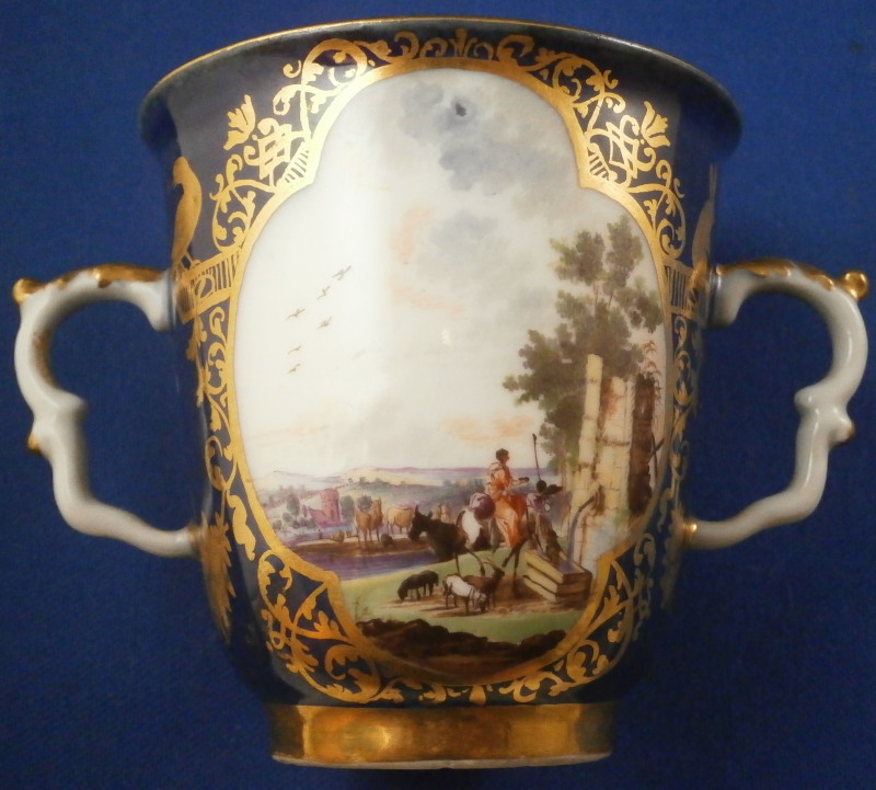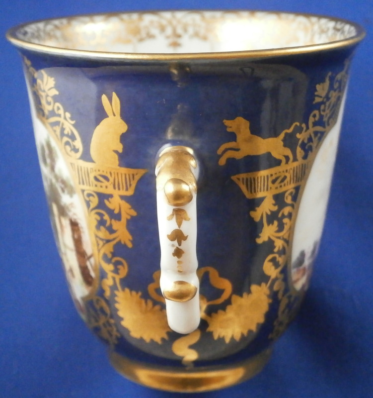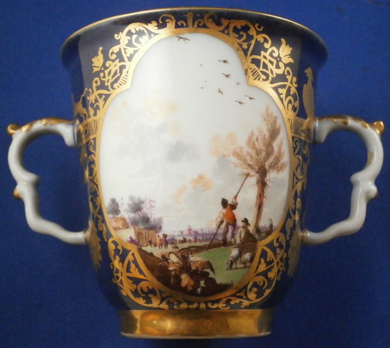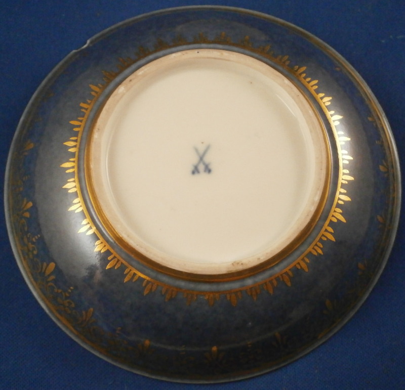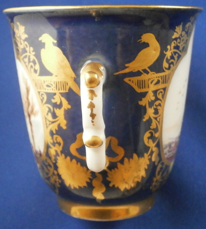 This is an amazing and very early double handled blue ground beaker cup and saucer made by Meissen in about 1735. Both pieces are hand painted with superb harbor type scenes - one on the saucer and two to the cup as well as this superb mottled blue ground color and some of the nicest gilding you can find by them. The scenes painted by Christian Friedrich Herold one of the top painter's of this period. Each scene is surrounded by elaborate gold scrolling that even includes animals like a dog, rabbit and two birds on the cup and a monkey and a bird on the saucer. The beaker has double scroll type handles with a bit of gold trim to them. The saucer has the famous Böttger luster panels the animals / flowers sit on top of. More gold trim to the inside edges as shown. Hard to describe something this elaborate and fancy - the set is stunning for sure! The cup is absolutely perfect, the saucer has some extremely minor wear to the center though it is about as perfect as you can find in that respect but has a small rim chip that would be an easy fix. It displays superbly as is. Some manufacturing flaws normal to these early pieces. The cup is 2.875 inches tall and has a diameter of 2.75 inches. The saucer 1 inch tall and has a diameter of 4.75 inches. Each piece is marked with the under glaze blue crossed swords mark from this period underneath. No numbers yet as they started being used later. Please email me for more information or other pictures.