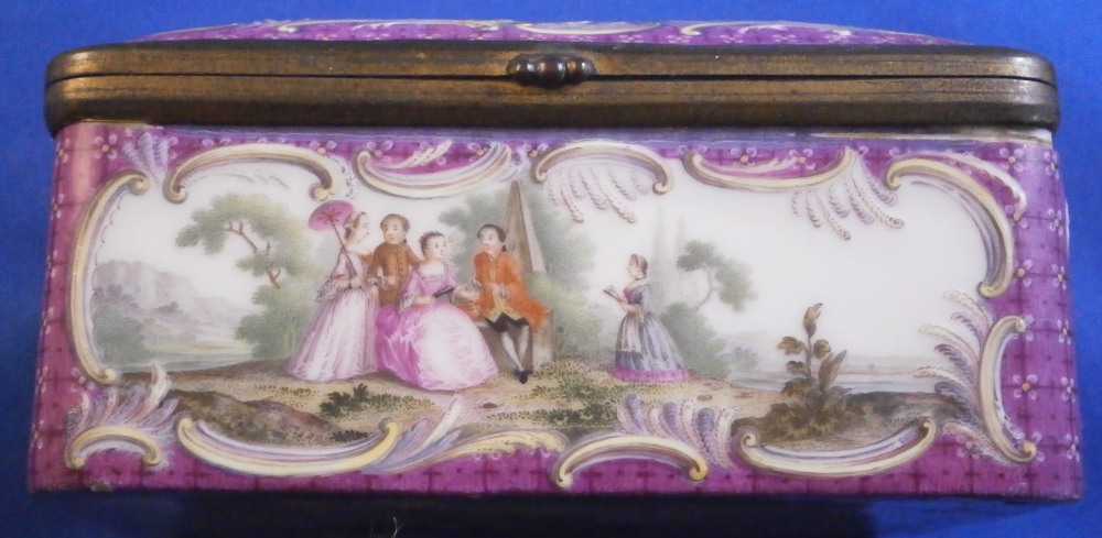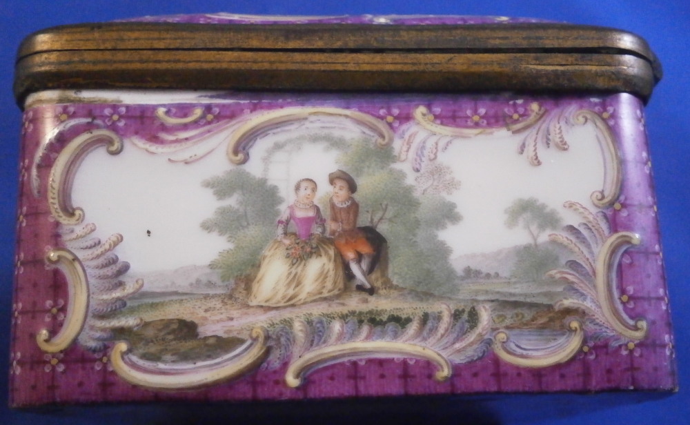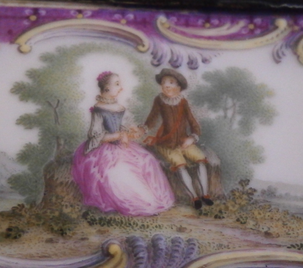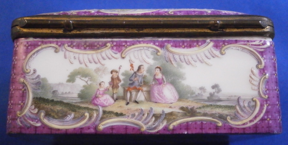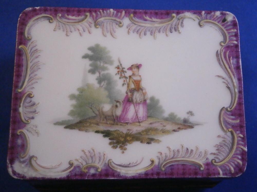 This is a really superb snuff / patch / pill / tabatiere box made by Meissen around 1750. This is a really nice example in terms of the painting. It has seven hand painted nice quality scenes on it as well as some nice relief scroll work plus this amazing puce trim to fill in the areas that are usually white. Most scenes include multiple people and all are in a landscape surrounding. Only the scene on the udnerside has a single shepherdess with its sheep in it. The mounts are brass and they still work perfectly. The quality of the scenes is superb! The box is in good condition - The bottom has no real issues except a little wear to the underside corners and a tiny chip to the edge. The lid sadly has been broken in half and was restored at some point. Hard to spot on the inside but could use a quick redo to bring it back to perfection! On the outside / top it is visible as a dark line but a decent restorer could make it look perfect again. It's a clean break with almost no dmage to any paint. The box is not marked which is normal but the piece speaks for itself. The snuff box is about 1.625 inches tall, 3.375 inches wide and 2.625 inches deep so a very nice size. Please email me for more information or other pictures.